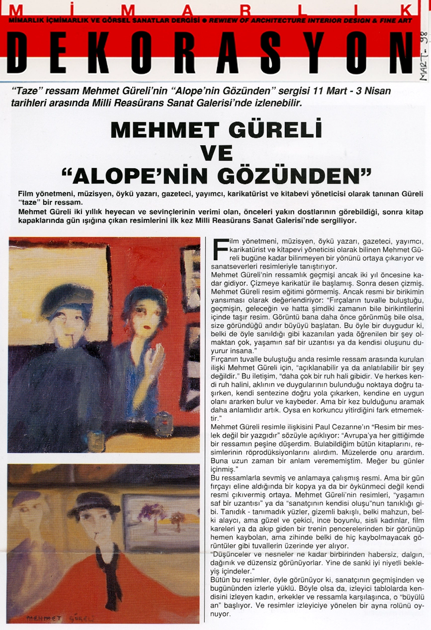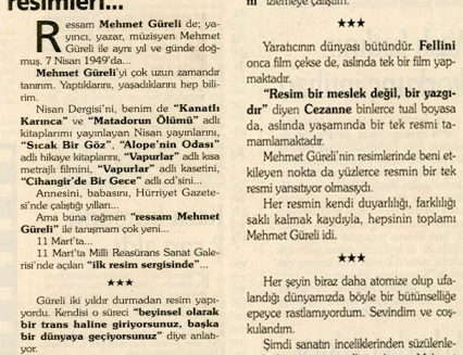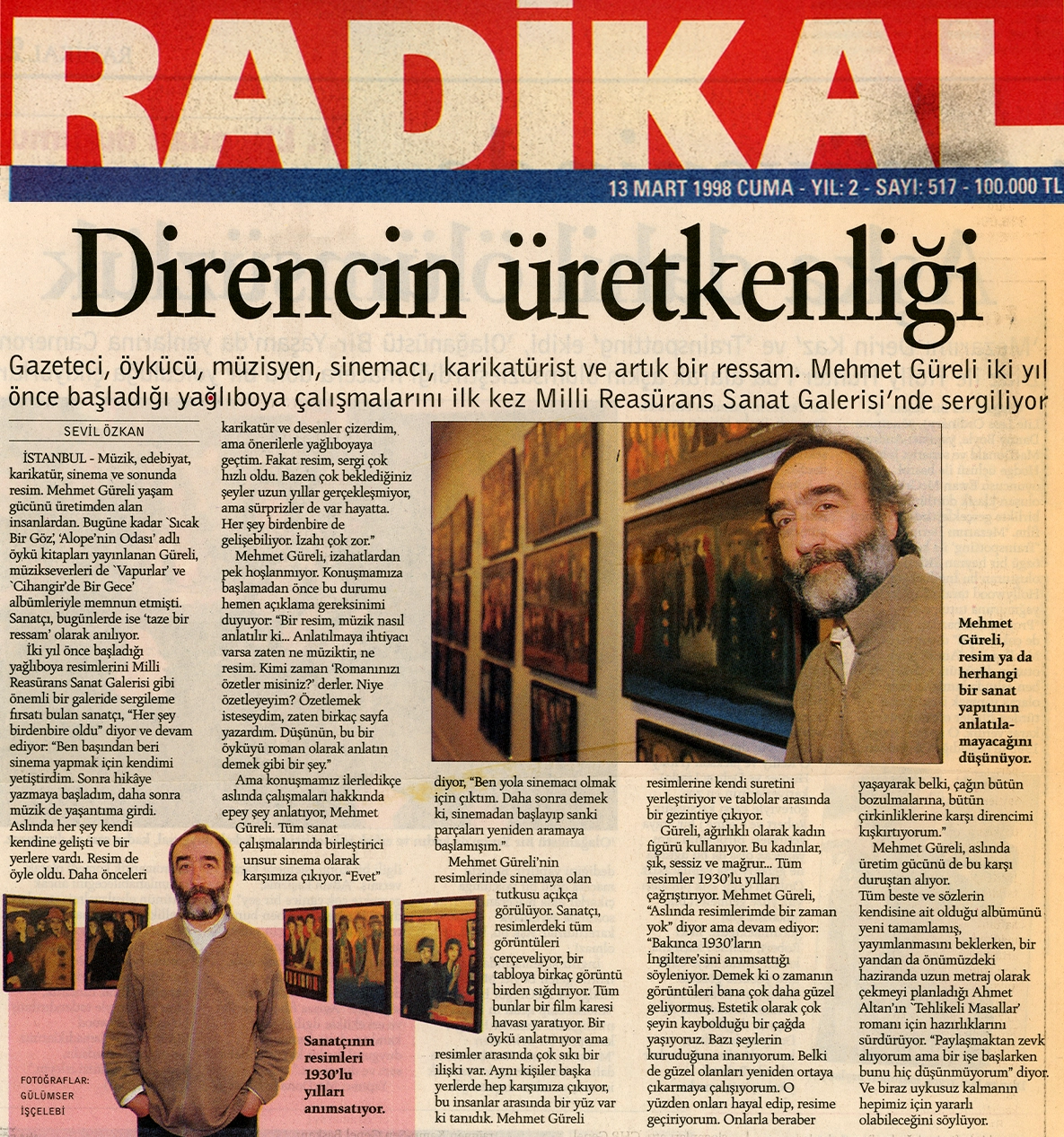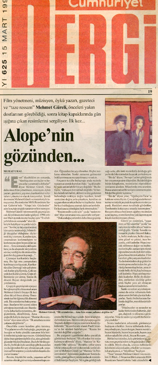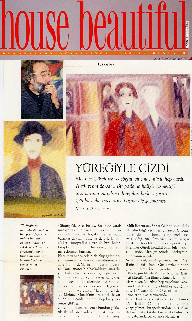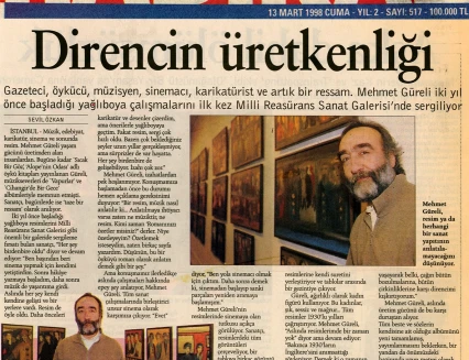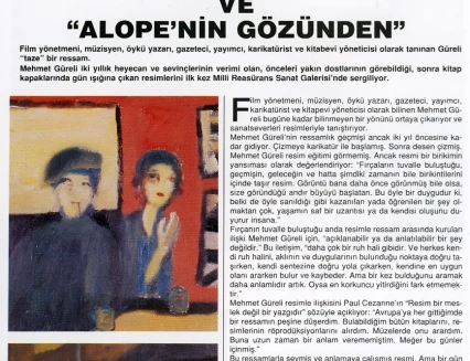 Known as a film director, musician, short story writer, journalist, publisher, caricaturist, and bookstore manager, Güreli is a "young" painter. The paintings, the product of two years of excitement and joy, initially seen by close friends and later seen on book covers, are being exhibited for the first time at the Millî Reasürans Art Gallery.