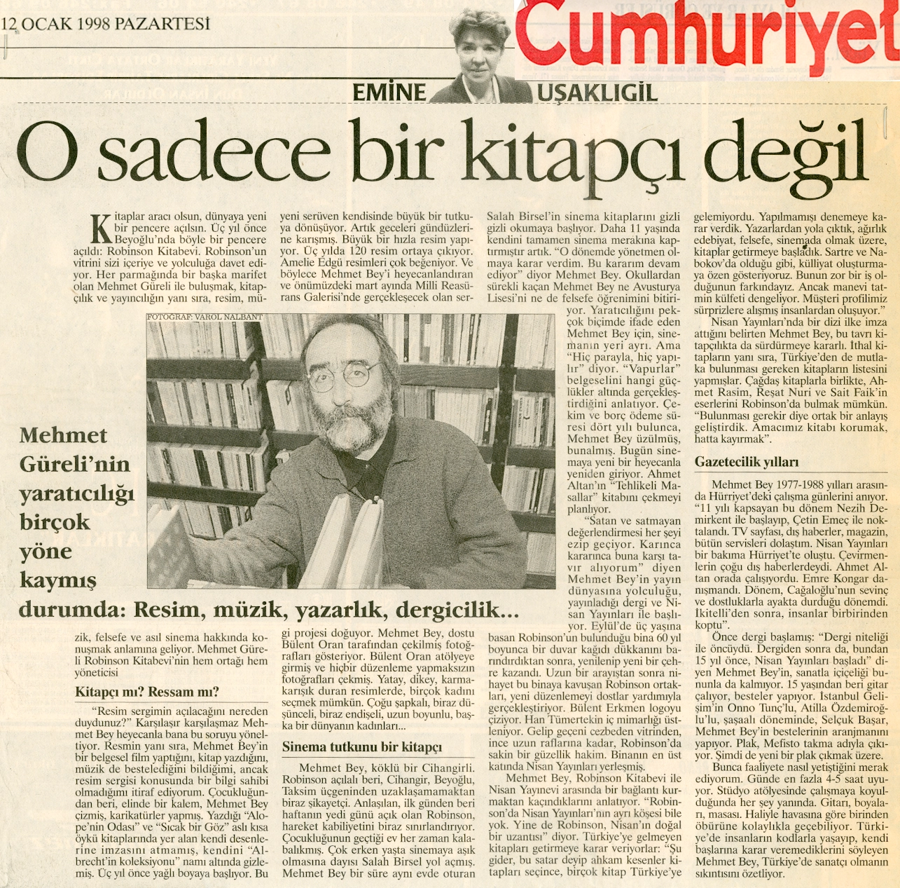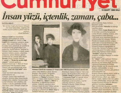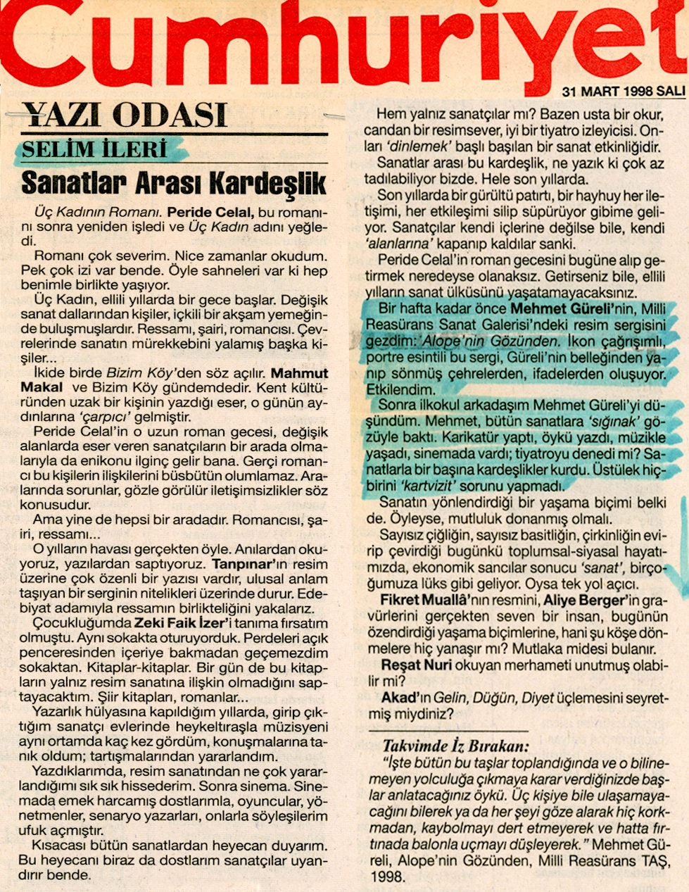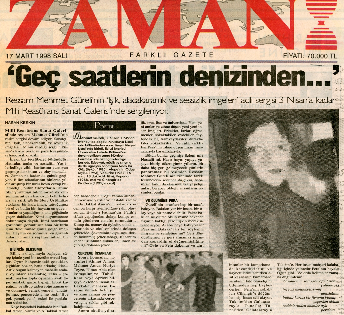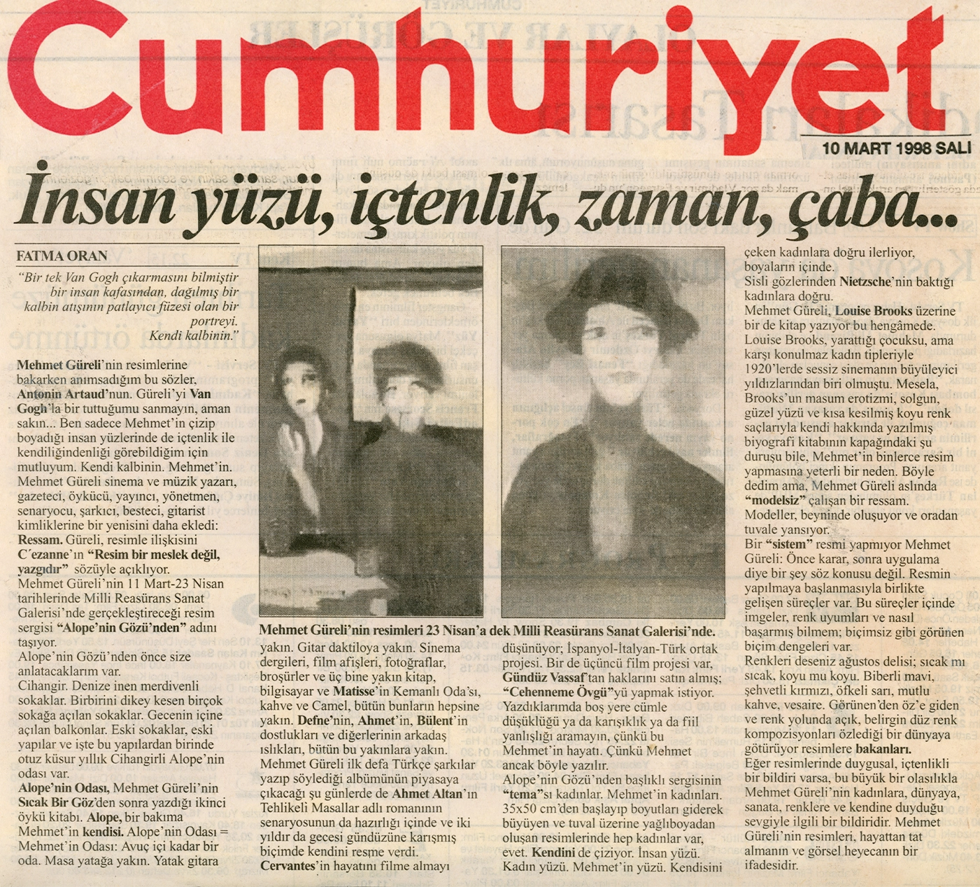 Known as a film director, musician, short story writer, journalist, publisher, caricaturist, and bookstore manager, Güreli is a "young" painter. The paintings, the product of two years of excitement and joy, initially seen by close friends and later seen on book covers, are being exhibited for the first time at the Millî Reasürans Art Gallery.