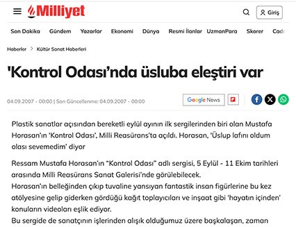Mustafa Horasan's exhibition titled "Control Room" is being showcased at the Millî Reasürans Art Gallery from September 5th to October 11th, 2007. A book has been prepared for the exhibition in both Turkish and English.