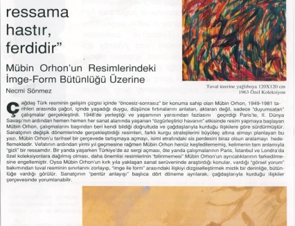 Abidin Dino, in an article he wrote after Mübin Orhon’s death, remembered Mübin Orhon, who was still not well known in Turkey but had managed to gain acceptance among the “Paris School” painters and whose works were in collections abroad, by saying, “First of all, there are the paintings he made, and when we look at these paintings, what we see is the sincerity, enthusiasm, color movement, beauty and uniqueness of suffering. There is no other ancestor of this kind in the history of Turkish painting.”