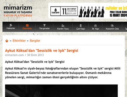 Aykut Köksal will exhibit his black and white photographs under the title "Silence and Light" at the Milli Reasürans Art Gallery from November 15 to December 14, 2013. Köksal focuses on classical Ottoman spaces in his photographs, aiming to convey the essence of "silence" and "light" that defines these spaces through the abstract language of black and white photography. The structures toward which Köksal's camera is directed to capture silence and light are all works from the Sinan period: Süleymaniye Mosque, Üsküdar Atik Valide Complex, Şehzade Mosque, Süleymaniye Complex Râbi Madrasa, Üsküdar Mihrimah Sultan Mosque, Kılıç Ali Paşa Mosque, Rüstem Paşa Mosque, Kanuni Tomb, Beşiktaş Sinan Paşa Mosque, Zâl Mahmut Paşa Mosque, Azapkapı Sokollu Mosque.