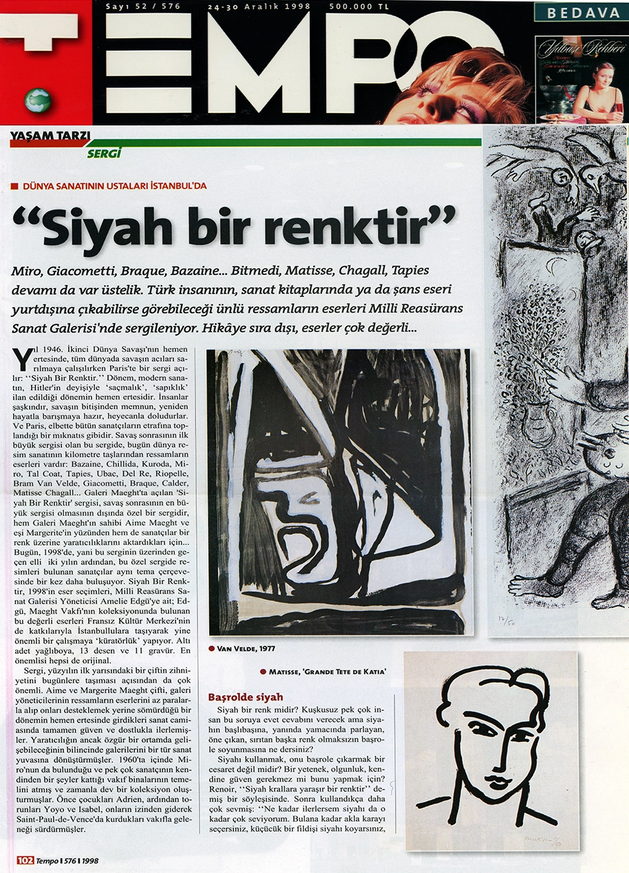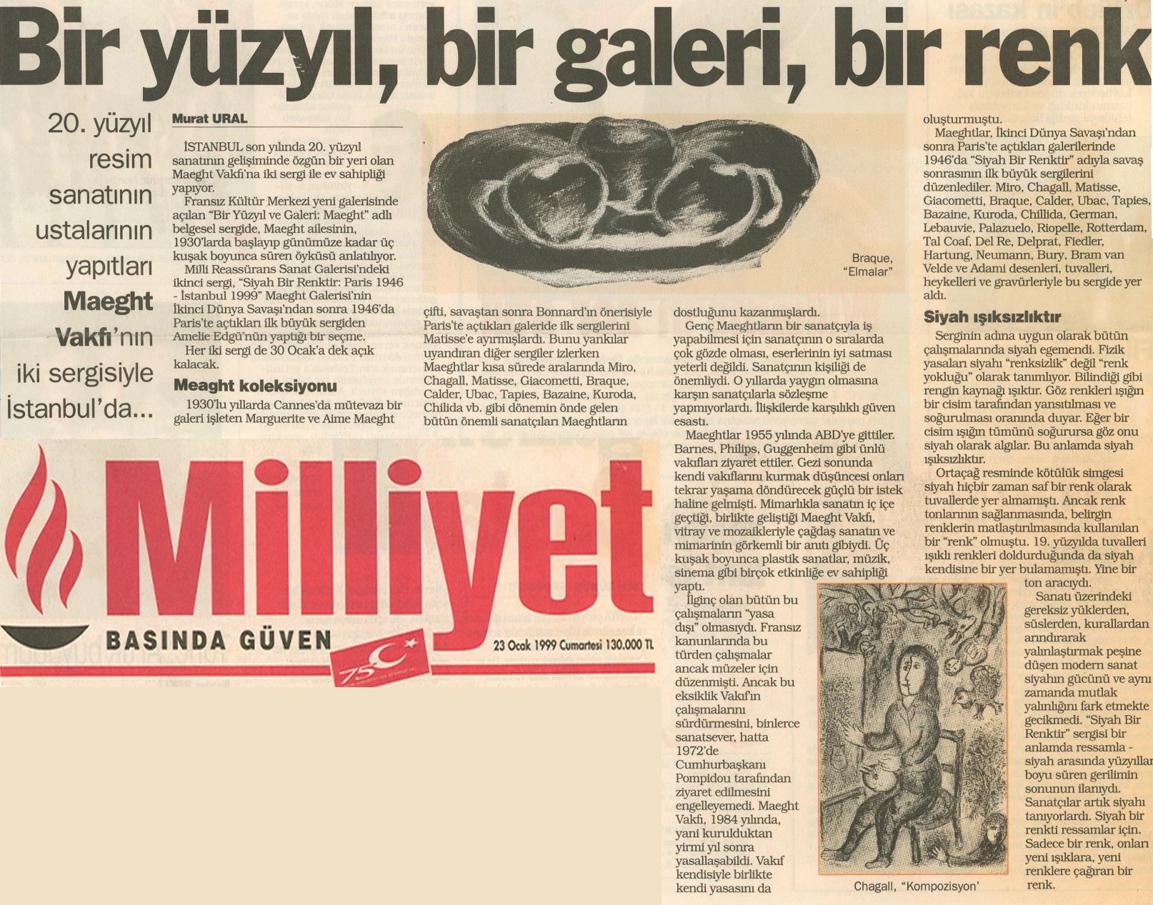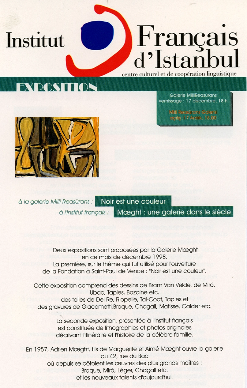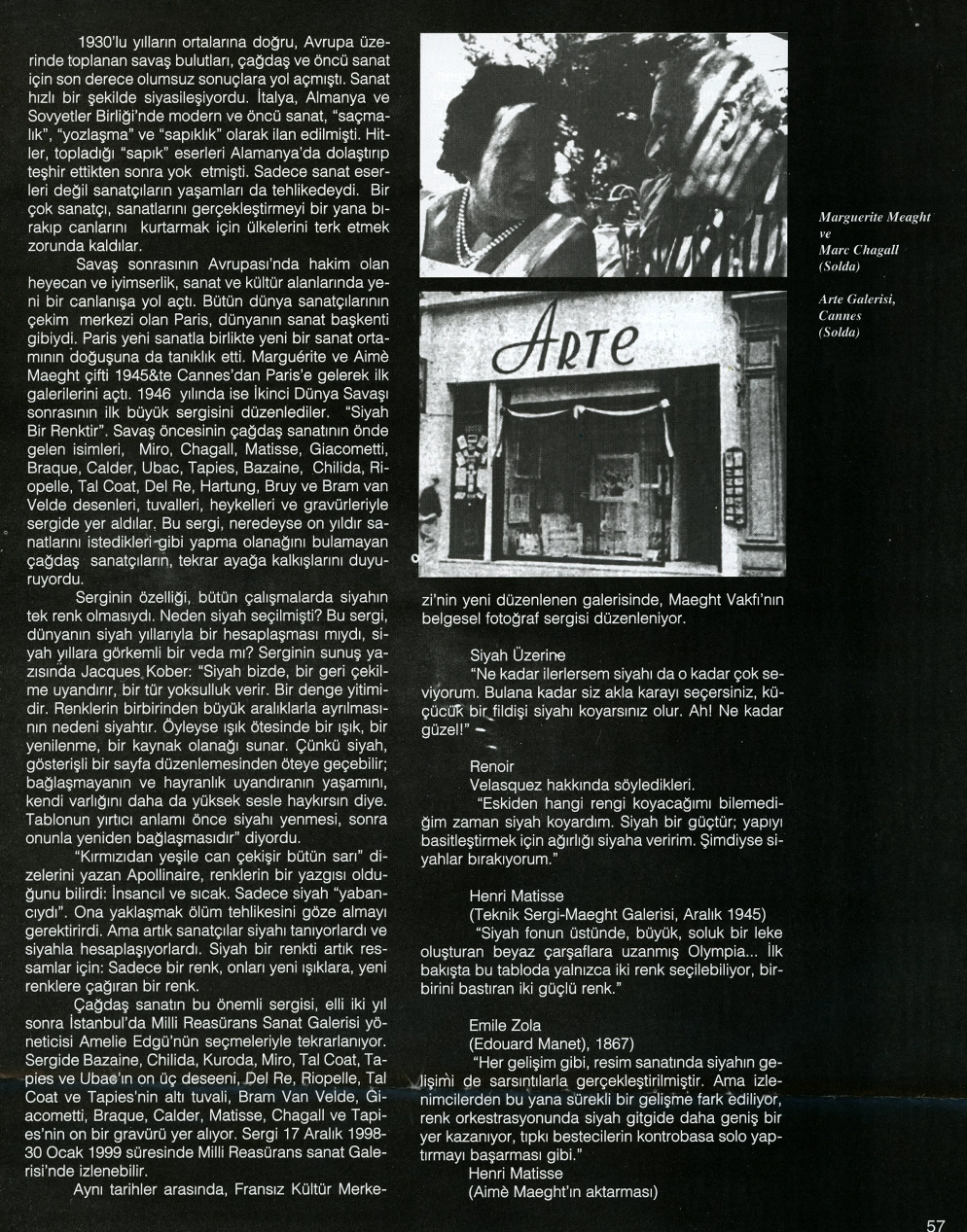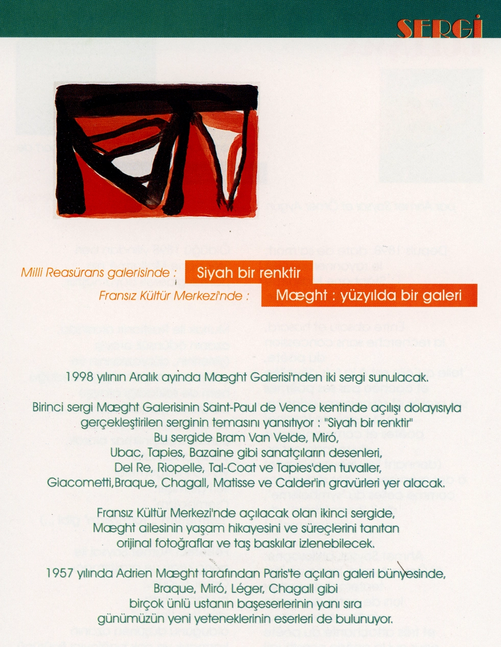 The Maeghts' 1946 exhibition "Black Is a Color," considered one of the most important exhibitions of contemporary art in Paris, will be held again fifty-two years later at the Milli Reasürans Art Gallery in Istanbul. Fifty-two years later, artists such as Bazine, Tapies, Ubac, Miro, Giacometti, Braque, Calder, Matisse, Chagall, Kuroda, and Chillida will be presented to Istanbul art lovers with their drawings, paintings, sculptures, and engravings.