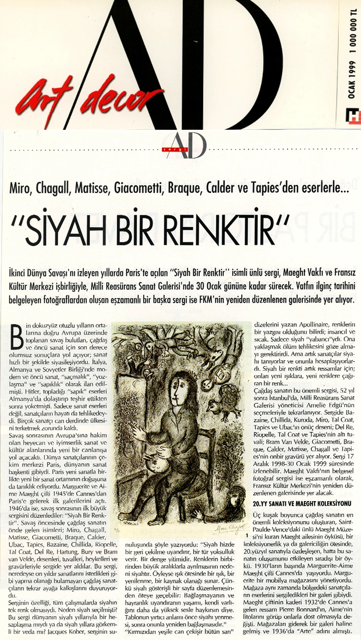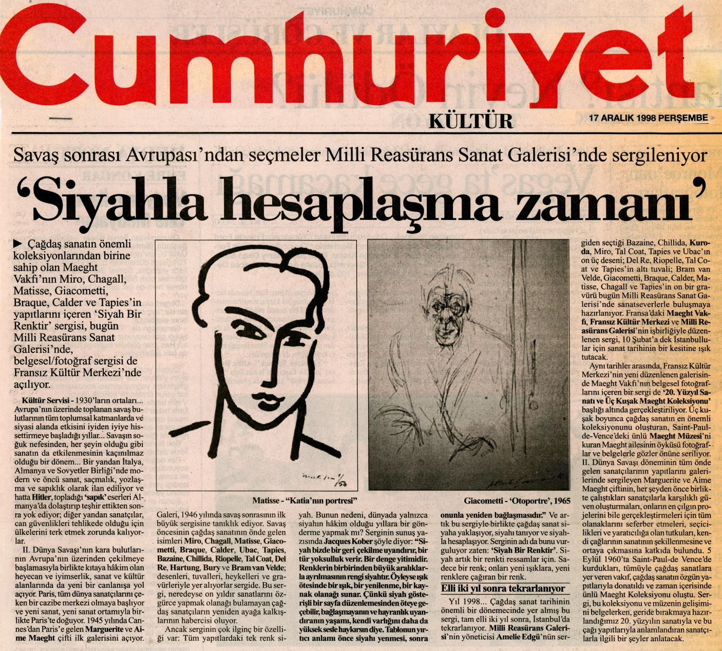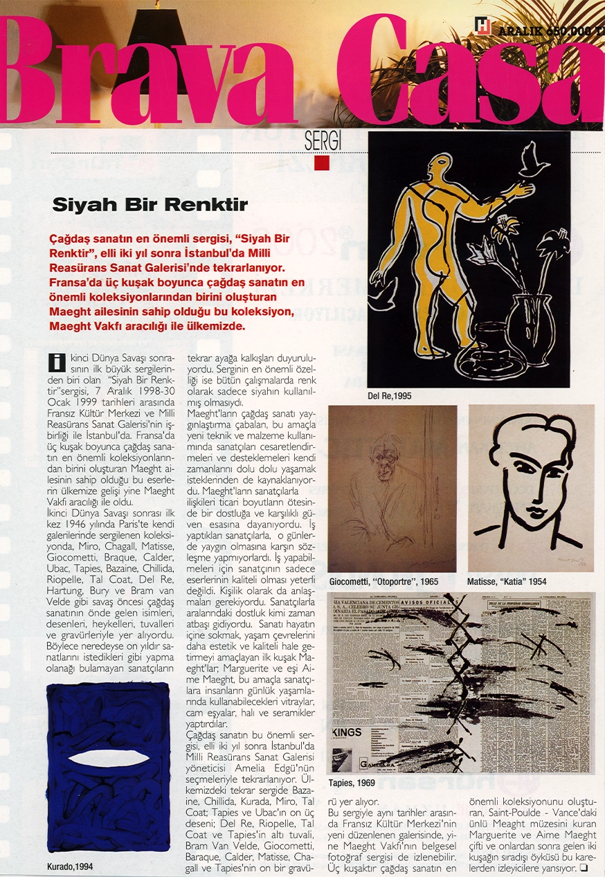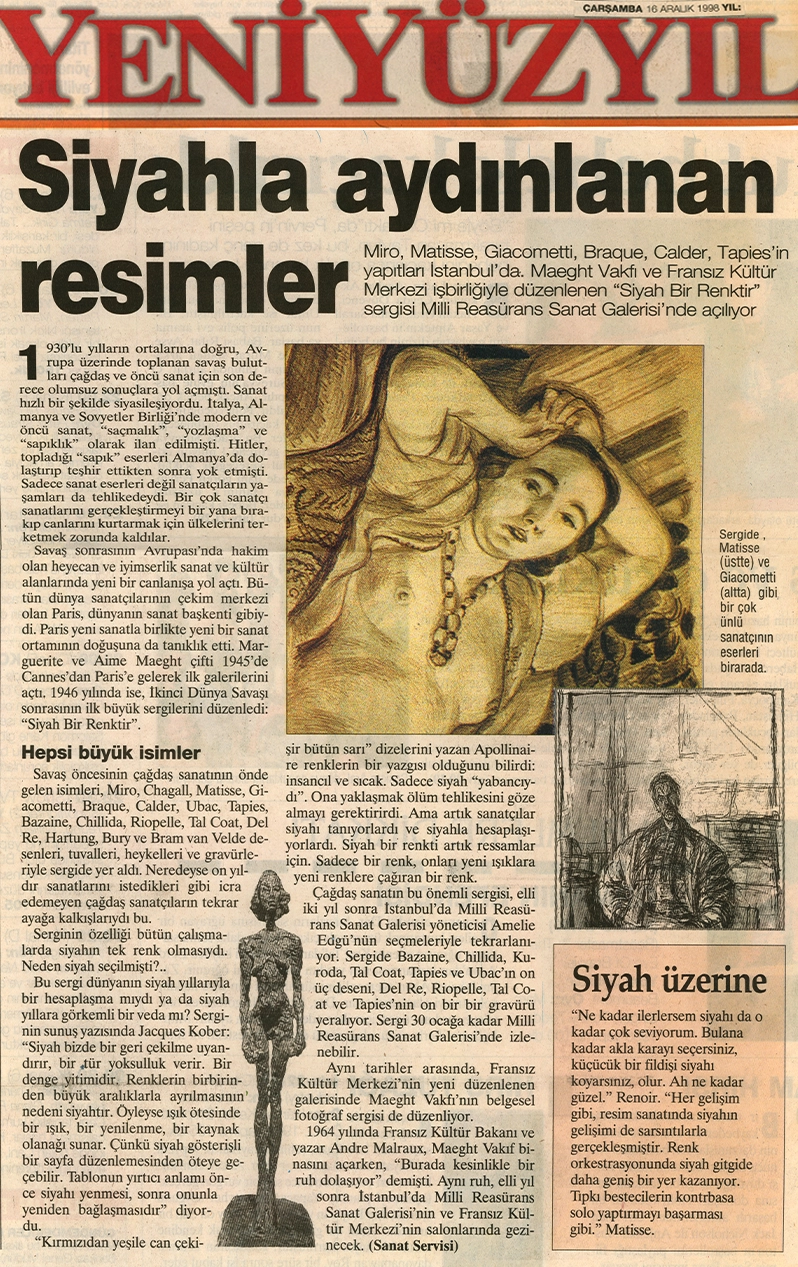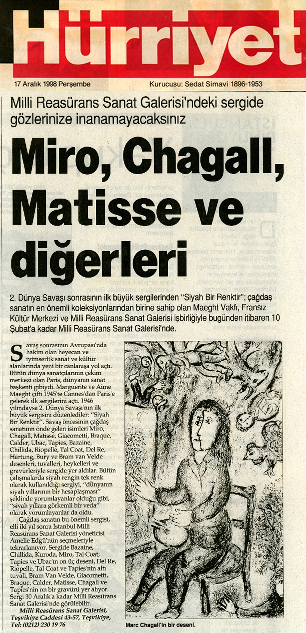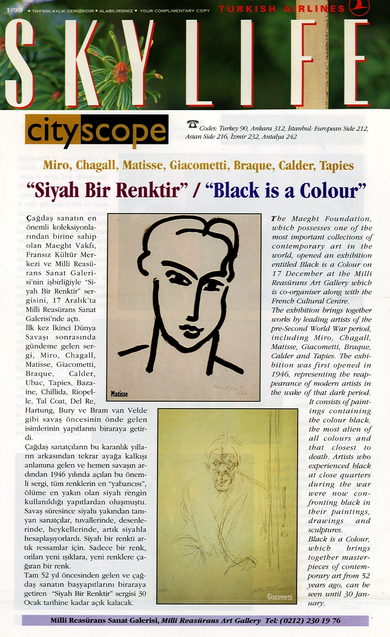 The Maeghts' 1946 exhibition "Black Is a Color," considered one of the most important exhibitions of contemporary art in Paris, will be held again fifty-two years later at the Milli Reasürans Art Gallery in Istanbul. Fifty-two years later, artists such as Bazine, Tapies, Ubac, Miro, Giacometti, Braque, Calder, Matisse, Chagall, Kuroda, and Chillida will be presented to Istanbul art lovers with their drawings, paintings, sculptures, and engravings.