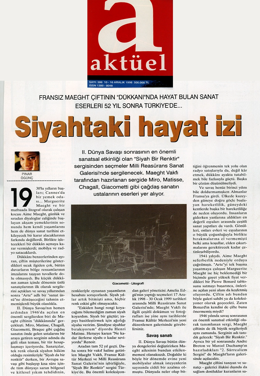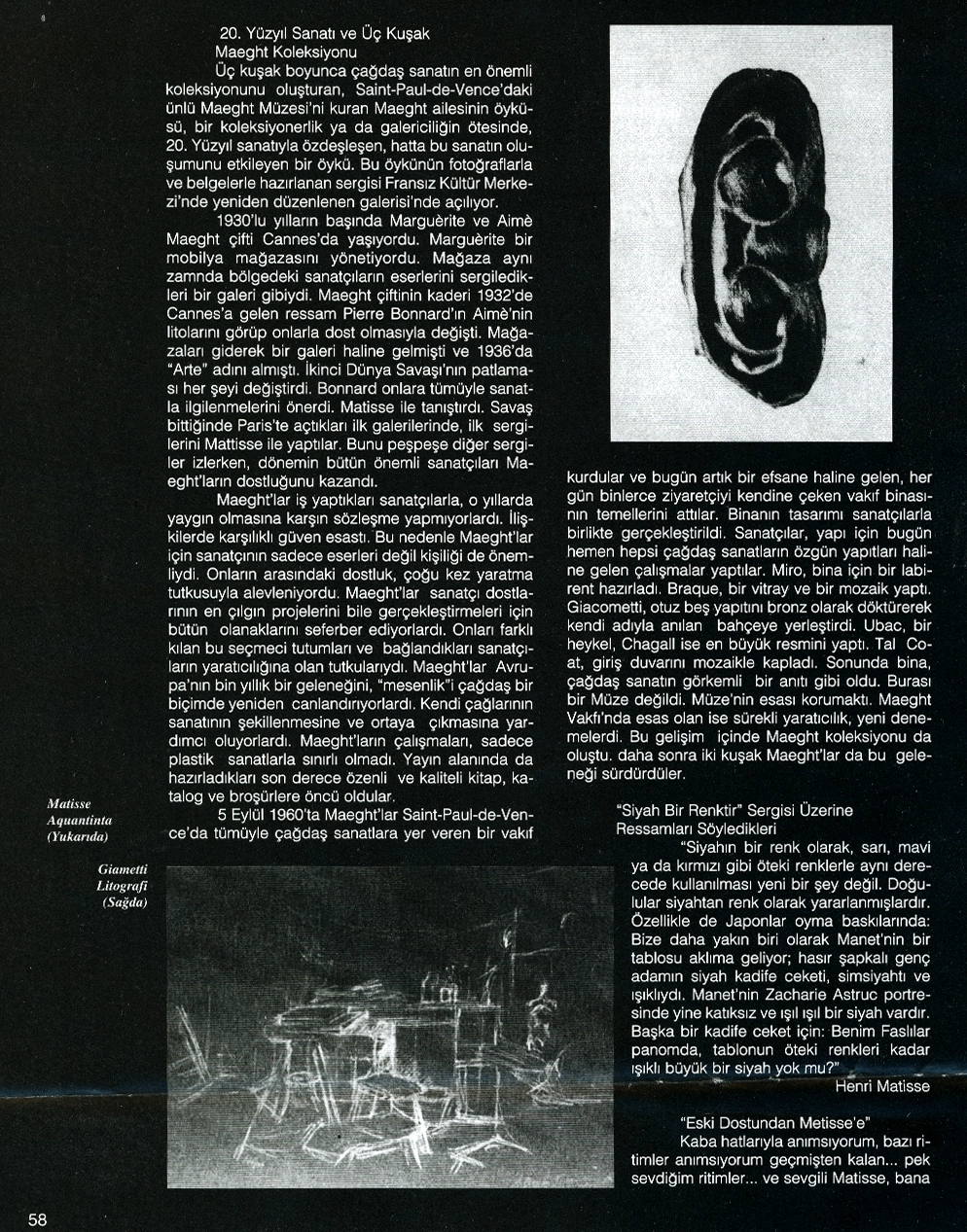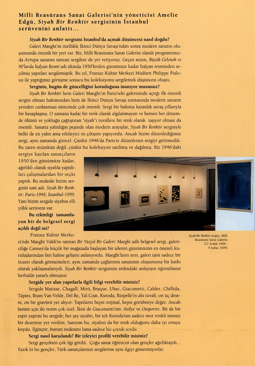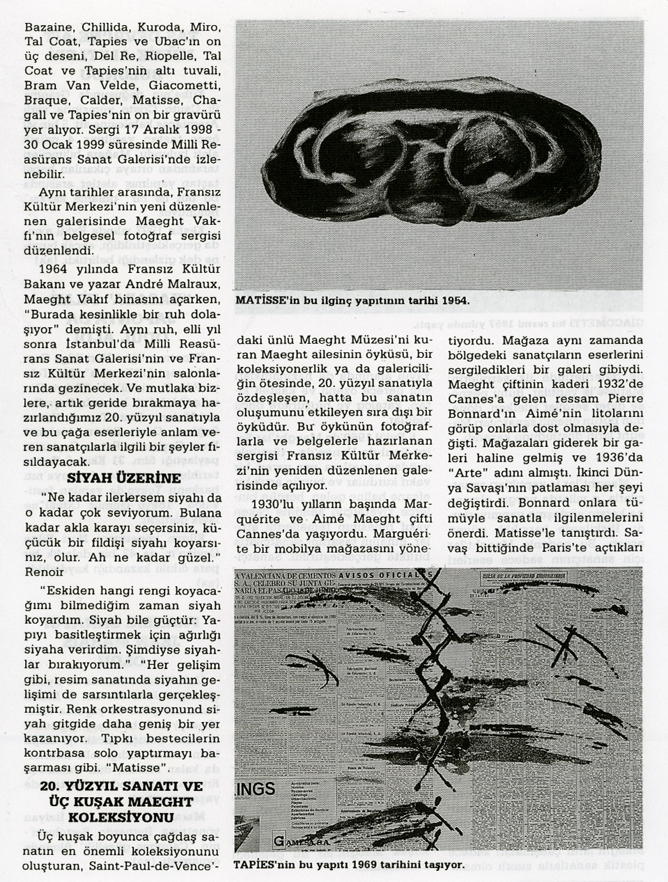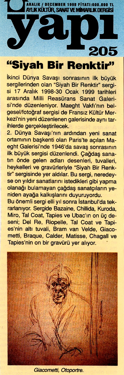 The Maeghts' 1946 exhibition "Black Is a Color," considered one of the most important exhibitions of contemporary art in Paris, will be held again fifty-two years later at the Milli Reasürans Art Gallery in Istanbul. Fifty-two years later, artists such as Bazine, Tapies, Ubac, Miro, Giacometti, Braque, Calder, Matisse, Chagall, Kuroda, and Chillida will be presented to Istanbul art lovers with their drawings, paintings, sculptures, and engravings.