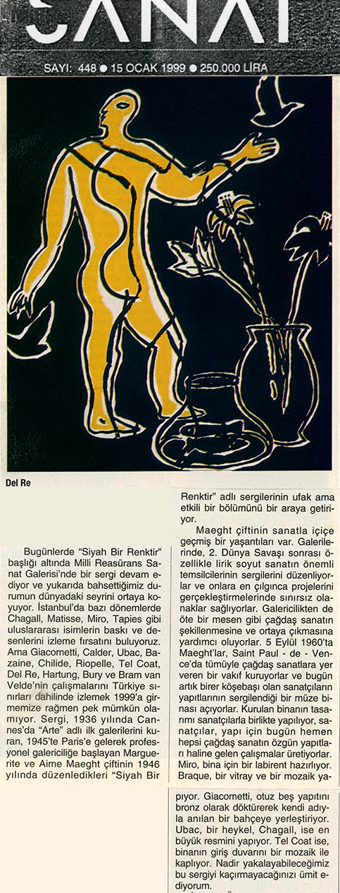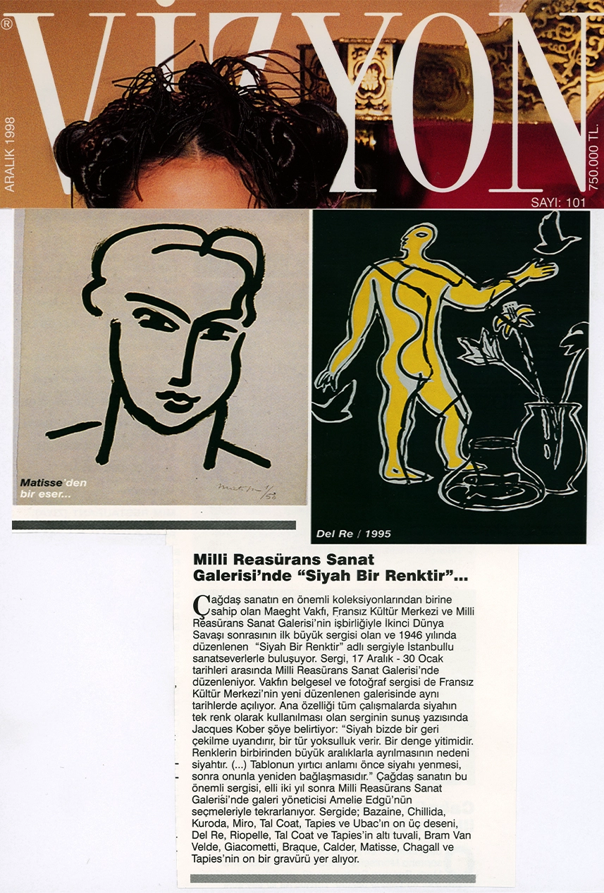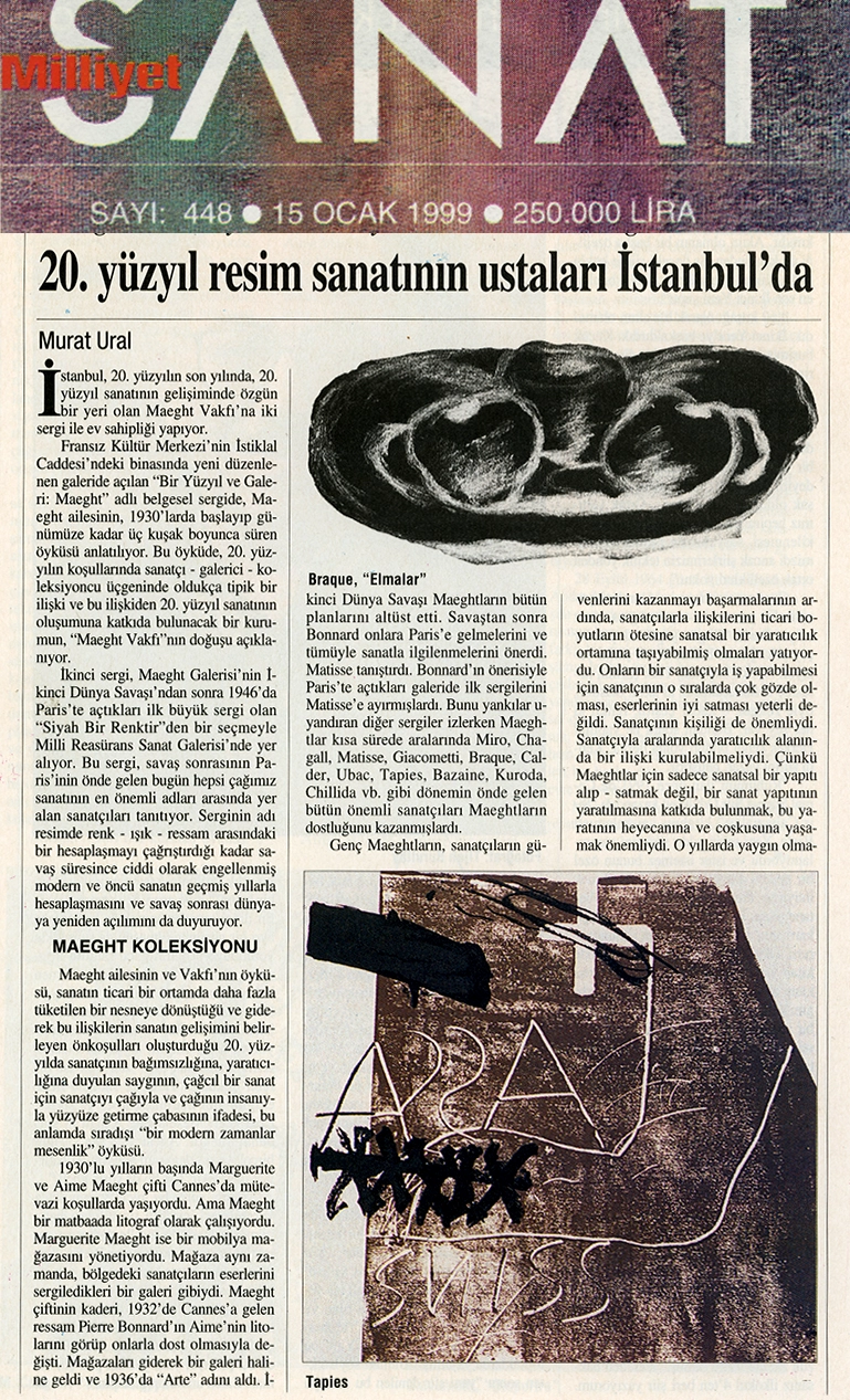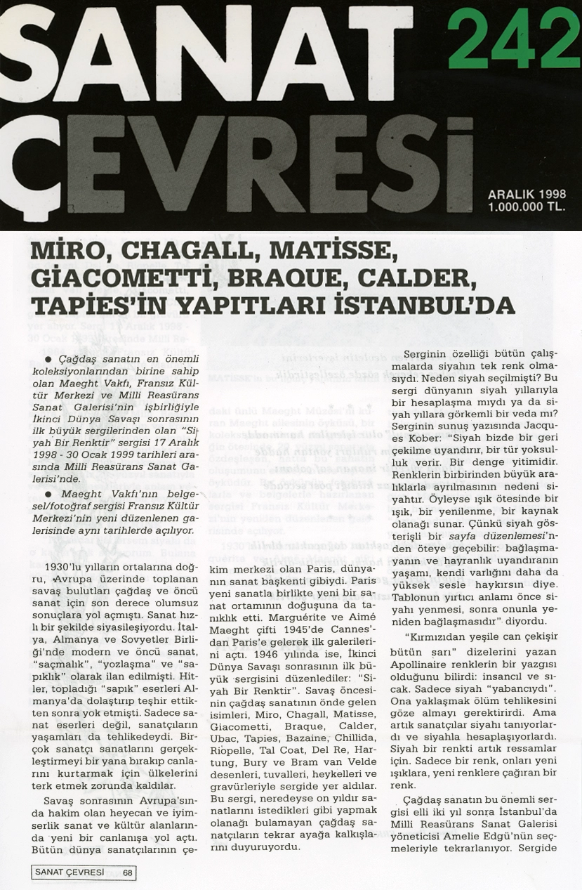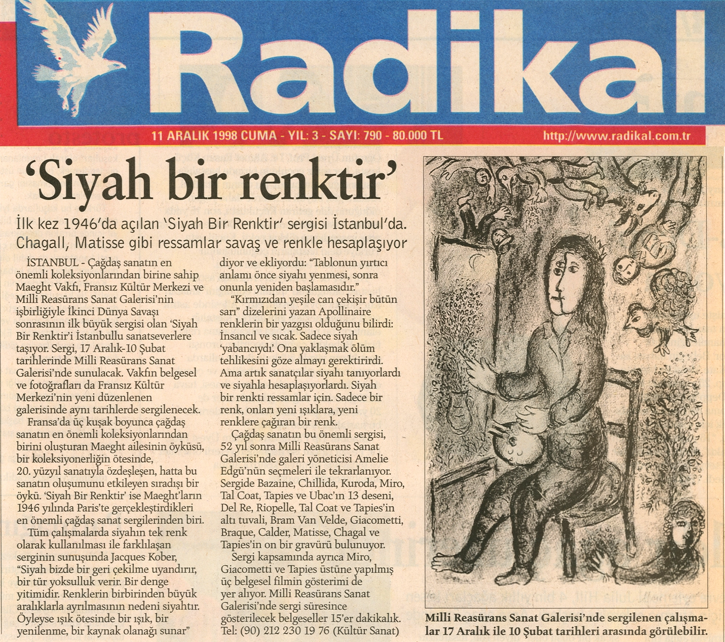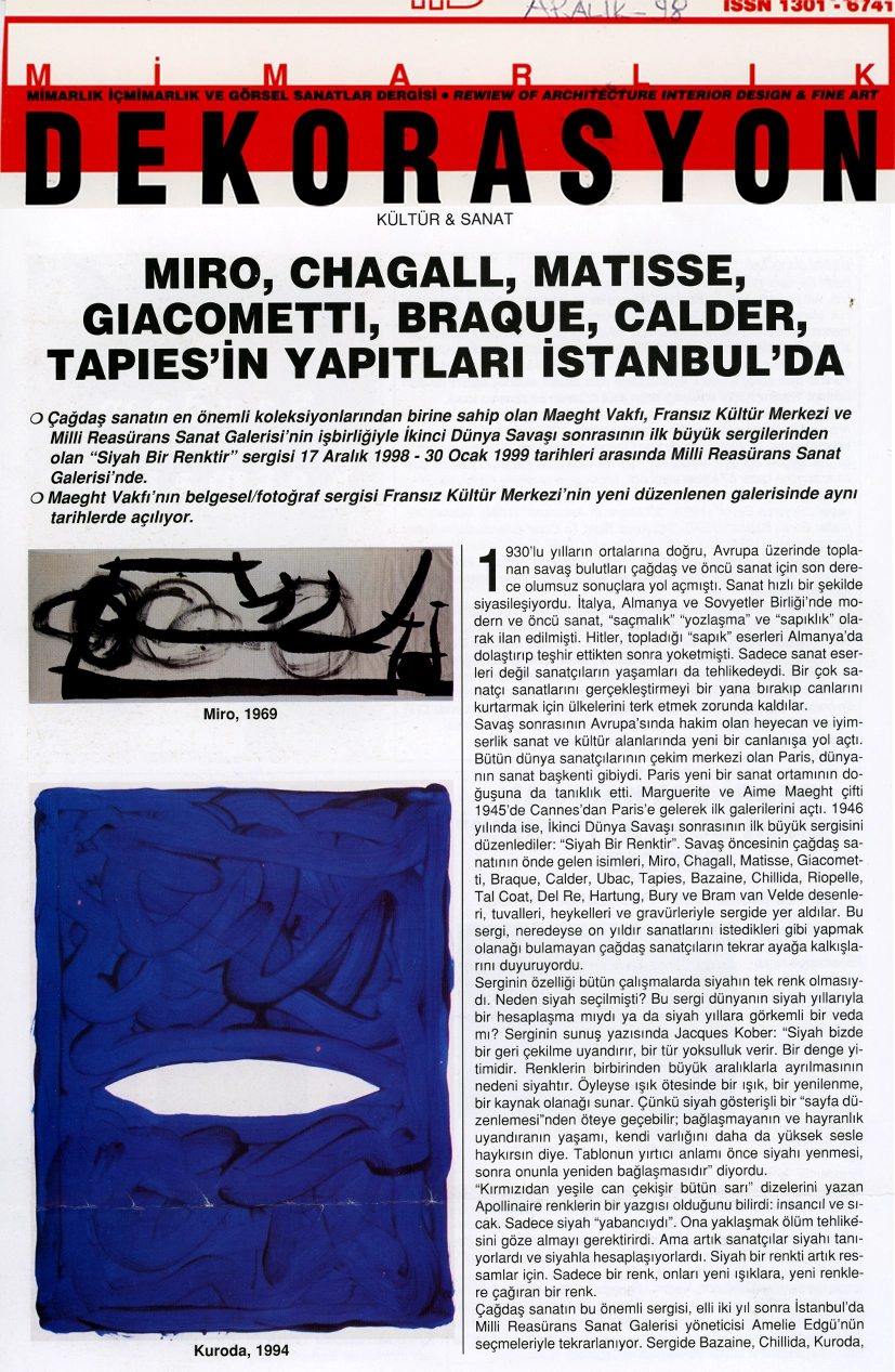 The Maeghts' 1946 exhibition "Black Is a Color," considered one of the most important exhibitions of contemporary art in Paris, will be held again fifty-two years later at the Milli Reasürans Art Gallery in Istanbul. Fifty-two years later, artists such as Bazine, Tapies, Ubac, Miro, Giacometti, Braque, Calder, Matisse, Chagall, Kuroda, and Chillida will be presented to Istanbul art lovers with their drawings, paintings, sculptures, and engravings.
