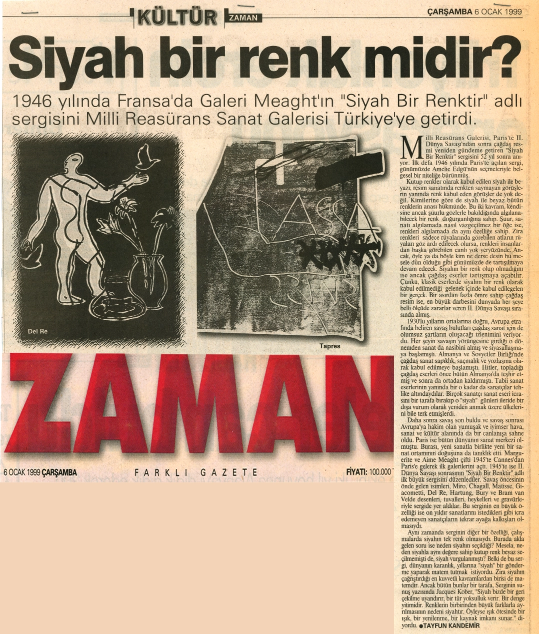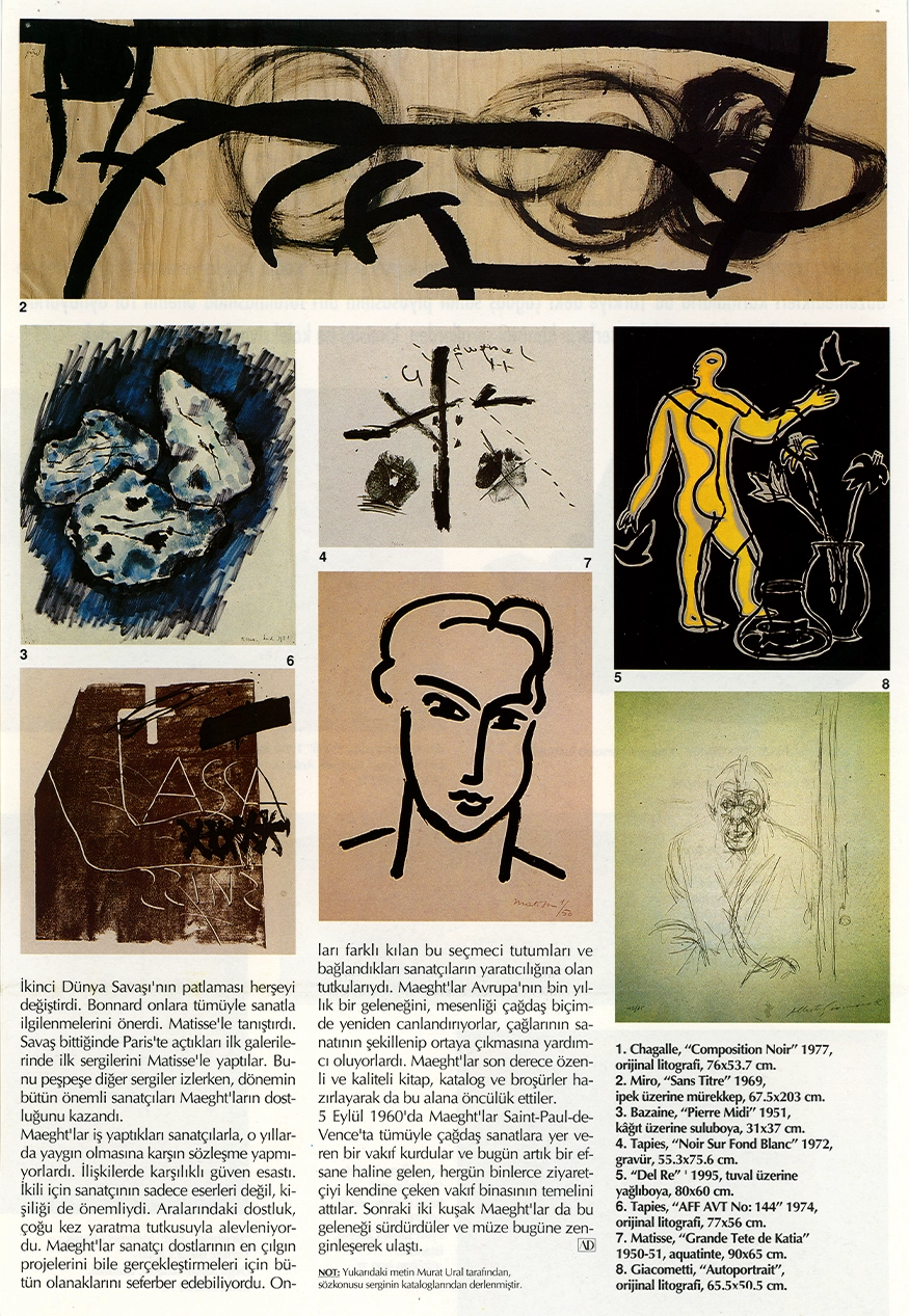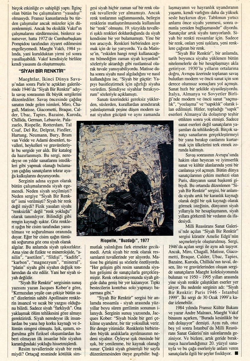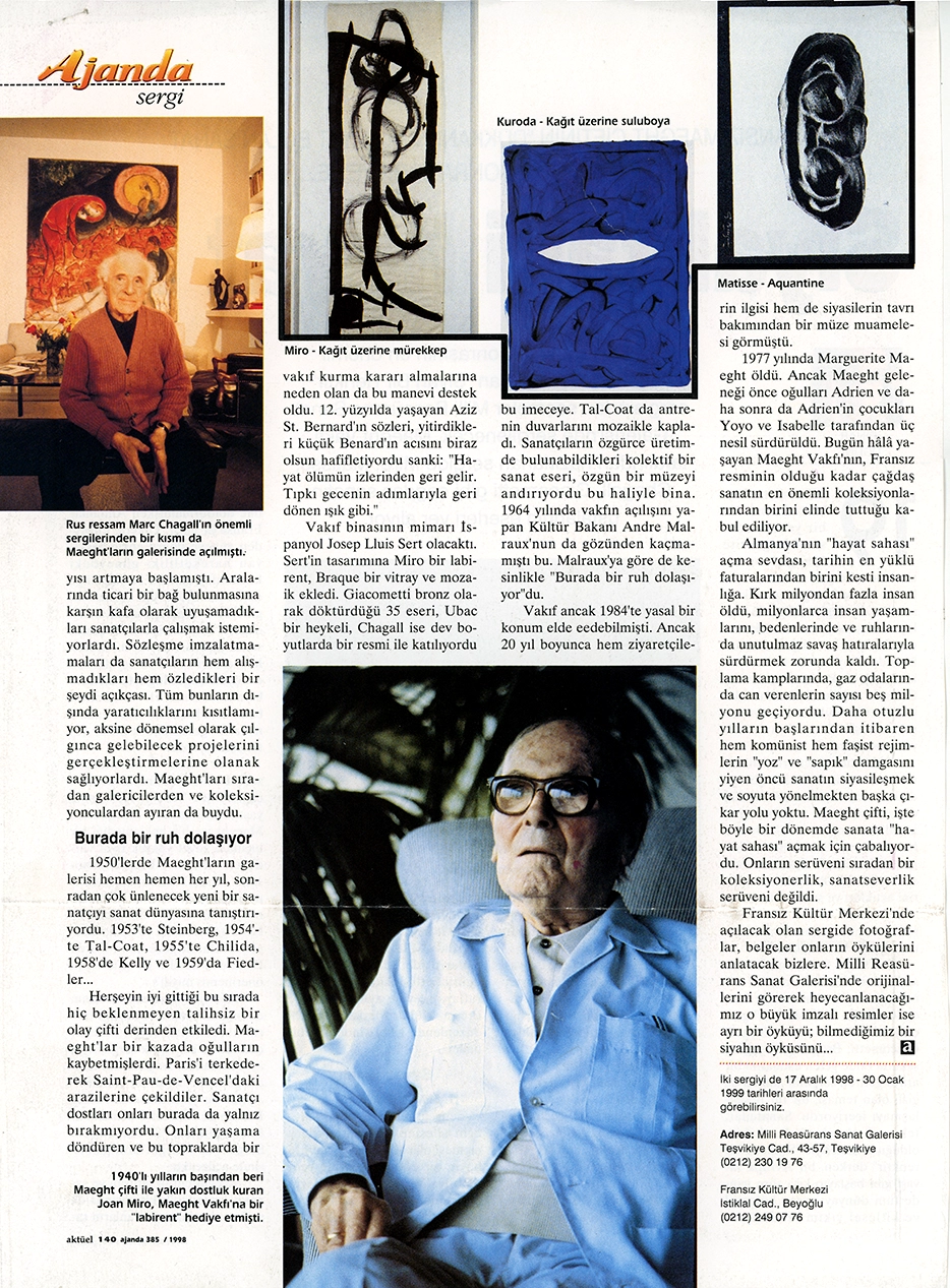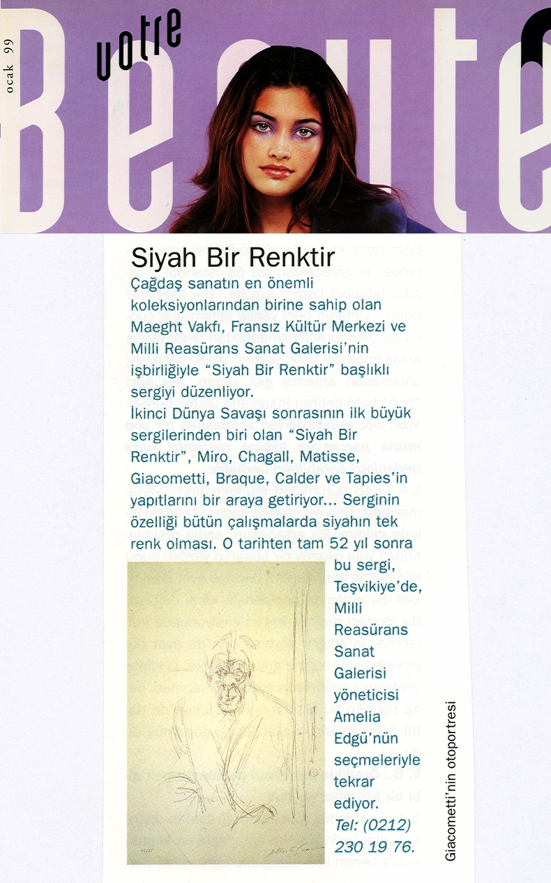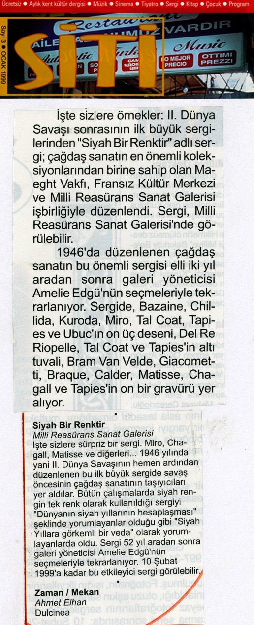 The Maeghts' 1946 exhibition "Black Is a Color," considered one of the most important exhibitions of contemporary art in Paris, will be held again fifty-two years later at the Milli Reasürans Art Gallery in Istanbul. Fifty-two years later, artists such as Bazine, Tapies, Ubac, Miro, Giacometti, Braque, Calder, Matisse, Chagall, Kuroda, and Chillida will be presented to Istanbul art lovers with their drawings, paintings, sculptures, and engravings.