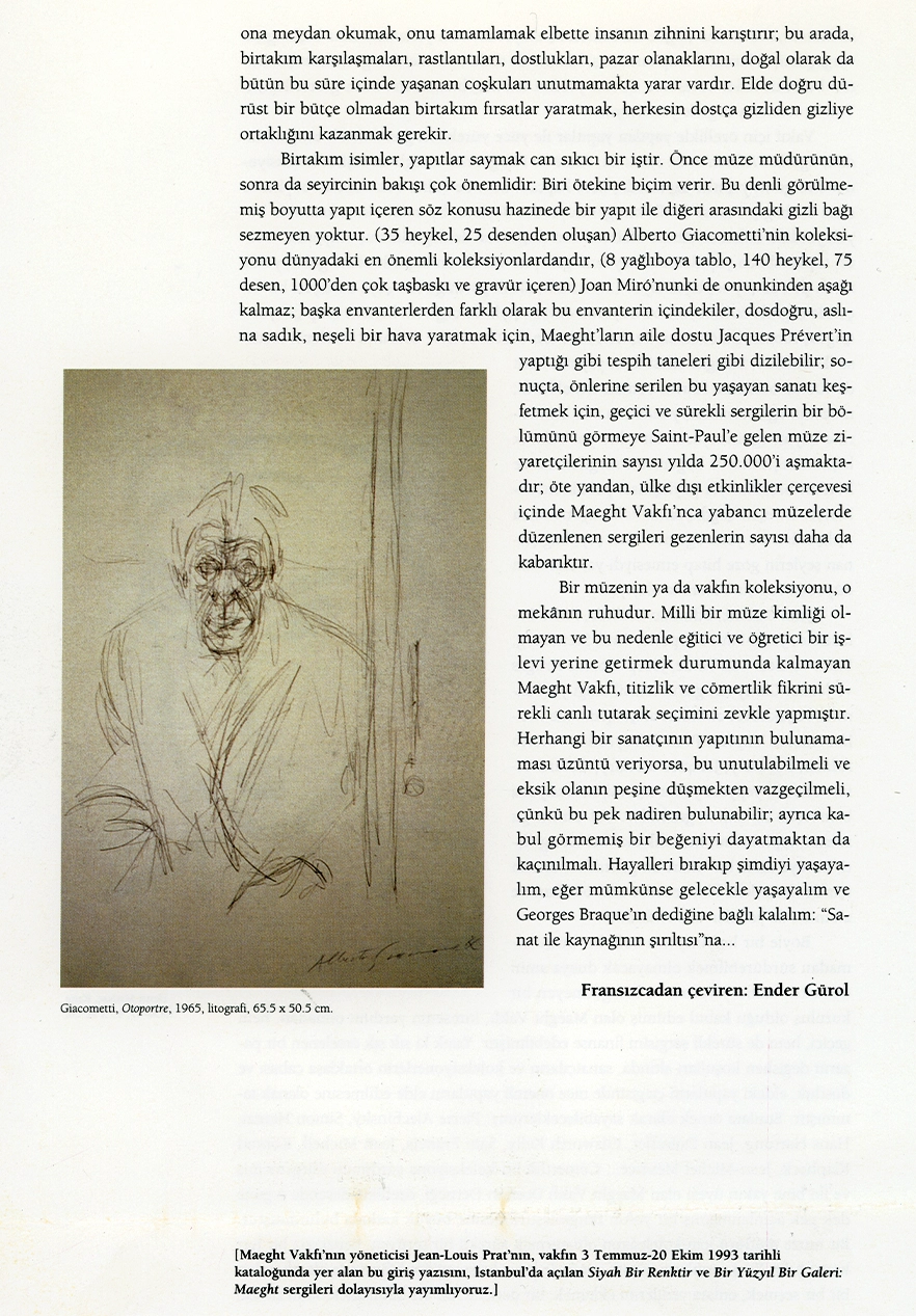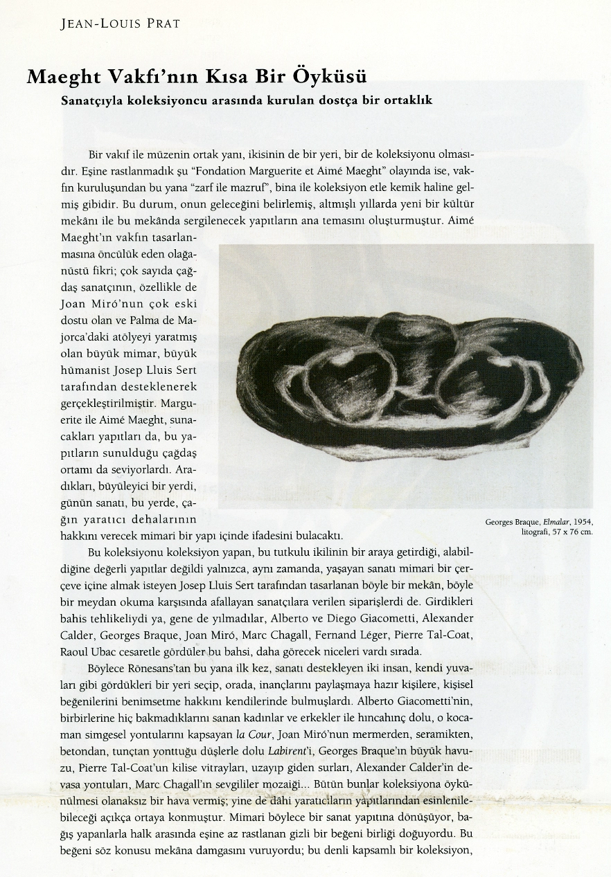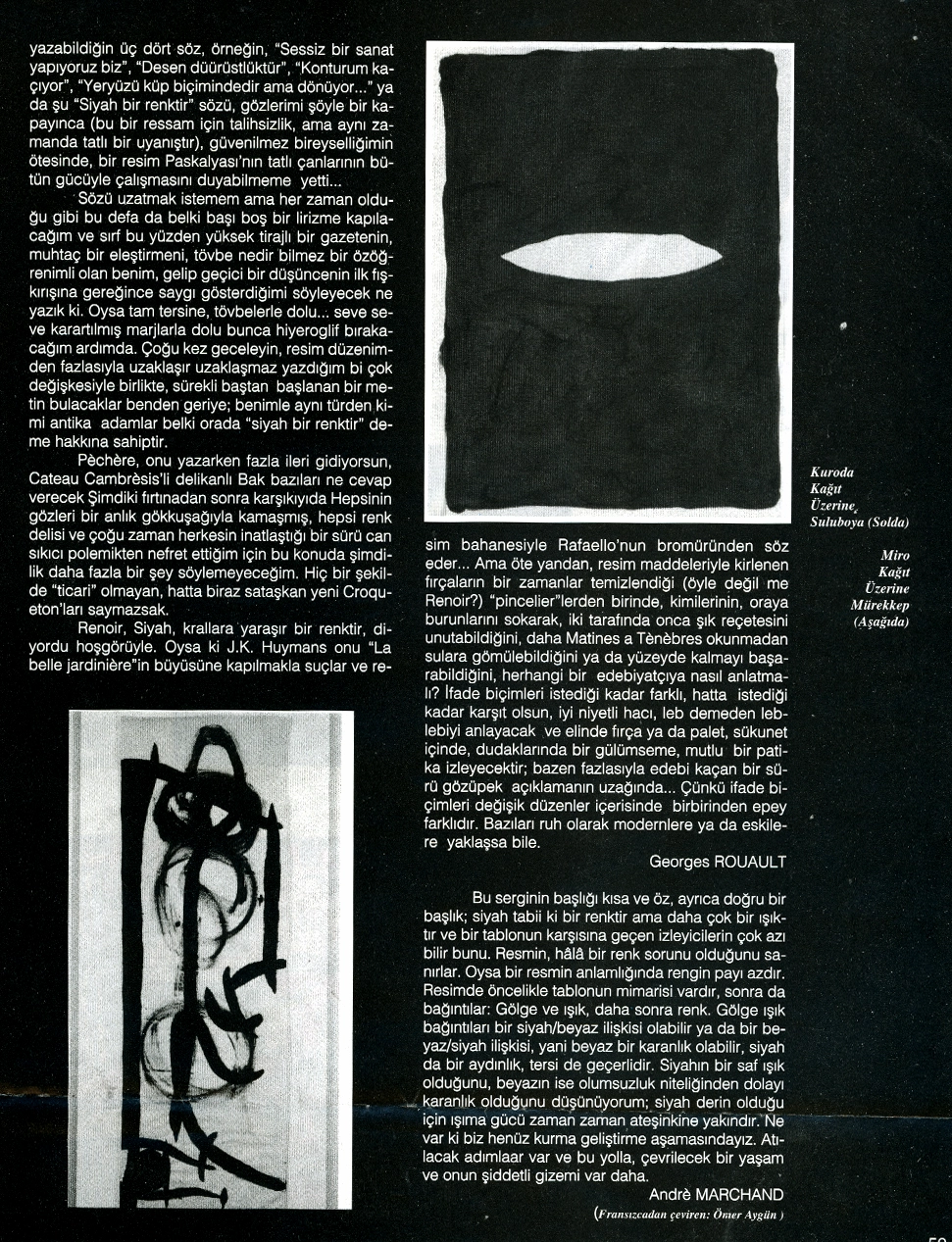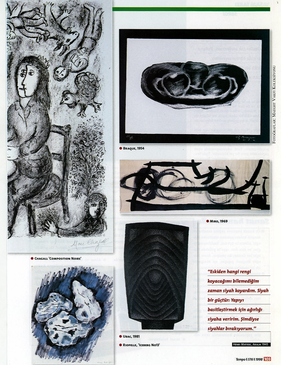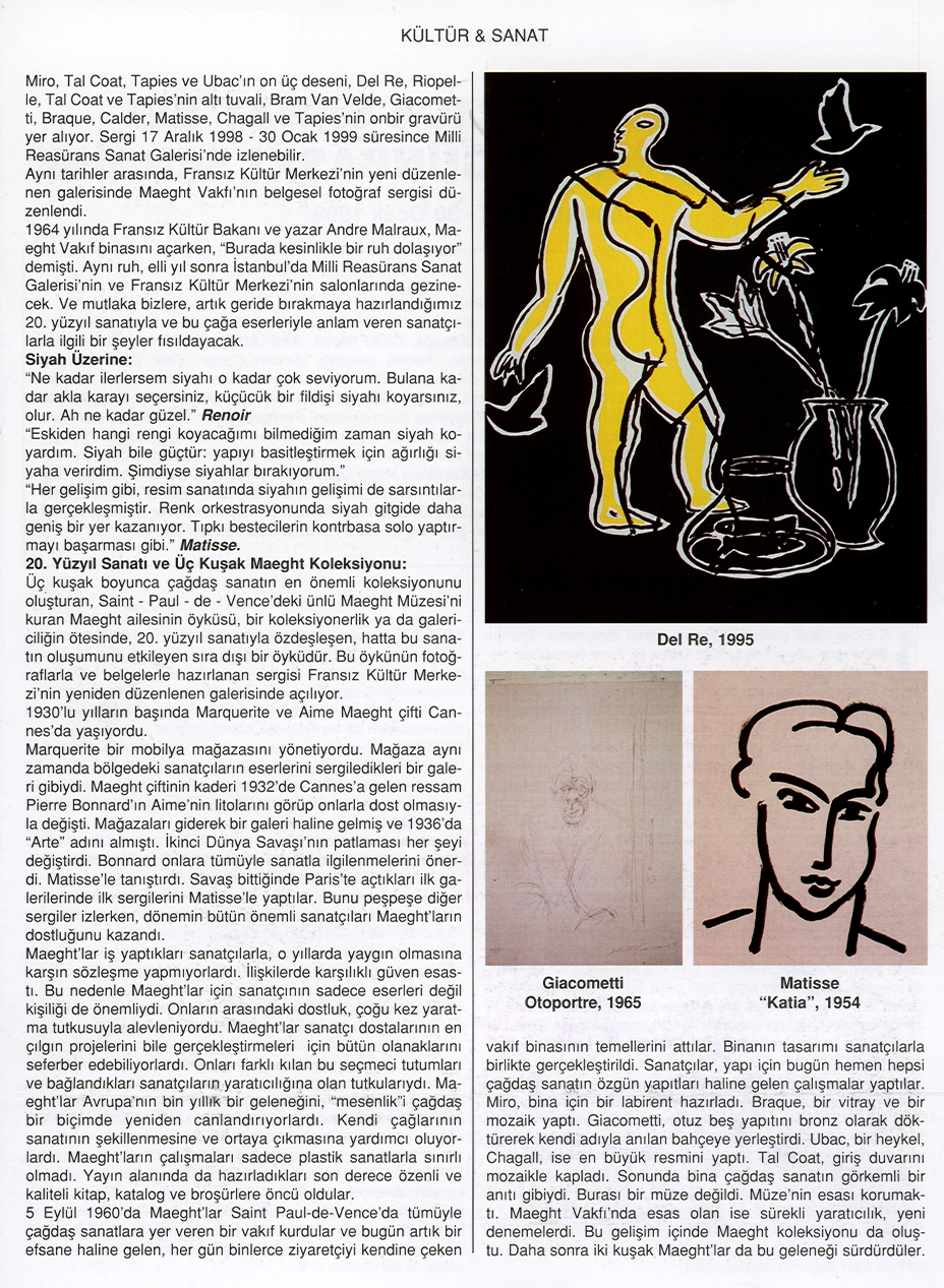 The Maeghts' 1946 exhibition "Black Is a Color," considered one of the most important exhibitions of contemporary art in Paris, will be held again fifty-two years later at the Milli Reasürans Art Gallery in Istanbul. Fifty-two years later, artists such as Bazine, Tapies, Ubac, Miro, Giacometti, Braque, Calder, Matisse, Chagall, Kuroda, and Chillida will be presented to Istanbul art lovers with their drawings, paintings, sculptures, and engravings.
