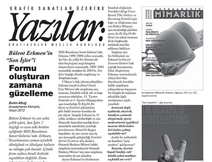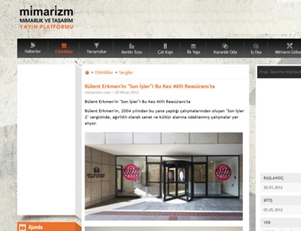 Showcasing Bülent Erkmen's works executed since 2004, the exhibition 'Recent Works 2' can be seen between March 20 - May 5, 2012 at Milli Reasürans Art Gallery.
