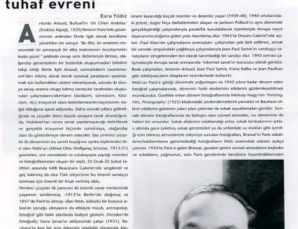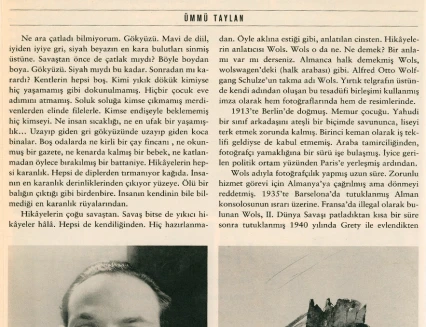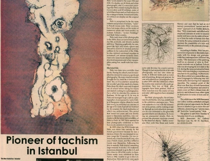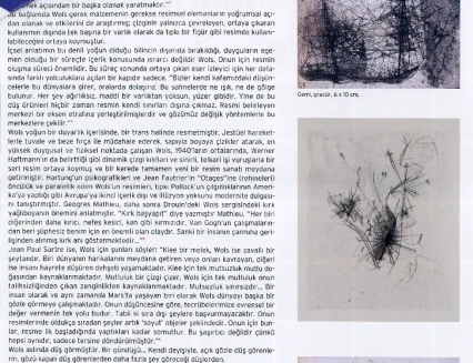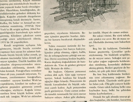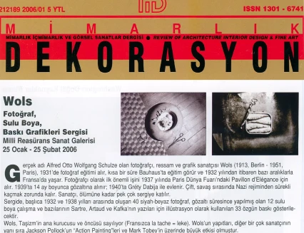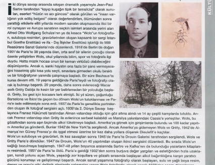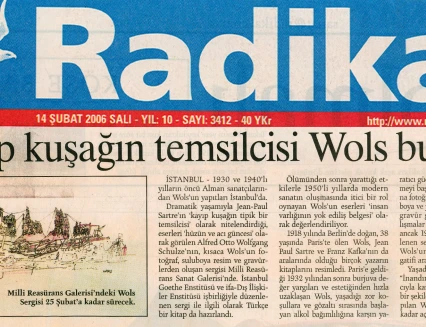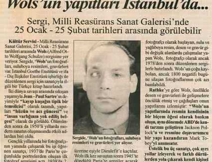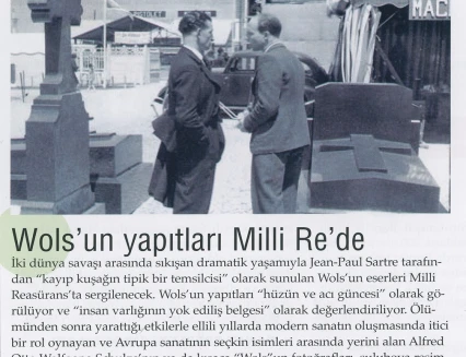 A comprehensive exhibition of photographs, watercolors, and engravings by Alfred Otto Wolfgang Schulze, known as "Wols," whose dramatic life sandwiched between the two World Wars was presented by Jean-Paul Sartre as a "typical representative of the lost generation," seen as a "chronicle of sadness and pain," and evaluated as "evidence of the annihilation of human existence," was organized at the Millî Reasürans Art Gallery in collaboration with the Istanbul Goethe Institute and the ifa - Institute for Foreign Cultural Relations.