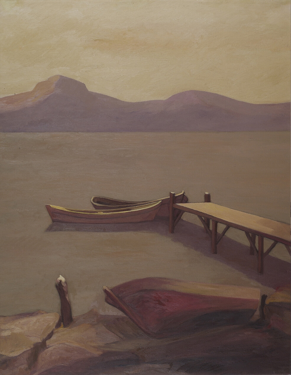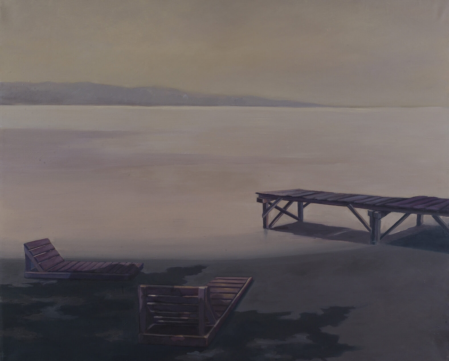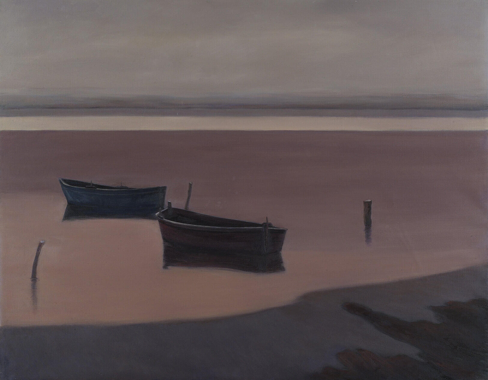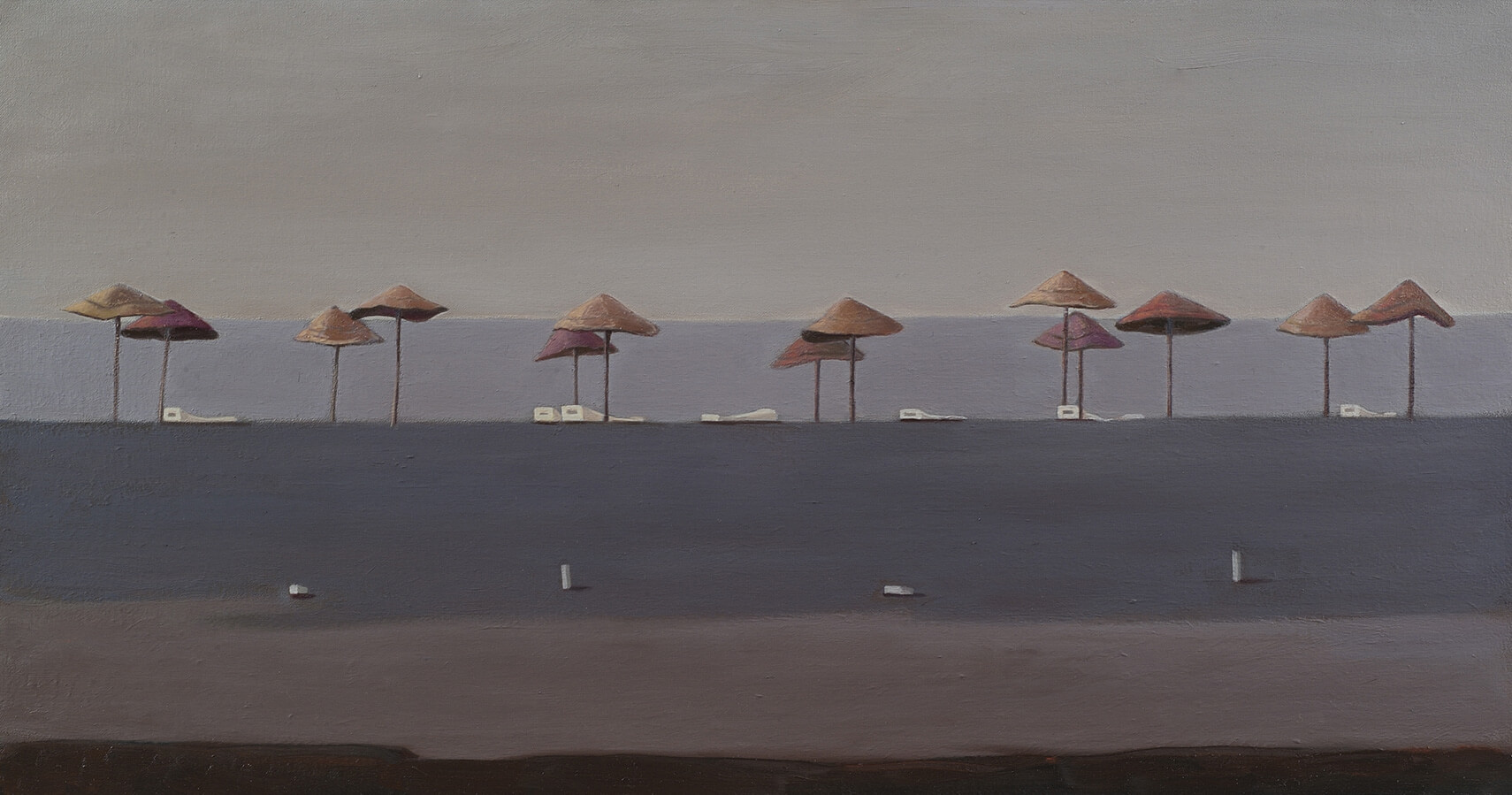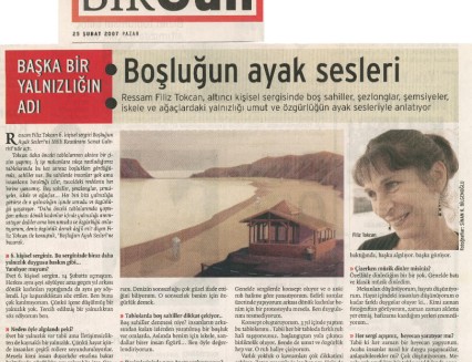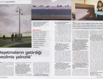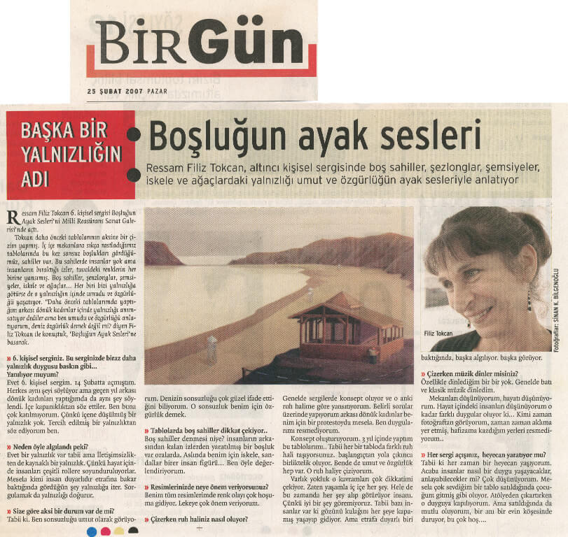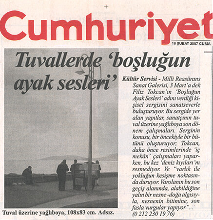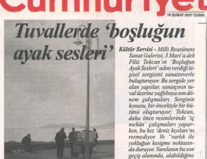 Sergilerine tematik bir bütünlük ekseninde hazırlanan Filiz Tokcan, yine Millî Reasürans Sanat Galerisi’nde düzenlenen bir önceki sergisindeki resimlerinde iç mekân kullanırken; “Boşluğun Ayak Sesleri”nde iç mekân kullanmayıp deniz kıyılarını seçmiş.