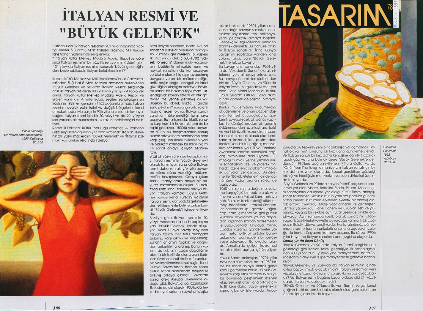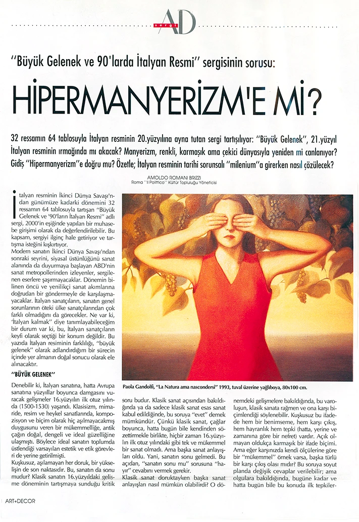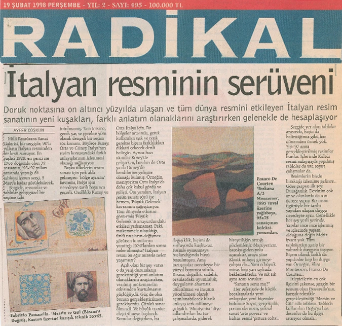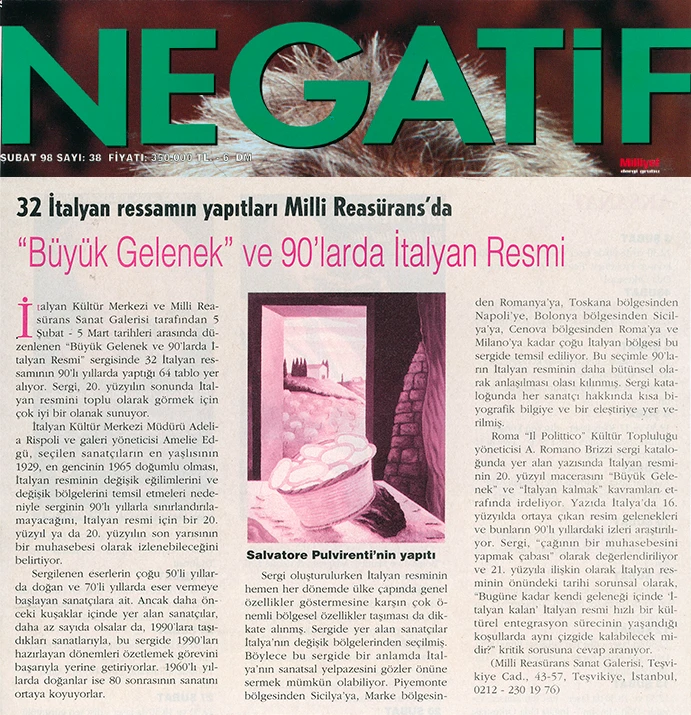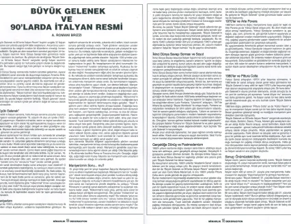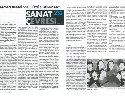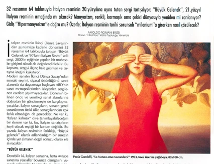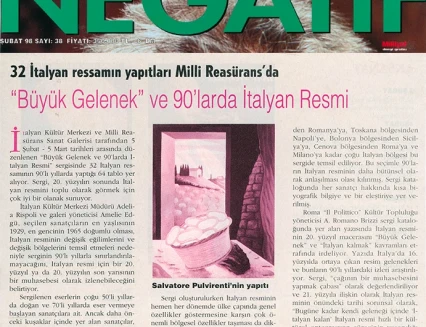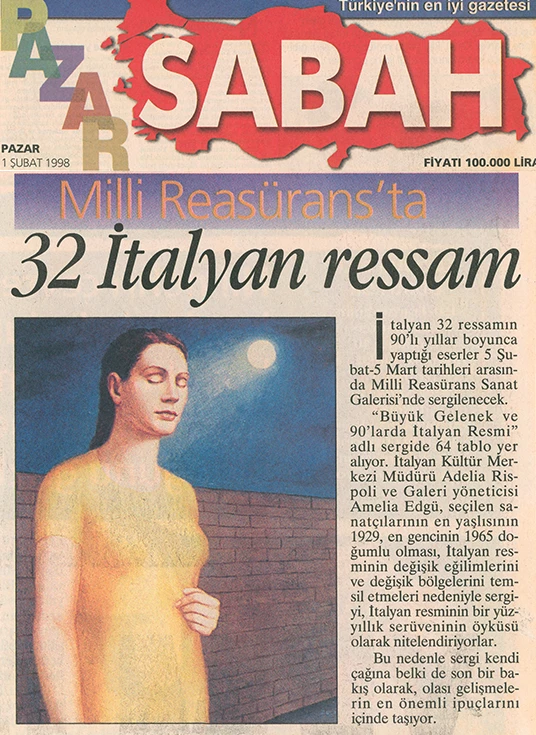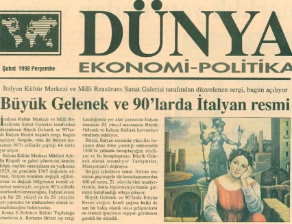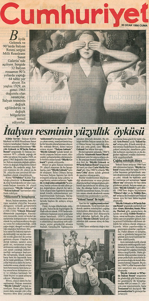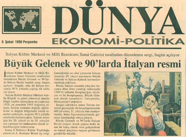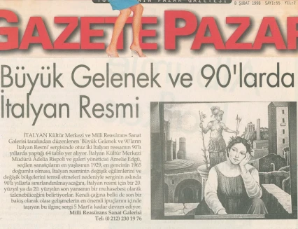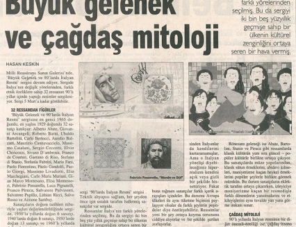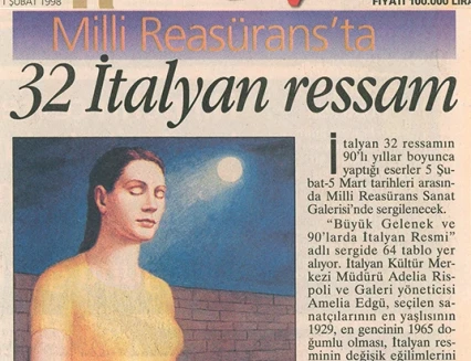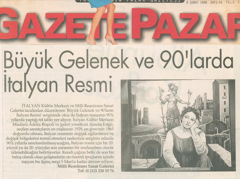 İtalyan Kültür Merkezi ve Millî Reasürans Sanat Galerisi tarafından 5 Şubat–5 Mart tarihleri arasında düzenlenen “Büyük Gelenek ve 90’larda İtalyan Resmi” sergisi otuz iki İtalyan ressamını toplu olarak görmek için çok iyi bir olanak sunuyor.