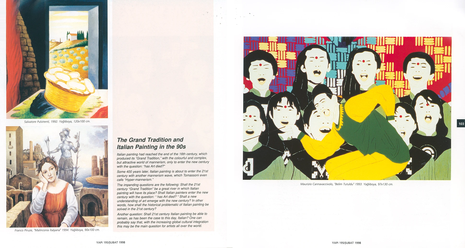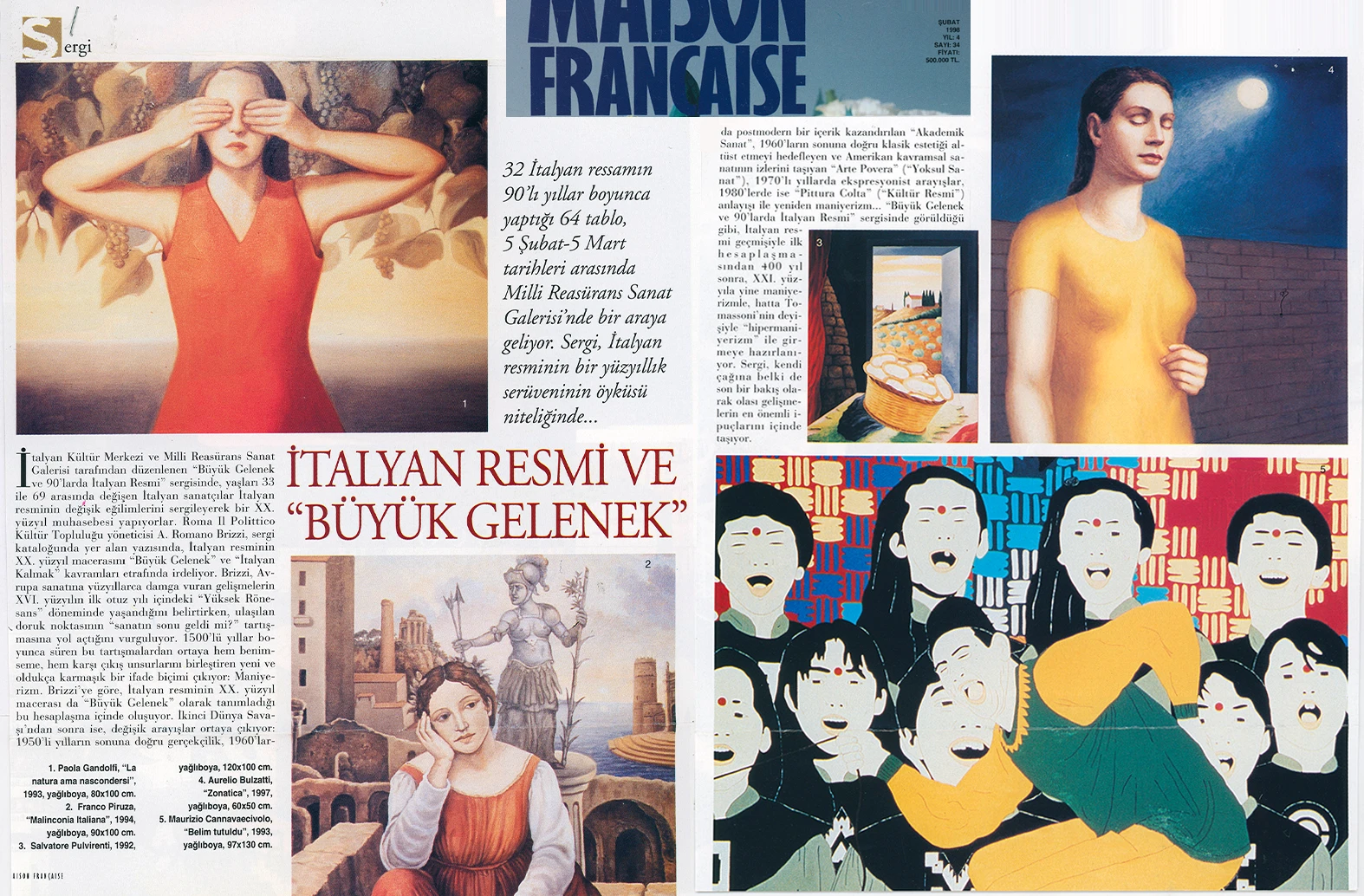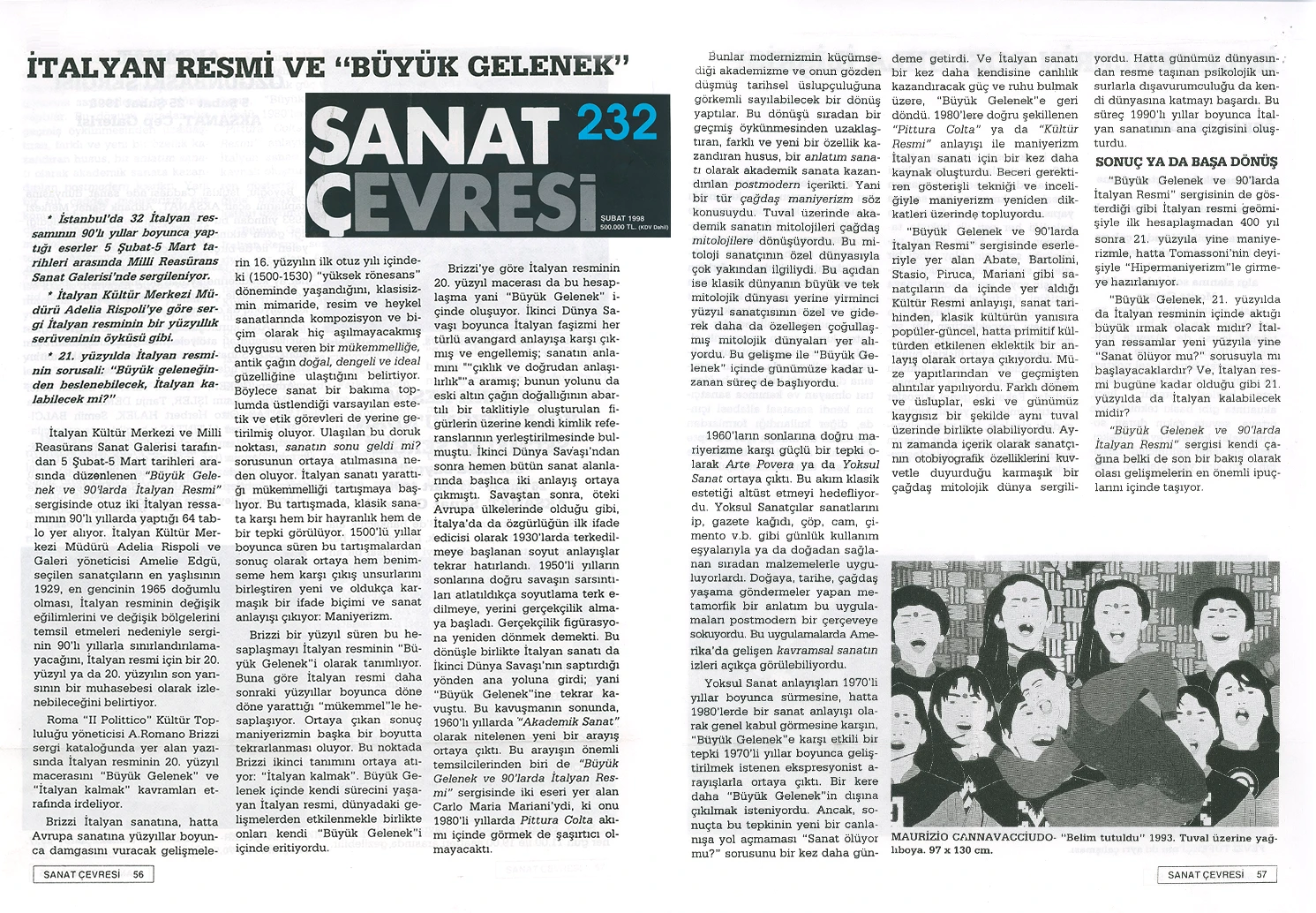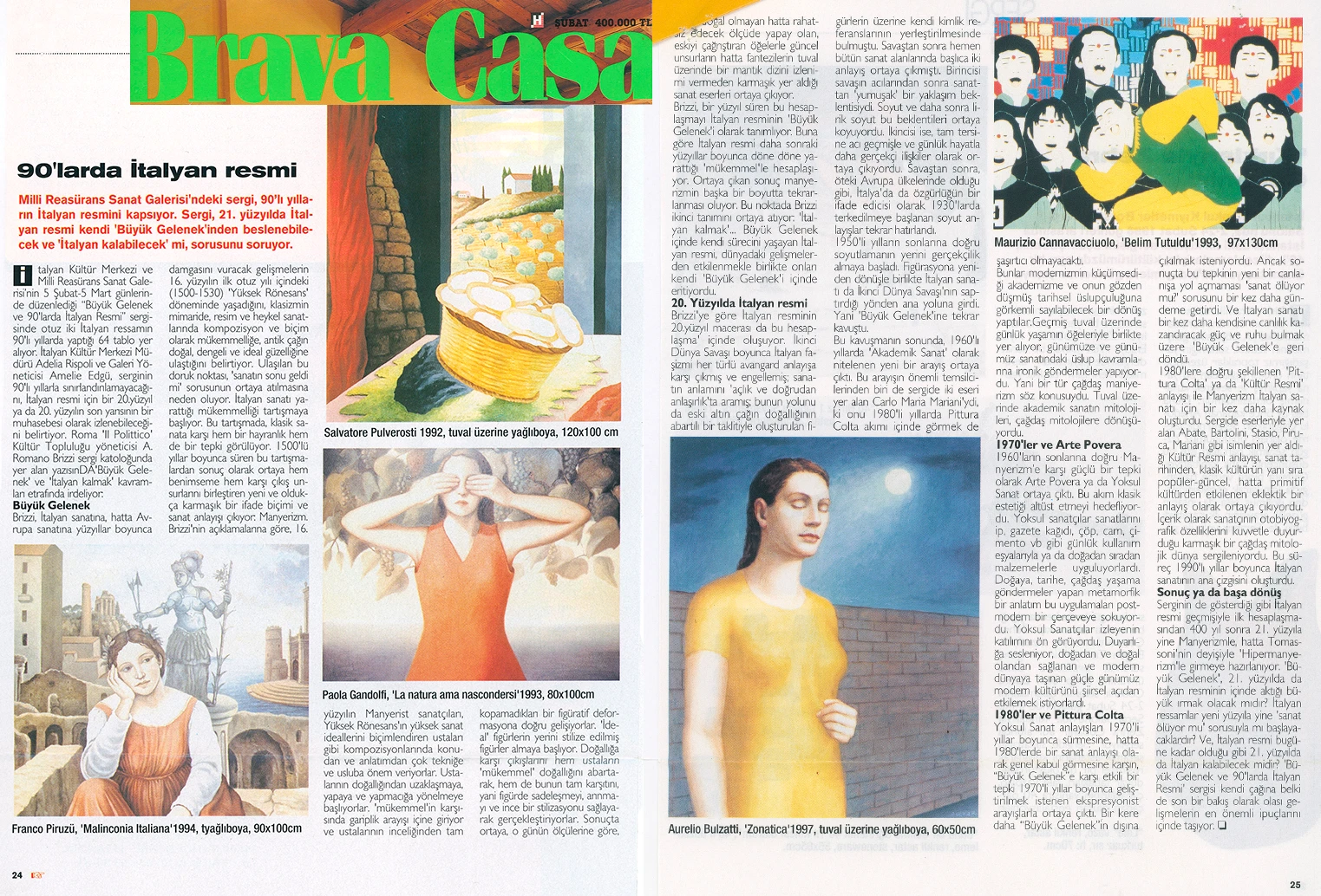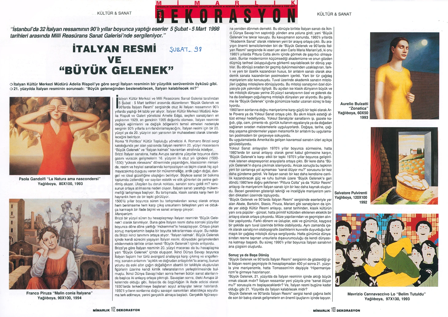 İtalyan Kültür Merkezi ve Millî Reasürans Sanat Galerisi tarafından 5 Şubat–5 Mart tarihleri arasında düzenlenen “Büyük Gelenek ve 90’larda İtalyan Resmi” sergisi otuz iki İtalyan ressamını toplu olarak görmek için çok iyi bir olanak sunuyor.