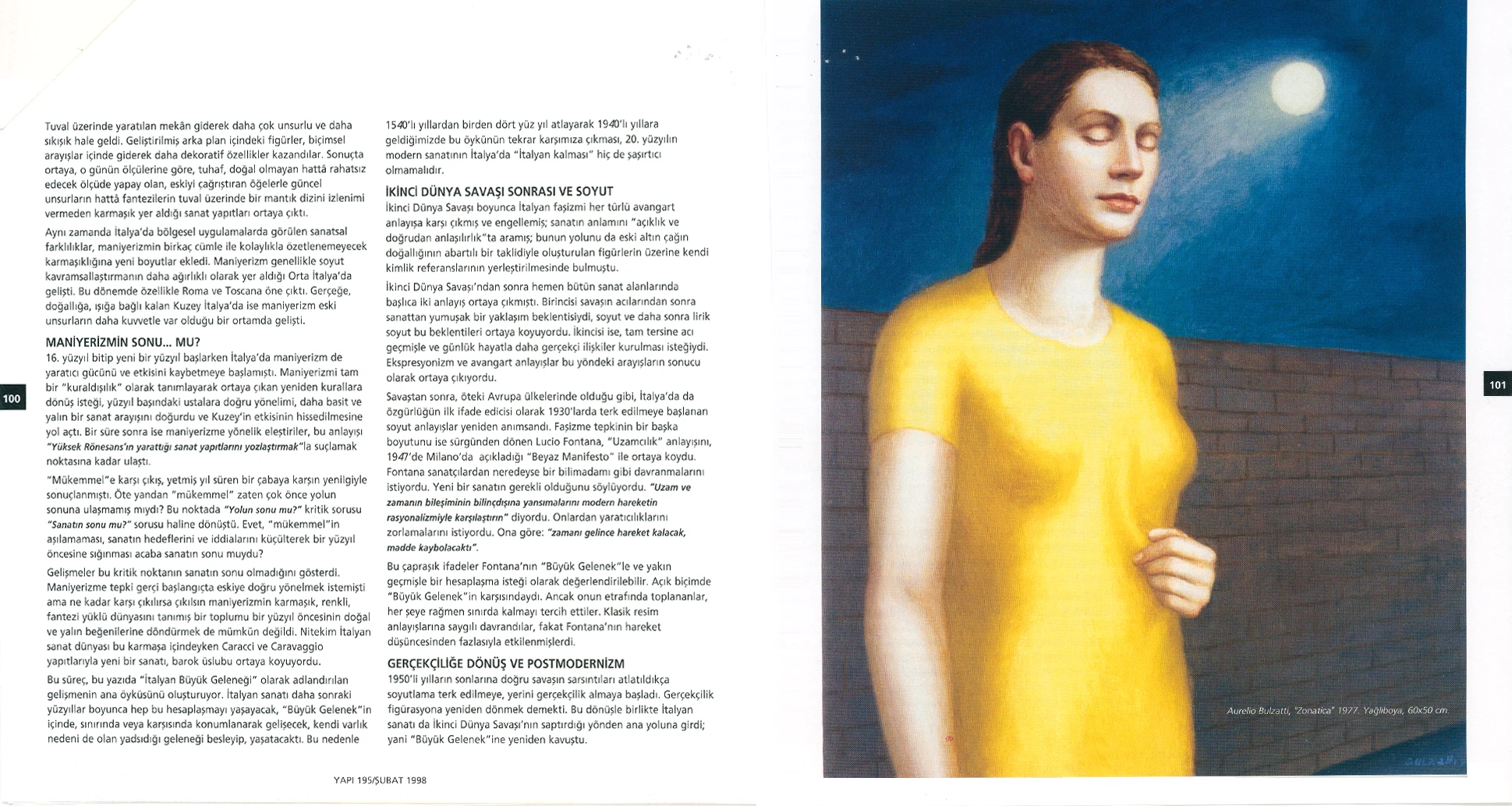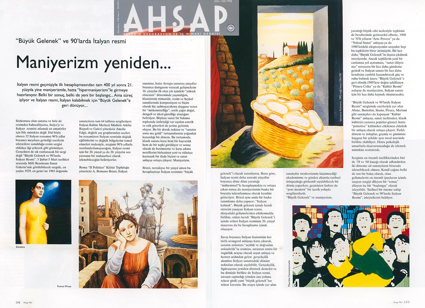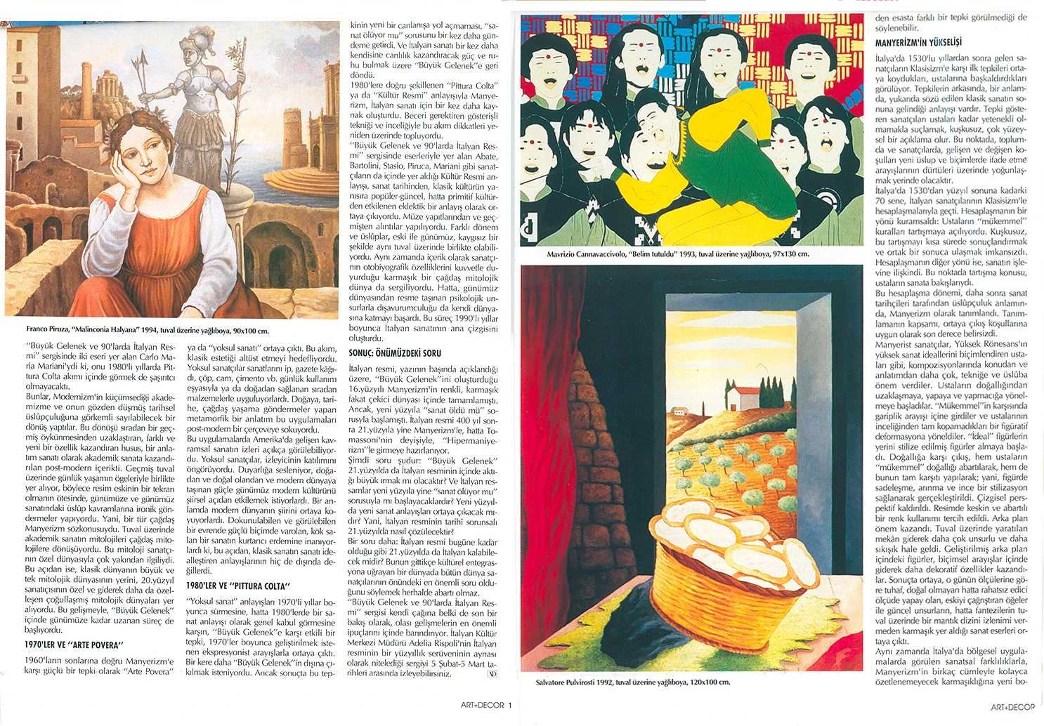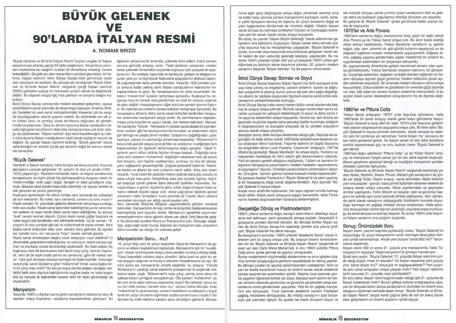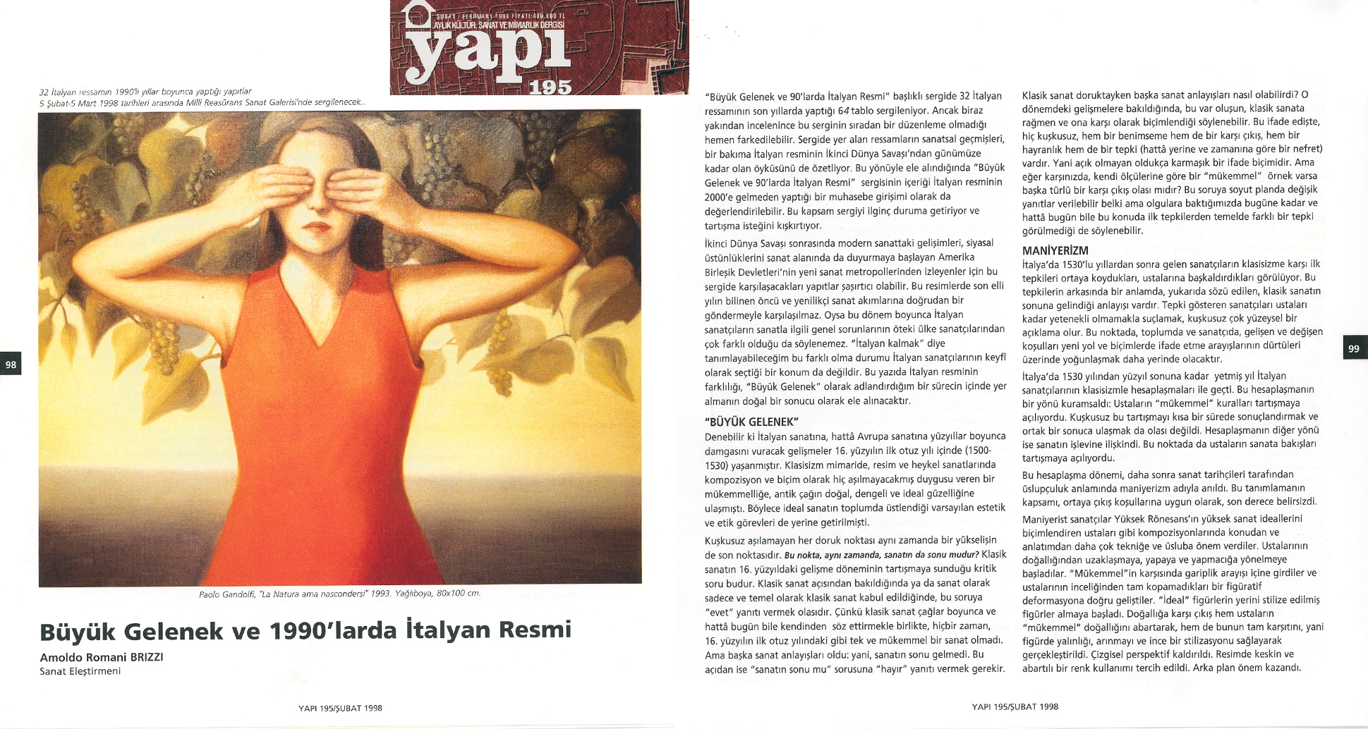 İtalyan Kültür Merkezi ve Millî Reasürans Sanat Galerisi tarafından 5 Şubat–5 Mart tarihleri arasında düzenlenen “Büyük Gelenek ve 90’larda İtalyan Resmi” sergisi otuz iki İtalyan ressamını toplu olarak görmek için çok iyi bir olanak sunuyor.