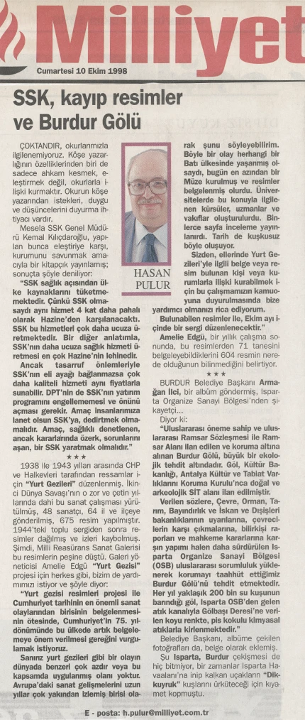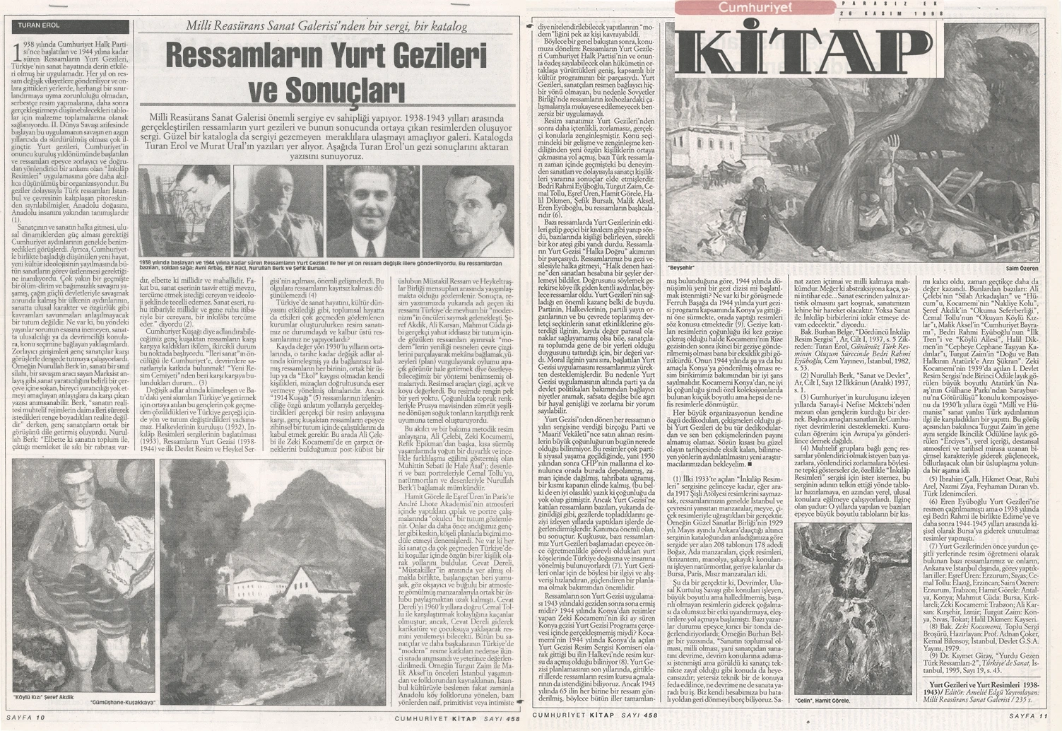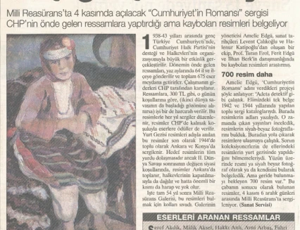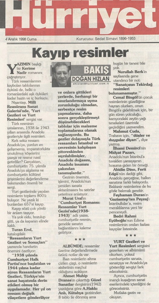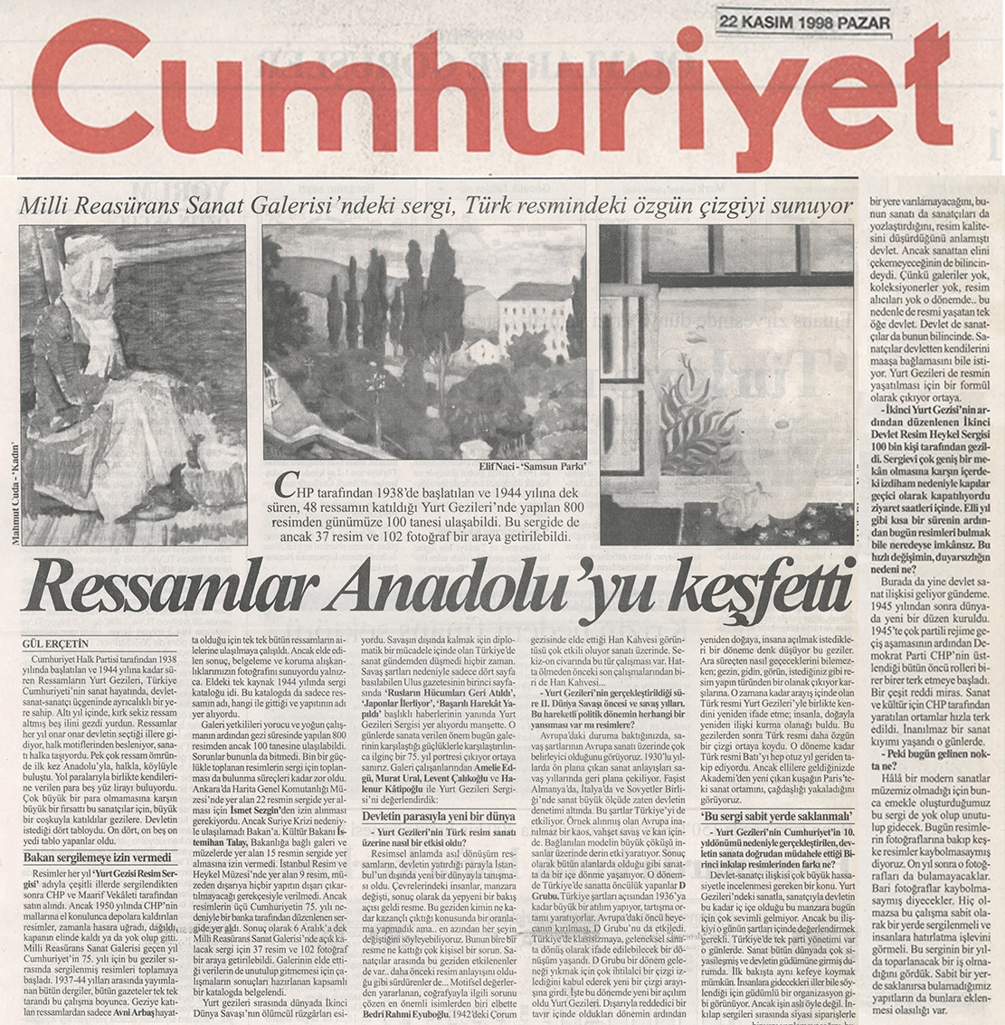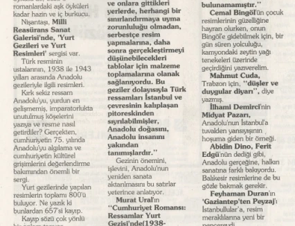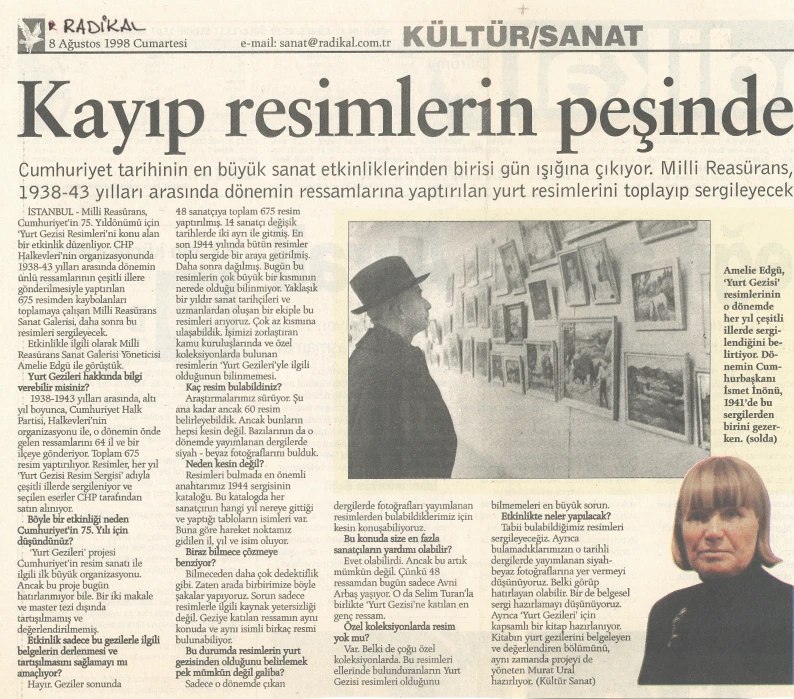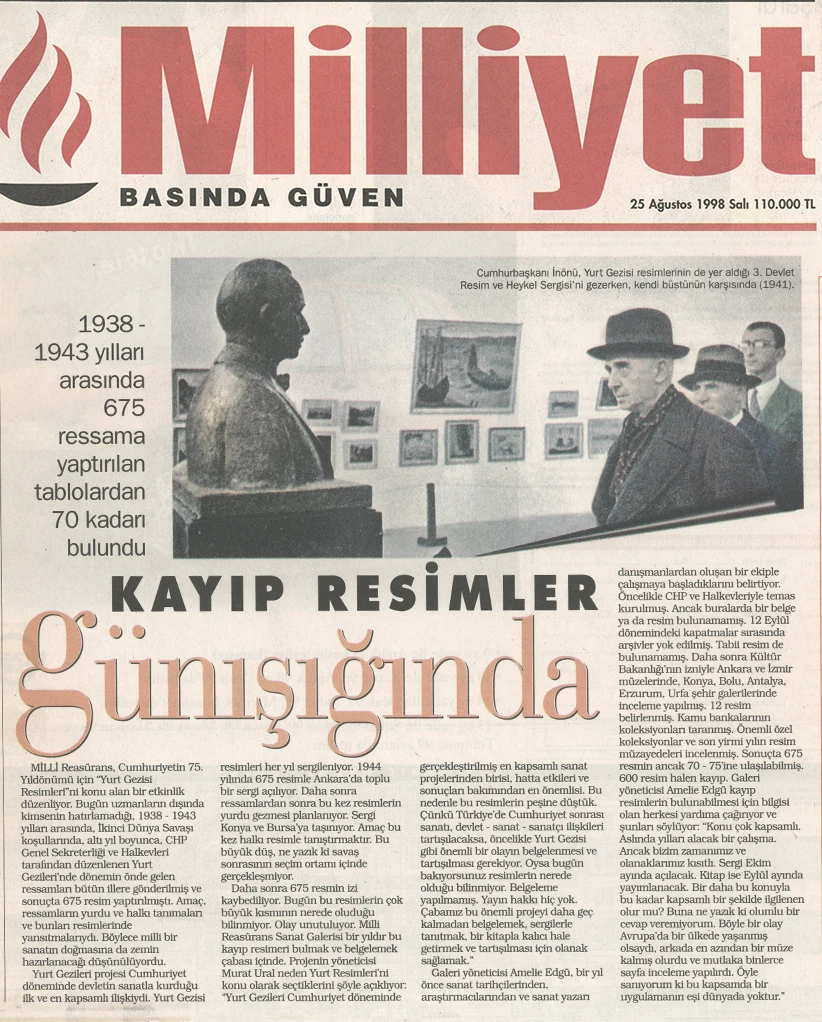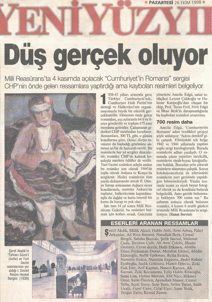 Yurt Gezileri’ne ilişkin bu eksikliği gidermeye yönelik en önemli adımlardan biri, Millî Reasürans Sanat Galerisi’nin 1998 yılında başlattığı araştırma ve sergi projesi olmuştur. Proje kapsamında 4 Kasım – 6 Aralık 1998 tarihleri arasında Amelié Edgü küratörlüğünde “Cumhuriyet’in Romansı: Yurt Gezileri (1938–1943)” başlıklı bir sergi düzenlenmiş; Yurt Gezileri sırasında üretilmiş resimler ve döneme ait fotoğraflar bir araya getirilmiş, ayrıca konunun farklı yönlerinin ele alındığı bir panel gerçekleştirilmiştir. Sergi hazırlıkları sürecinde yürütülen araştırmalar sonucunda, uzun yıllar kayıp olduğu düşünülen eserlerin izine ulaşılmış ve 75 resim yeniden tespit edilerek sanat tarihine kazandırılmıştır.