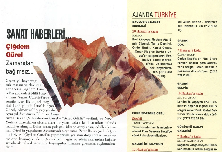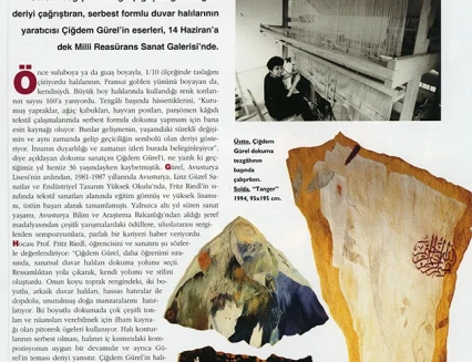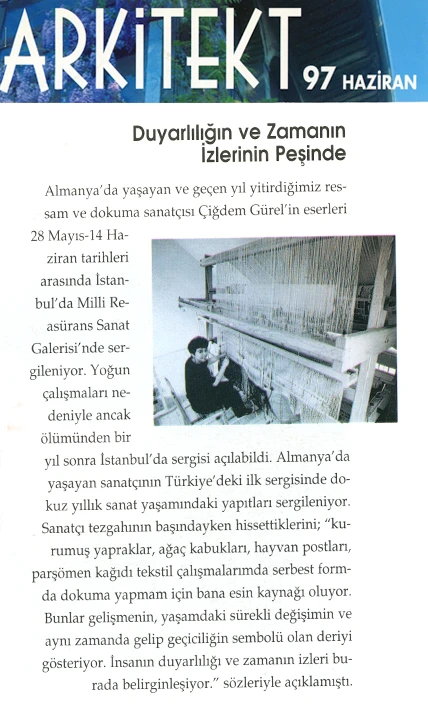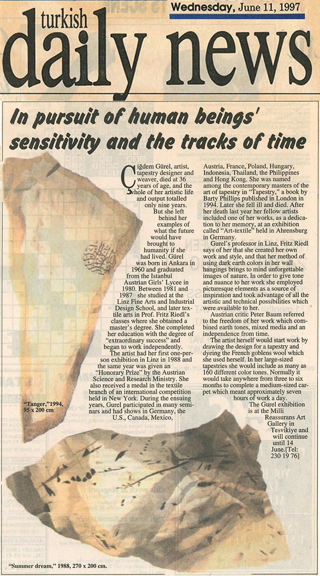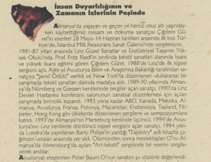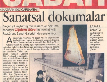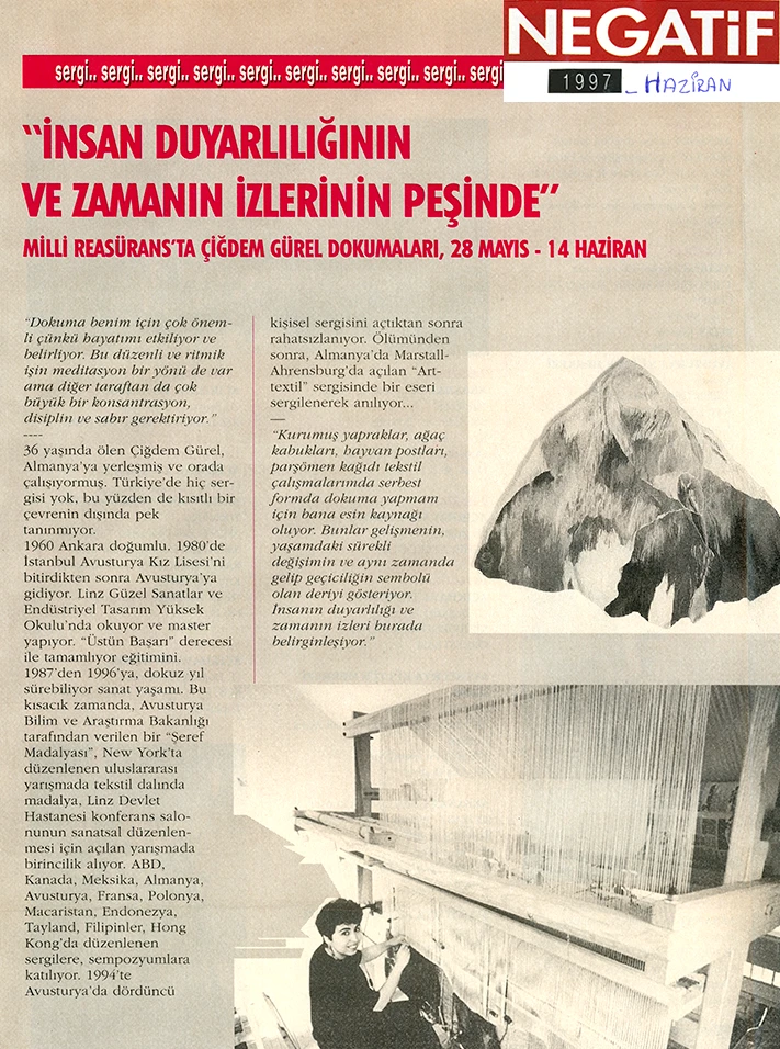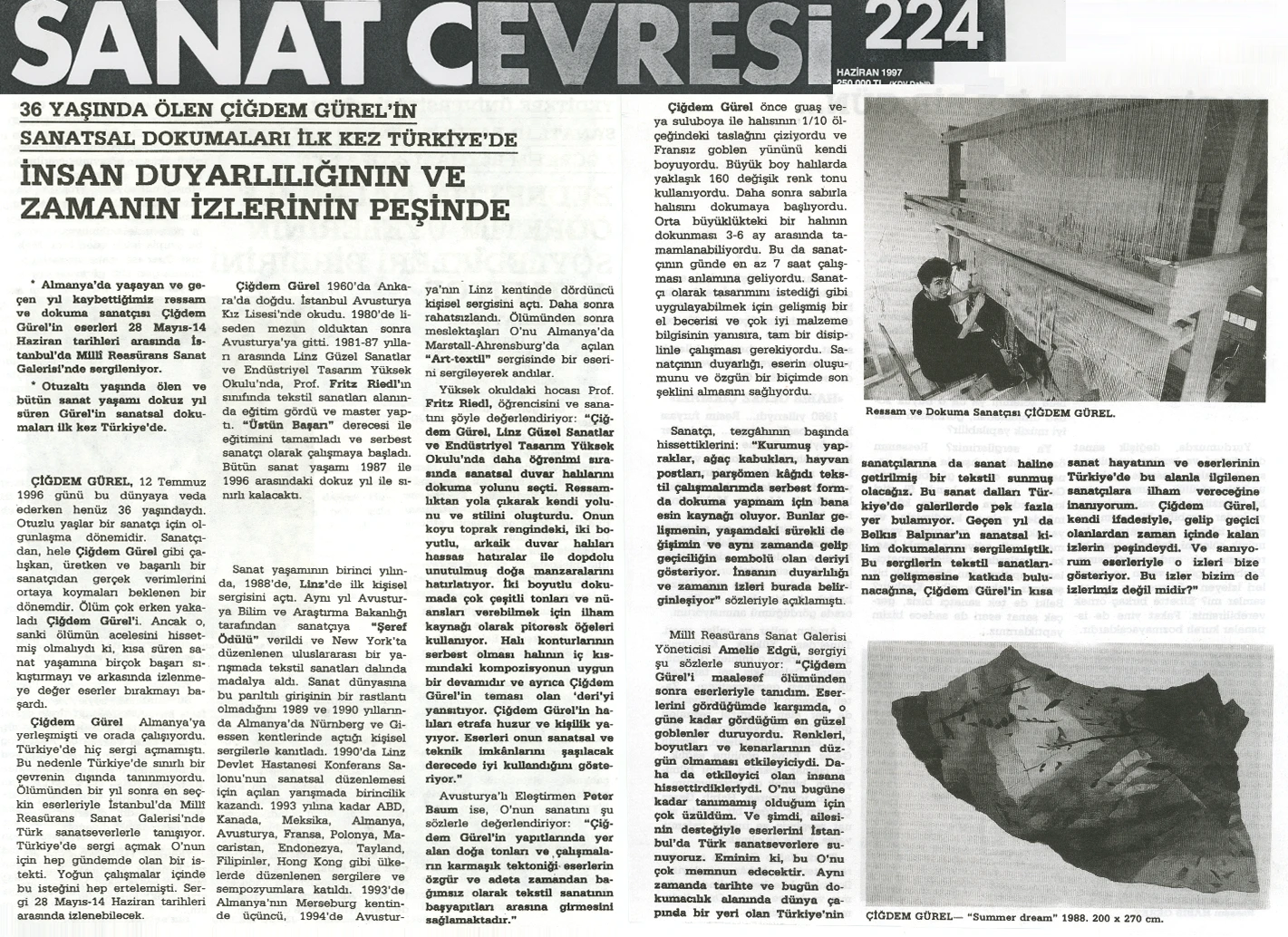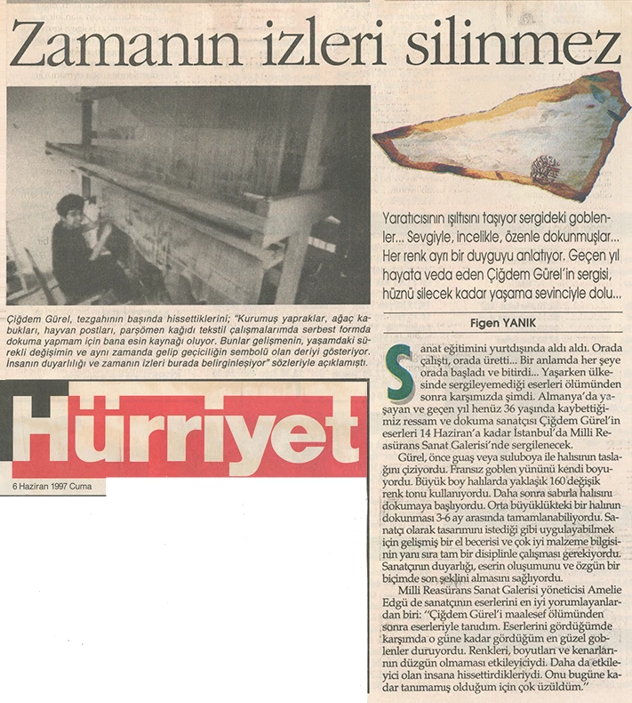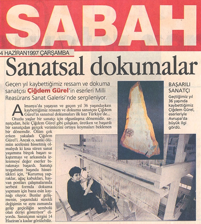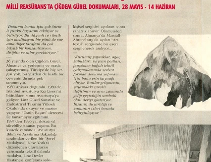 Almanya’da yaşayan ve 1996 yılında yitirdiğimiz ressam ve dokuma sanatçısı Çiğdem Gürel’in “Dokumalar ve Resimler” başlıklı sergisi 28 Mayıs – 14 Haziran 1997 tarihleri arasında Millî Reasürans sanat Galerisi’nde.
