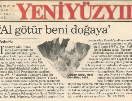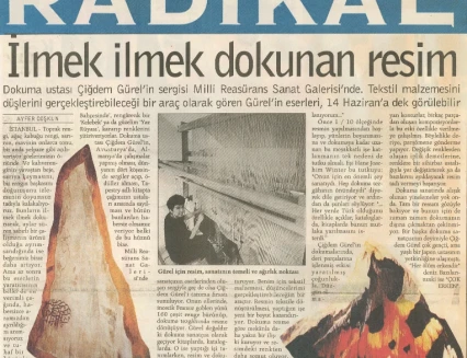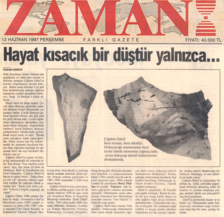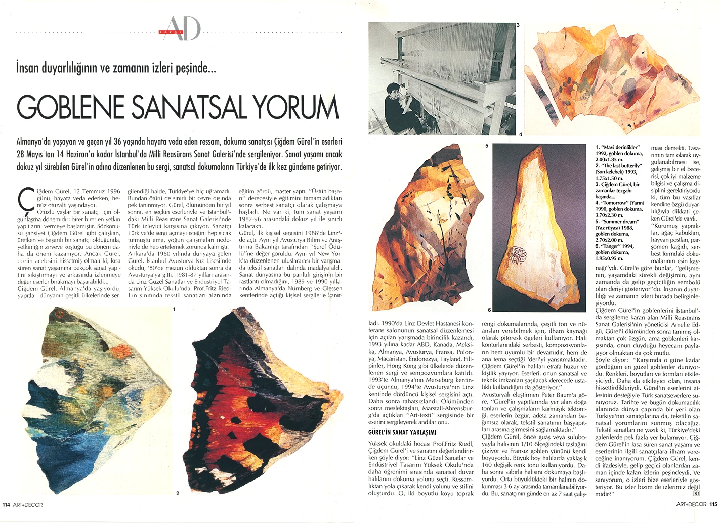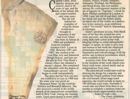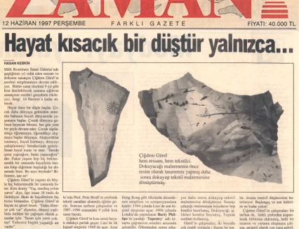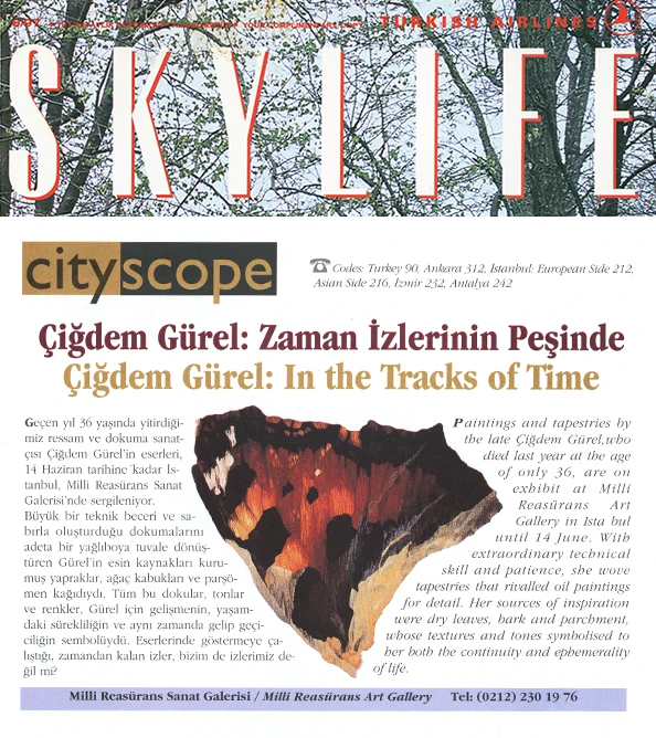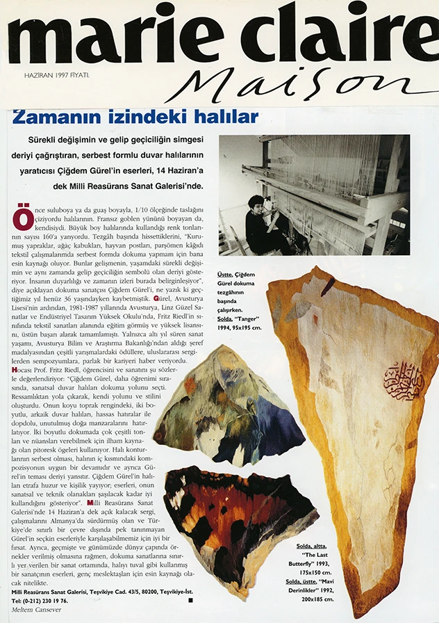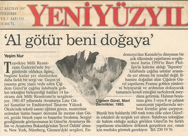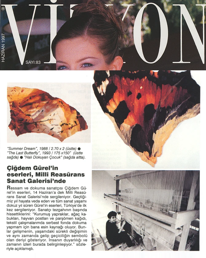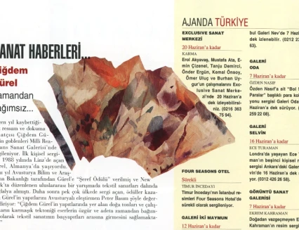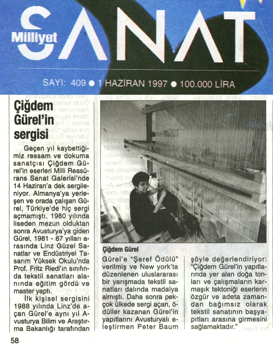 Almanya’da yaşayan ve 1996 yılında yitirdiğimiz ressam ve dokuma sanatçısı Çiğdem Gürel’in “Dokumalar ve Resimler” başlıklı sergisi 28 Mayıs – 14 Haziran 1997 tarihleri arasında Millî Reasürans sanat Galerisi’nde.