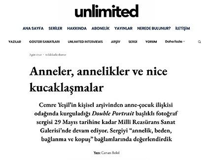 · Cemre Yeşil'in Millî Reasürans Sanat Galerisi'ndeki sergisi için hazırlanan yayının metni Ahu Antmen tarafından kaleme alındı. Bunun yanı sıra, Filbooks tarafından "Double Portrait" başlıklı bir fotoğraf-metin kitabı daha yayımlandı. Sergiyi ziyaret edenler, sergi mekânında bu sanatçı kitabını da görme imkânı bulacaklar.
