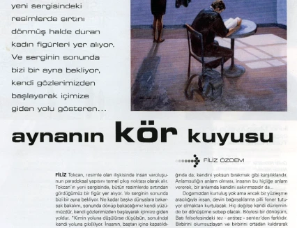 Filiz Özdem, sergi kataloğunda Filiz Tokcan'ın resimlerini şöyle değerlendiriyor: "Kadın ve seyir, bu sergide belirginleşen çıkış noktaları olarak görünür. Görünen budur. Görünüşün aldatıcılığı üstüne de bizi düşünmeye iten Tokcan; biçimden biçime girmeden ama içinden biçime akarak ters yüz etmeyi tercih eden bir tavrı resimlerinde hep taşımıştır. Filiz Tokcan'ın resminde seyirci olmak, sözcüğün kolaylıkla ve hemen çağrıştıracağı gibi edilgenliğe işaret etmez. Seyirci olmak, müdahil olmadan önce durmak, bakmak ve anlamak için neredeyse fenomenolojik bir tavırla gerçekliği parantez içine almaktır. Seyretmek zamandır. Adı süre olan geçişe tarihsellik kazandırmaktır. Bir bilim adamının gayreti ve sabrıyla, çevresinde büyük bir hızla değişen gerçekliği tasnif etmek, onun aidiyetine ve köküne kuşkuyla bakmaktır. Burada seyredilen dış dünya değil, insanın kendi içidir, biz her ne kadar kadının yüzünü görmesek de bellidir ki bir içe bakış, kendiyle hesaplaşma, kendi labirentlerine bakma vardır. Bir resimde yer alan açık giysi dolabı, bir diğerindeki cansız mankenlerin üstünde sergilenen giysiler, bir başkasında kadının çırılçıplak soyunup duvardaki gölgelere doğru meyletmesi de ayrıca dikkat çeker. Yüzleşmek soyunmaktır çünkü. Bir kabuk gibi bizi saran ve giyside simgeleştirilen her şeyden. Hatta gölgelerinden de soyunmak. Değil mi ki, gölgeler de hayatın giysileridir ya da Platon gibi söylersek (mağara alegorisindeki gibi) gölgeler hayatın özü değil yansısıdır."
