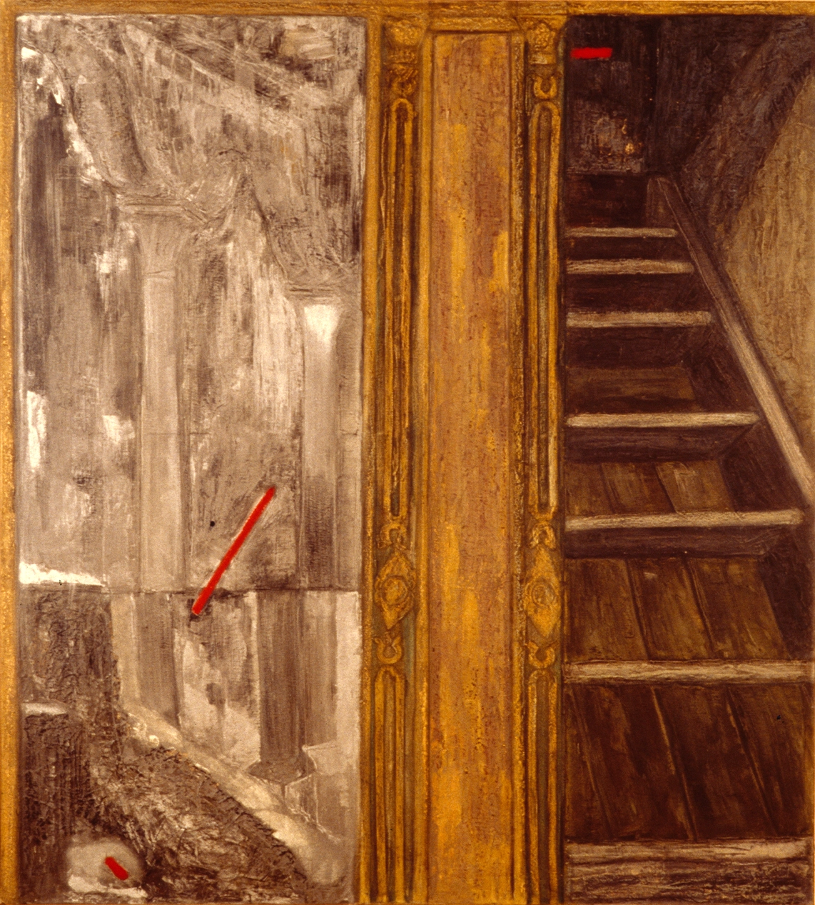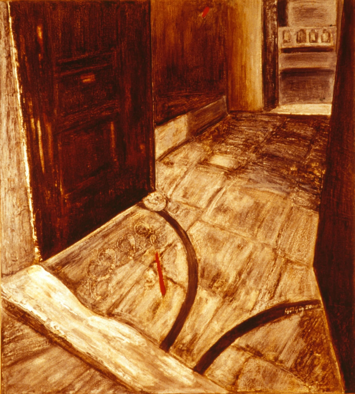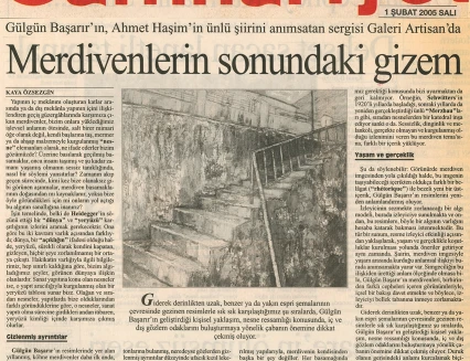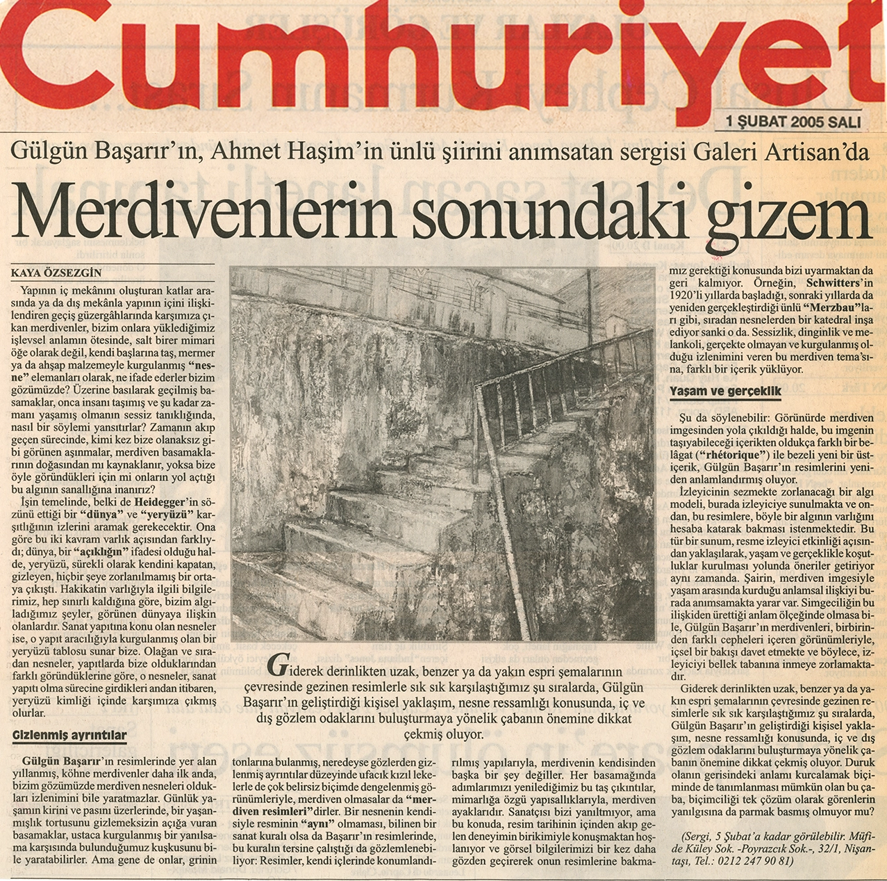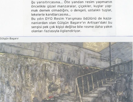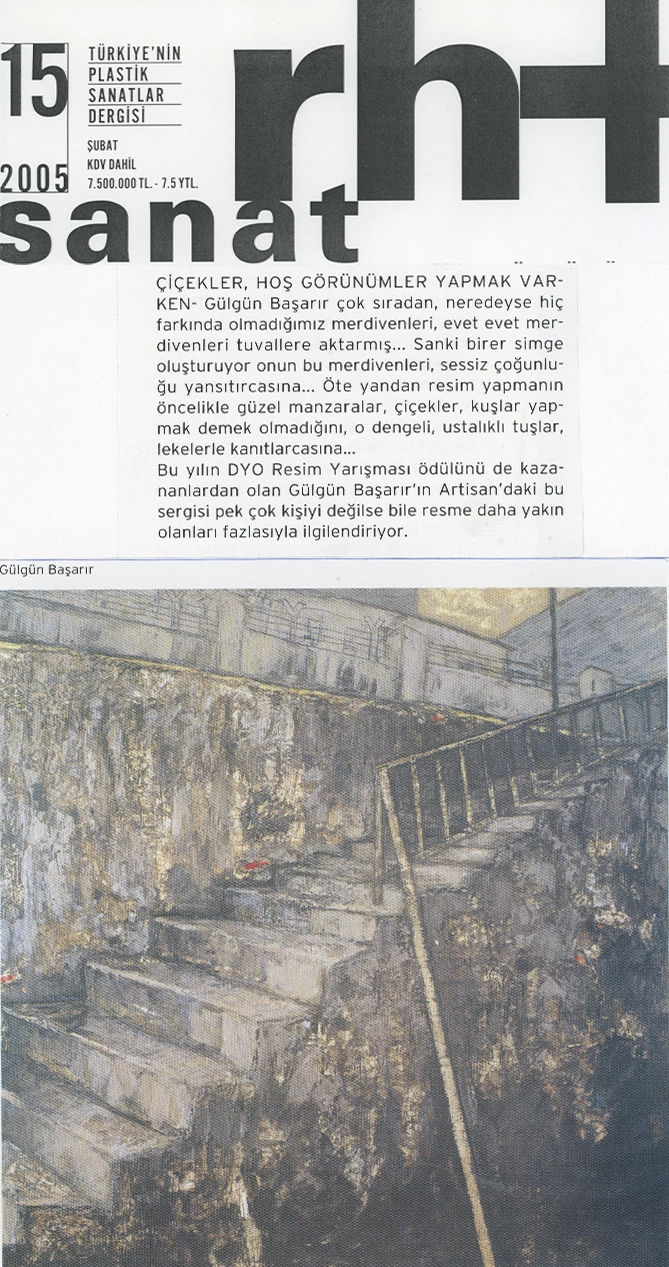 Resimsel bakışını ve resimlerinin ardındaki yaratıcı itkiyi, “Acısını içimde hissettiğim ve her gün değişik biçimde yaşadığım gerçek ilgilendiriyor beni” diye açıklayan sanatçı, önceki sergisinde güncel gerçekliklere yönelmişti. Penceresinden, kapı aralığından, koridordan ya da merdiven boşluğundan gördüğü bir ayrıntıyı tuvaline taşımıştı. Gri renklerin ağır bastığı, ışığın olmadığı ya da ancak süzülerek girebildiği donmuş bir dünyadan son derece gerçek ayrıntılar sanatçının resimlerinde görülen özellikler. Hepsinde insandan izler taşıyan ama insansız mekanlar, biraz önce terkedilmiş gibi. Ürkütücü değil yadırgatıcı resimlerdi bunlar. Tuvallerdeki kırmızı kesik çizgiler izleyenle resmin arasını daha da açıyordu. Sanatçı, ayrıntıdaki sıradan bir gerçeklikte “kendisine acı veren” gerçekliği resimlemişti. İzleyen bu insansız resimlerde kendisini arıyordu ya da kendi insanlık serüvenine doğru açılıyordu.