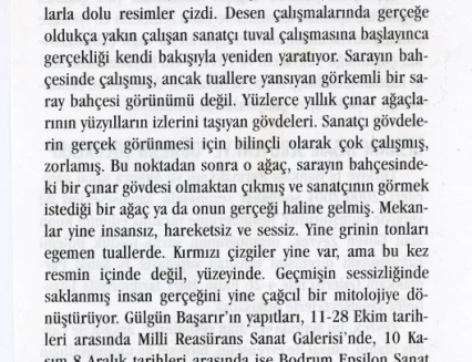 * İnsanı sessizliğiyle irkilten, yalnızlığıyla endişelendiren, yalınlığıyla içe döndüren, ve yıpranmışlığıyla hüzün veren, ayrıntıdaki bir gerçeklikten insanın kendi bütünsel serüvenini sorgulamasının kapılarını açan resimler bunlar.