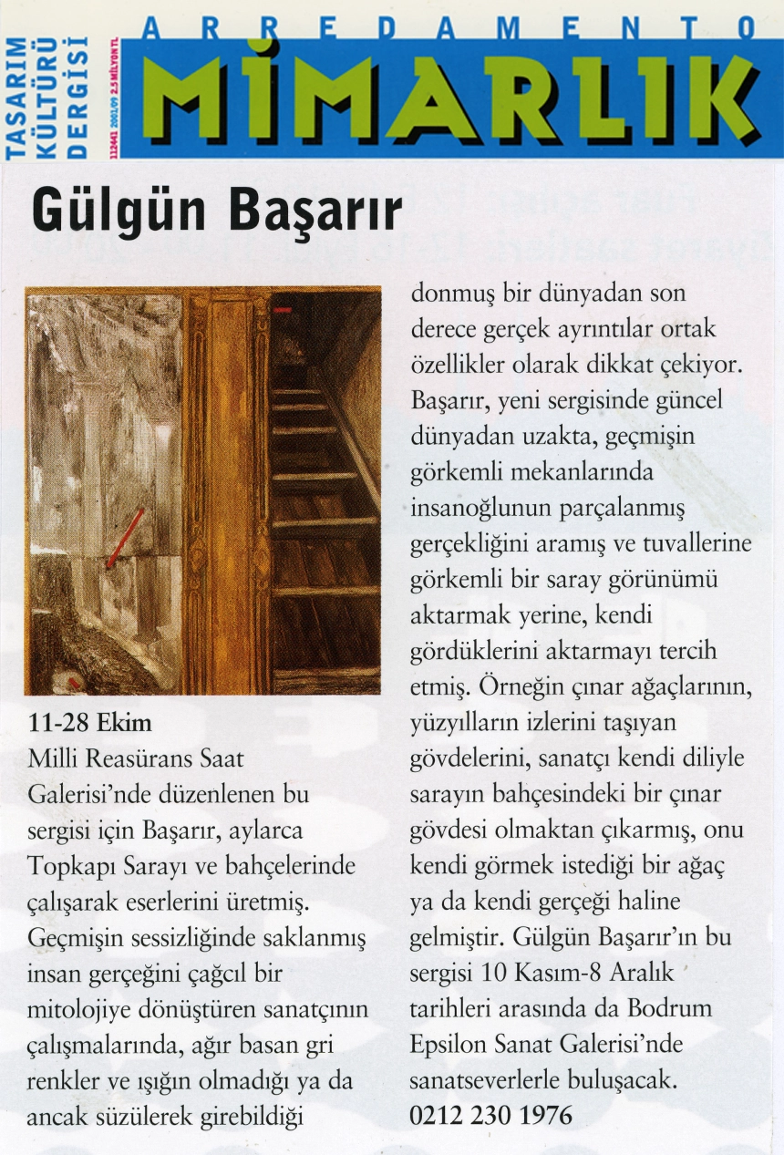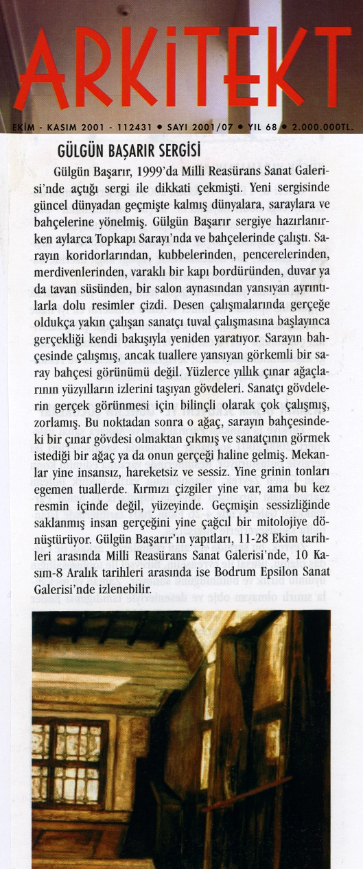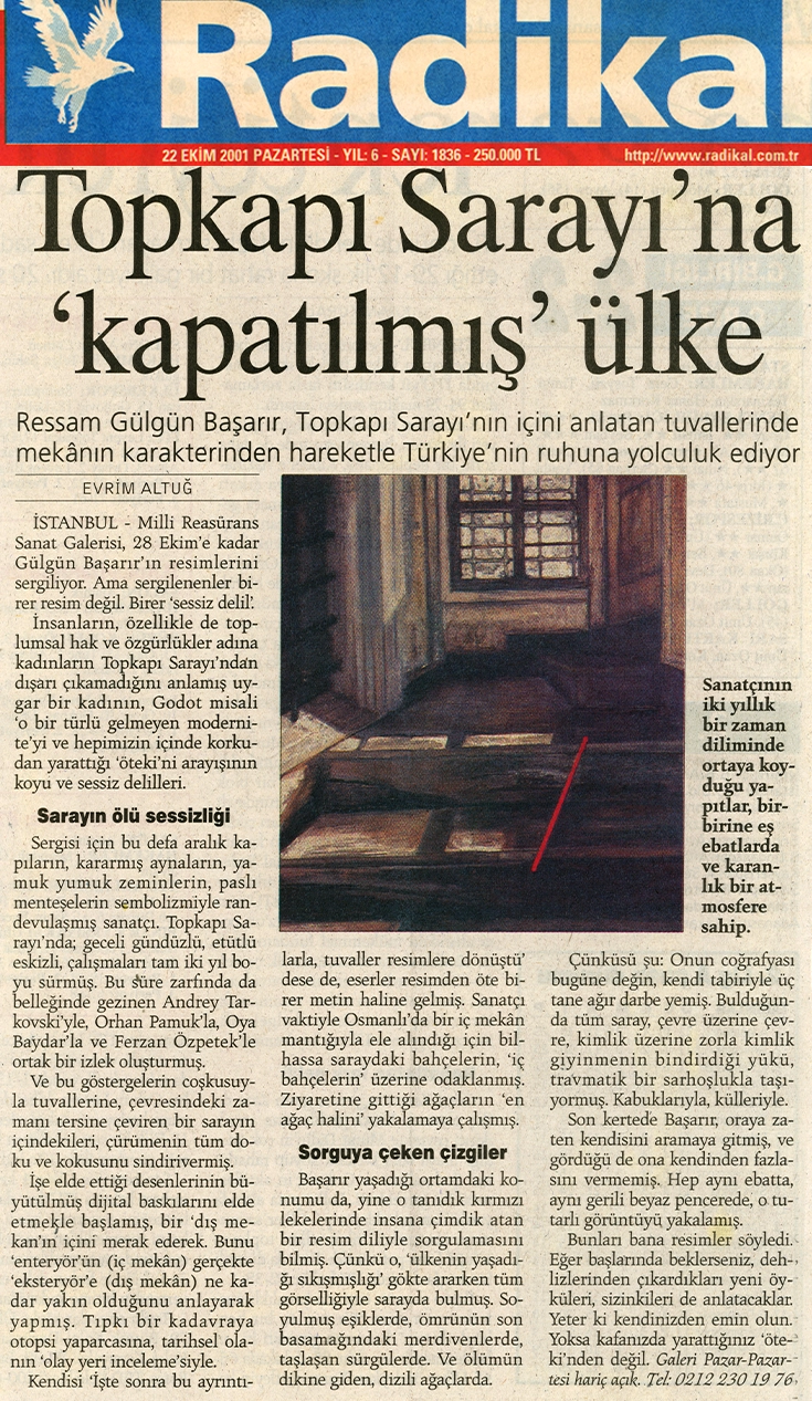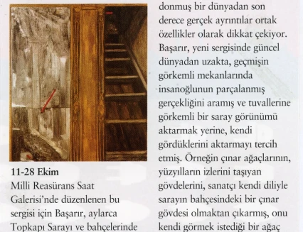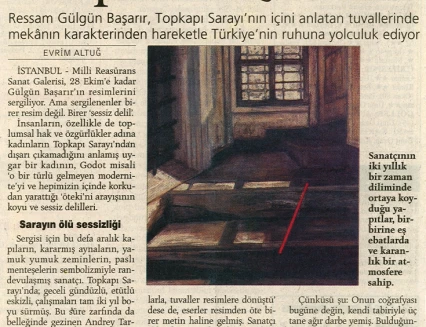 * Gülgün Başarır, iki yıl Topkapı Sarayı’nın mekanlarında ve bahçelerinde çalışarak hazırladığı sergisi geçmişin sessizliğinde saklanmış insan gerçeğini çağcıl bir mitolojiye dönüştürüyor.