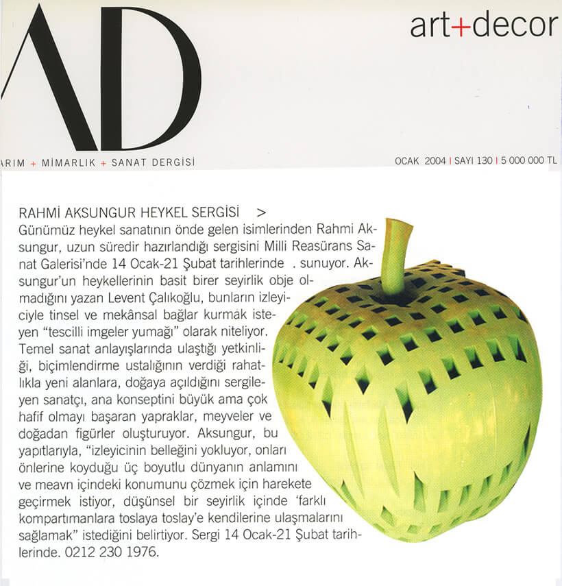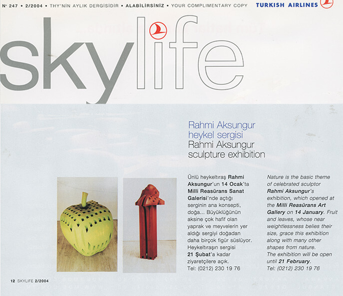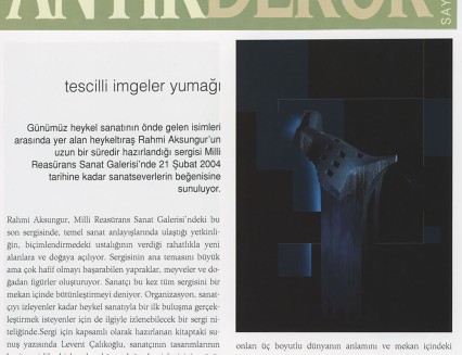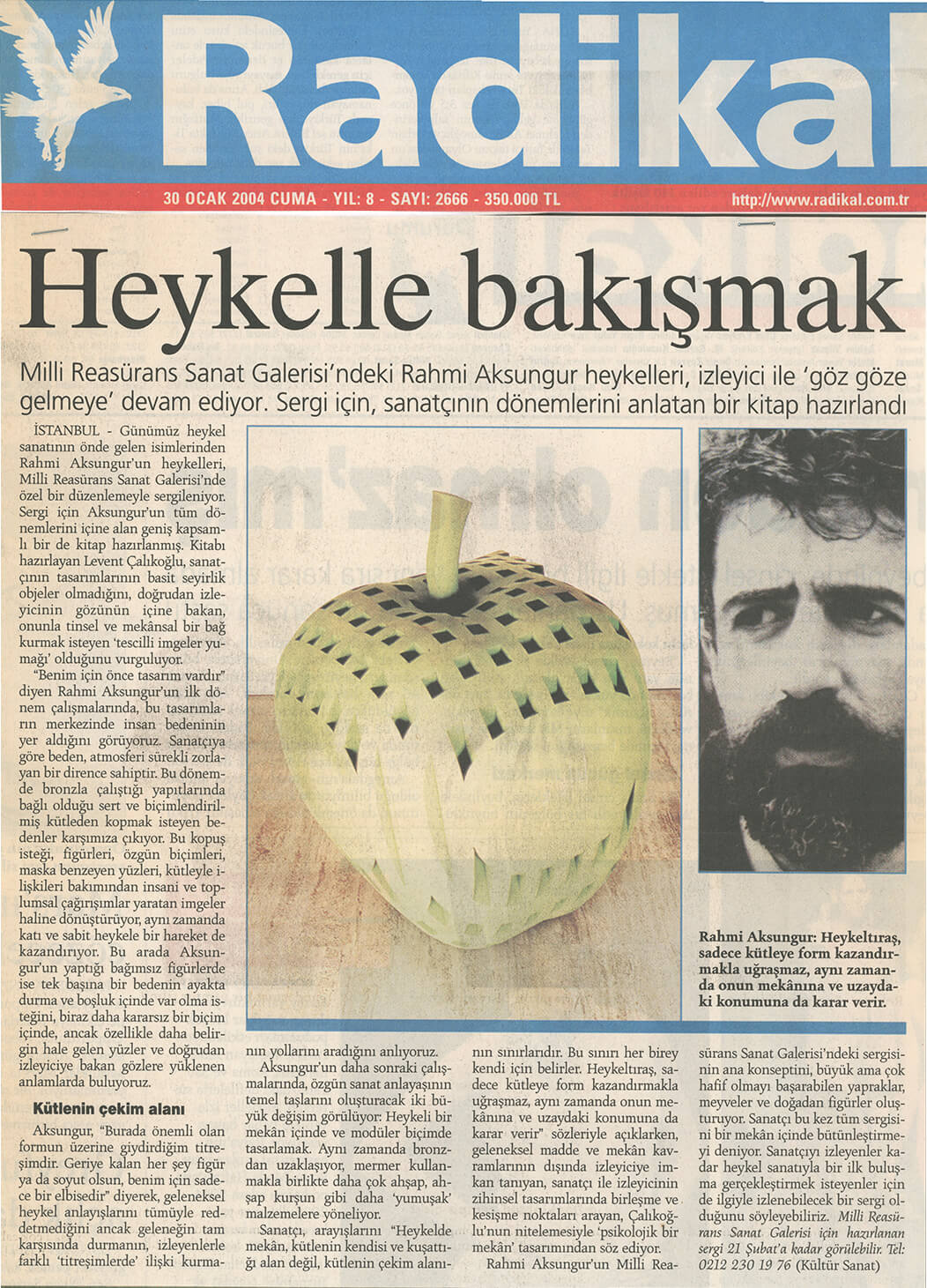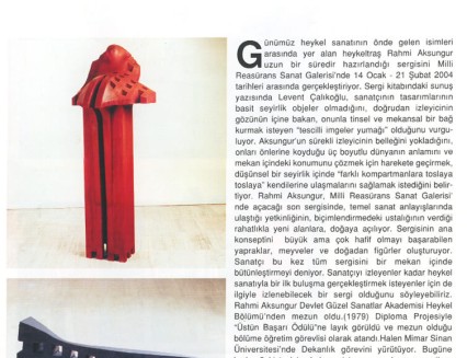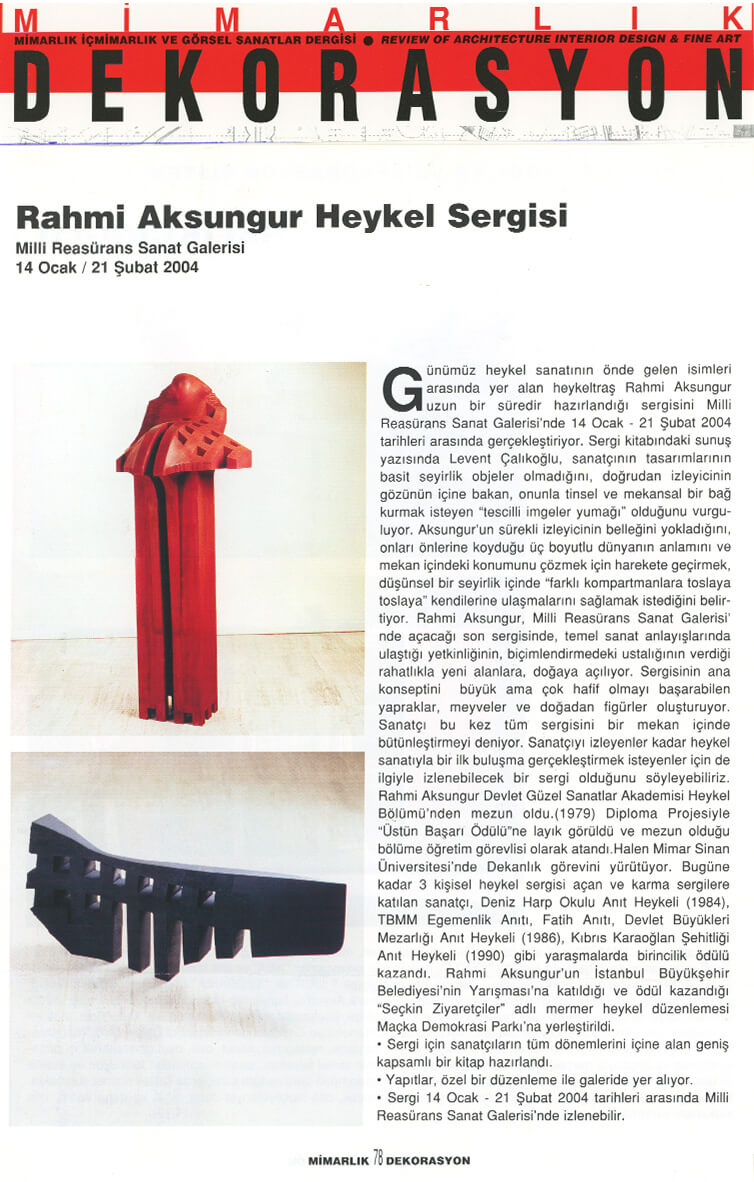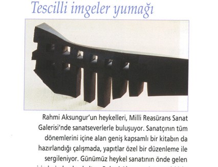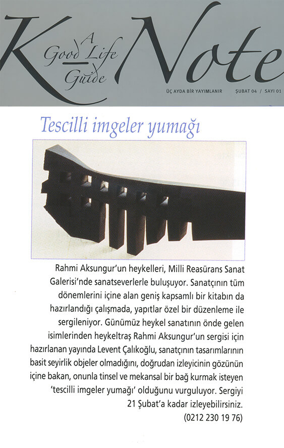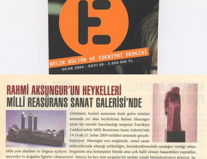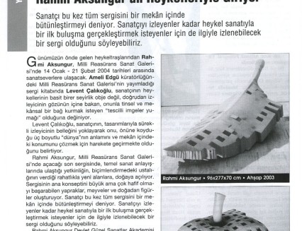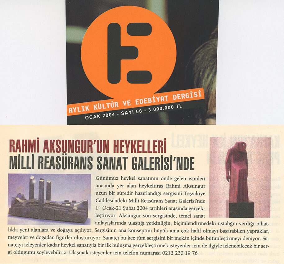 Günümüz heykel sanatının önde gelen isimleri arasında yer alan heykeltraş Rahmi Aksungur’un Milli Reasürans Sanat Galerisi için hazırladığı sergi, 14 Ocak - 21 Şubat 2004 tarihleri arasında izlenebilir.