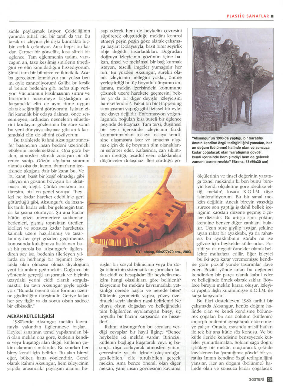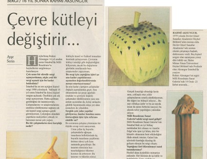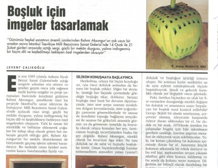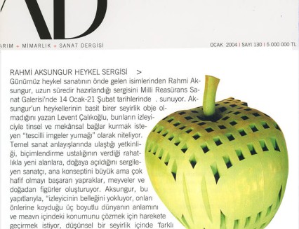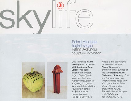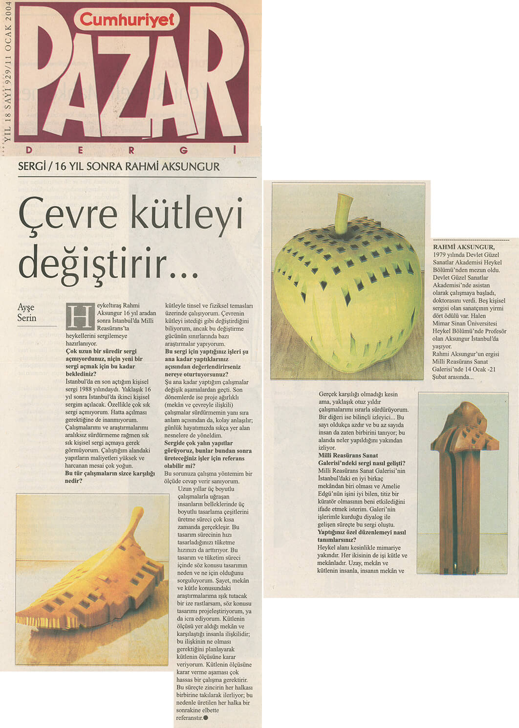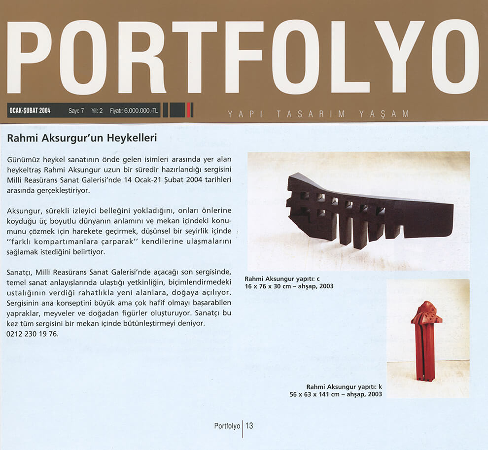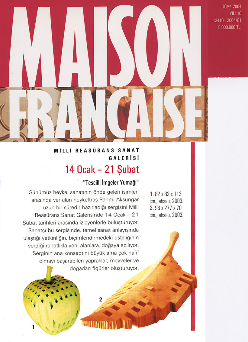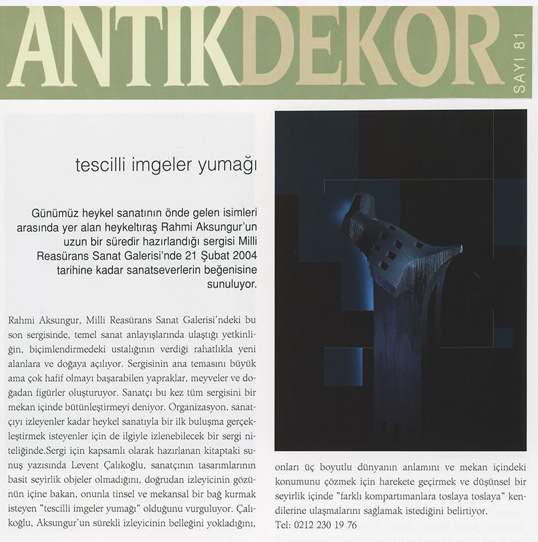 Günümüz heykel sanatının önde gelen isimleri arasında yer alan heykeltraş Rahmi Aksungur’un Milli Reasürans Sanat Galerisi için hazırladığı sergi, 14 Ocak - 21 Şubat 2004 tarihleri arasında izlenebilir.