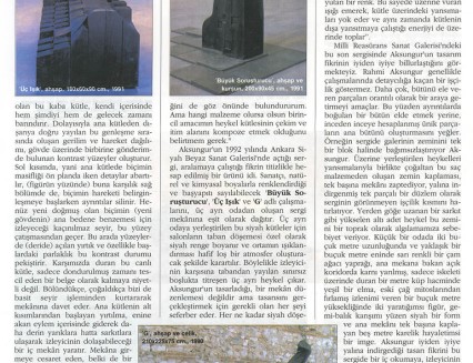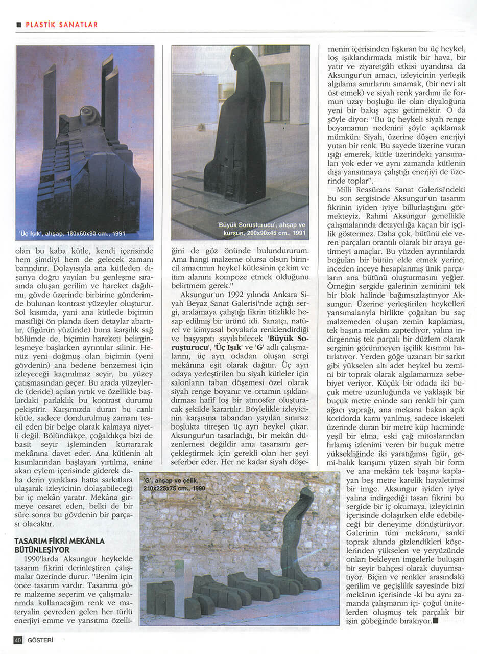 Aksungur’un sürekli izleyicinin belleğini yokladığını, onları önlerine koyduğu üç boyutlu dünyanın anlamını ve mekân içindeki konumunu çözmek için harekete geçirmek, düşünsel bir seyirlik içinde “farklı kompartımanlara toslaya toslaya” kendilerine ulaşmalarını sağlamak istediğini belirtiyor.