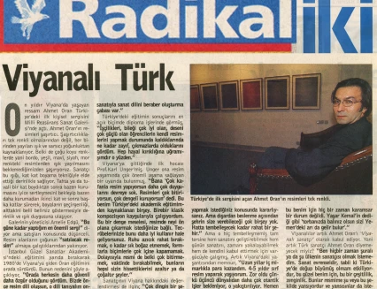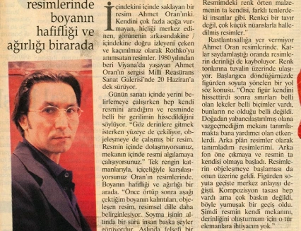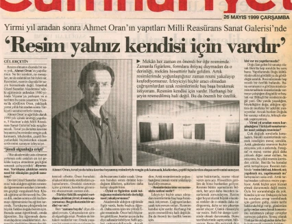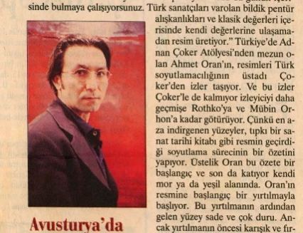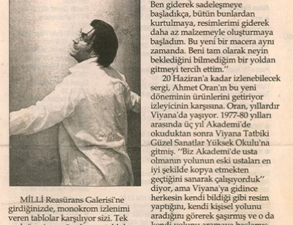 1980’den bu yana Viyana’da yaşayan ressam Ahmet Oran’ın yapıtları 11 Mayıs – 20 Haziran 1999 tarihleri arasında İstanbul Millî Reasürans Sanat Galerisi’nde.