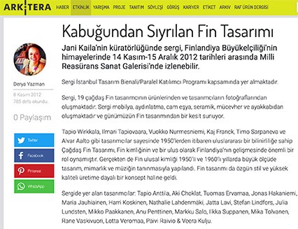 Jani Kaila’nin küratörlüğünde sergi, Finlandiya Büyükelçiliği’nin himayelerinde 14 Kasım-15 Aralık 2012 tarihleri arasında Milli Reasürans Sanat Galerisi’nde izlenebilir. Sergi İstanbul Tasarım Bienali/Paralel Katılımcı Programı kapsamında yer almaktadır.