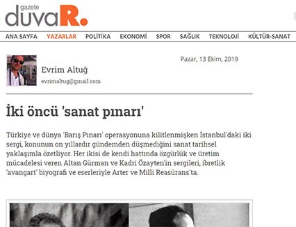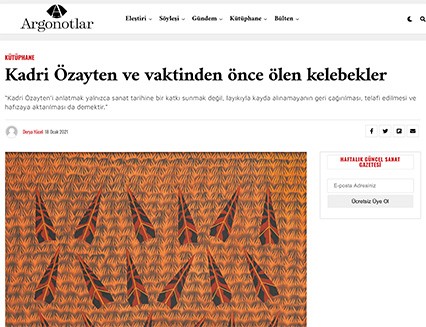 Millî Reasürans Sanat Galerisi’deki sergi ve ona eşlik eden katalog kronolojik düzende kurgulandı. 1970'lerin başından itibaren Kadri Özayten'in çalışması esasen kendi hayat hikayesine dayanan resim ve baskılarla belirlenir. Burada, duygu güdülü figüratif parçalar kişisel hayatını yansıtır. Ayrıca bu süre zarfında, sanatçının Anadolu ikonografisine olan ilgisi, geleneksel motiflerin modern estetikle kombinasyonu ile tanınabilir. Daha sonra, 1980'lerde ürettiği işleri sosyo-politik olayların neden olduğu kişisel travmalarla şekillenir. Burada, oldukça karanlık bir renk aralığının yanı sıra isimsiz, gözleri bağlı figürler genellikle geniş ve anonim manzaralarda karşımıza çıkar. Özayten’in kompozisyon algısı ve başkahramanına uyguladığı resimsel yaklaşımı yalınlaştırma, mimalize etme ve soyutlamaya yöneliktir. Bu aşama, sanatçının erken dönem çalışmaları ile daha sonra 1990’larda yaptığı, Balkan ve Körfez Savaşları’nın yanı sıra sosyal ve politik ulusal çatışmalara doğrudan tepki gösterdiği, genellikle disiplinlerarası çalışmaları arasında bir ara durak olarak da anlaşılabilir. Bu aynı zamanda Kadri Özayten’in resimlerinin yanı sıra kolaj, zaman ve mekana özgü yerleştirmeler ile Fluxus ve onun süreç odaklı üretim metodlarından etkilenmiş eserlere ağırlık verdiği bir dönemdir. Bu dönemde nesnesiz sanat ve video sanatı üzerine yaptığı deneyler de bulunmaktadır. Öte yandan 1990’lar Özayten’in külliyatının ana sembollerinin ortaya çıktığı bir süreçtir: Kelebekler, çakıl taşları, kağıttan uçaklar ve kamuflaj dokusu onun umut ve savaş karşıtı kişisel ikonası haline gelmiştir. Nitekim, savaş ve krizin sanatçının etrafındaki dünyayı sarstığı bu son derece gergin dönemde, güçlü sosyo-politik ilgisi ve samimi insancıl görev duygusu işini ileriye taşıyan ana güçlerdir. 2000 sonrasında sanatçı tekrar resime odaklanır ve 40 senelik araştırma ve yoğun çalışmasının sanatsal çabalarını özetlediği, büyük eserlerden oluşan önemli bir seri üretir.