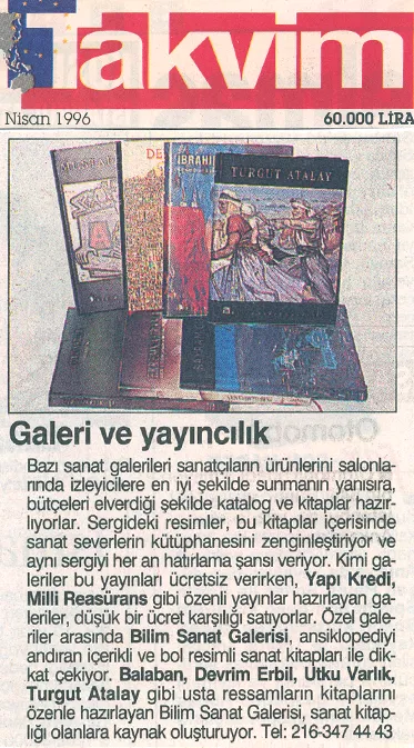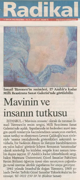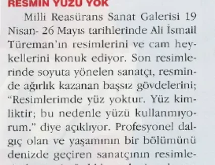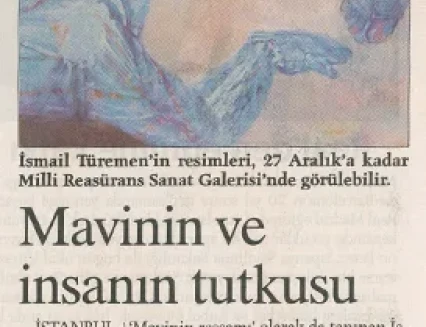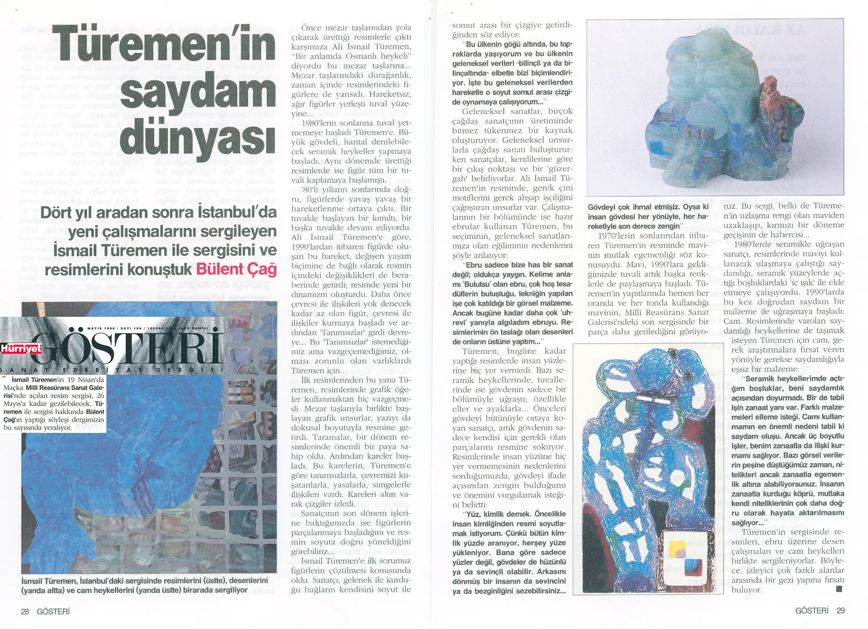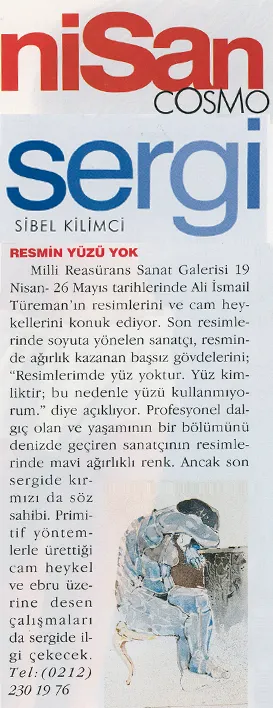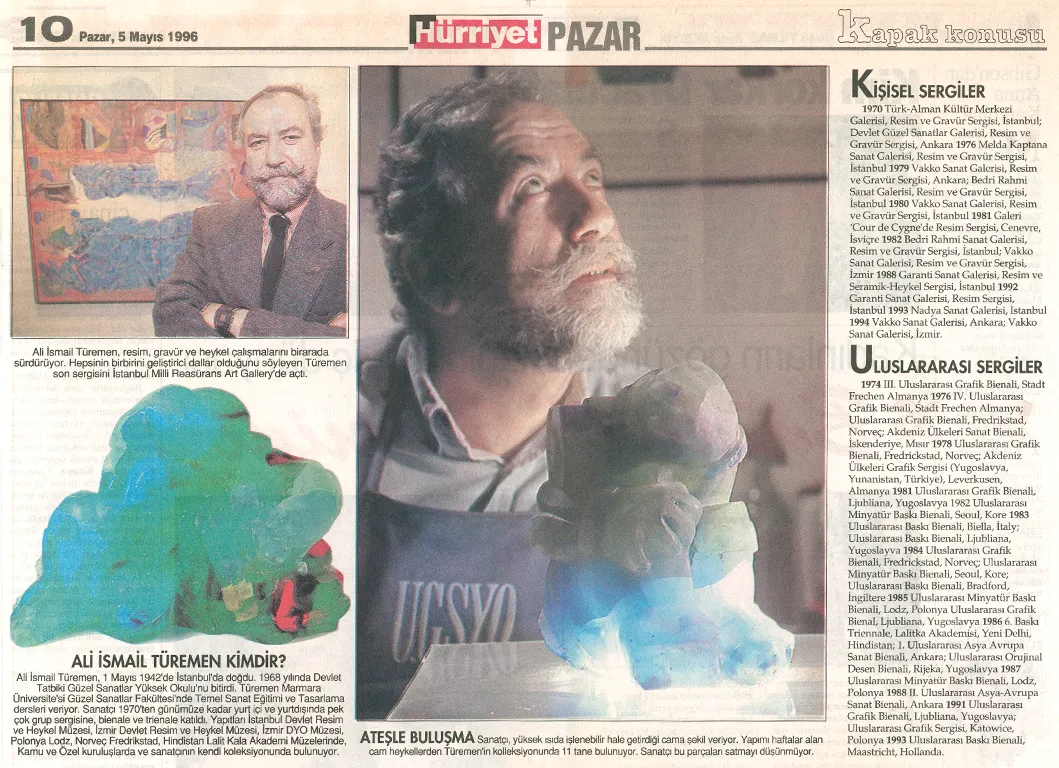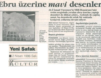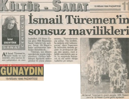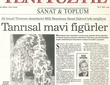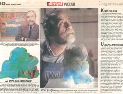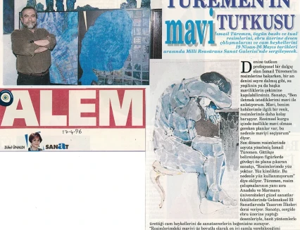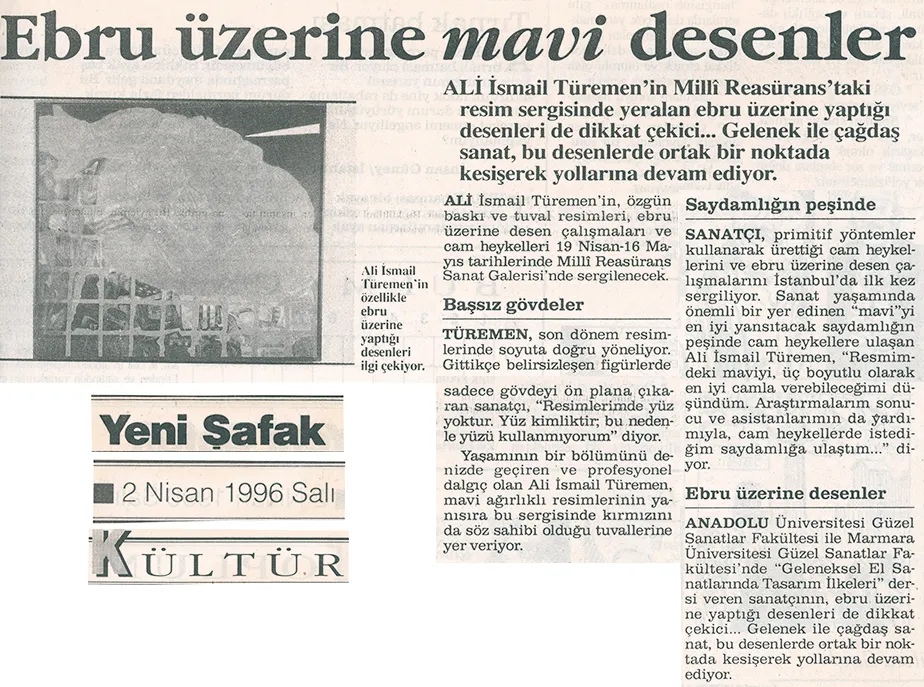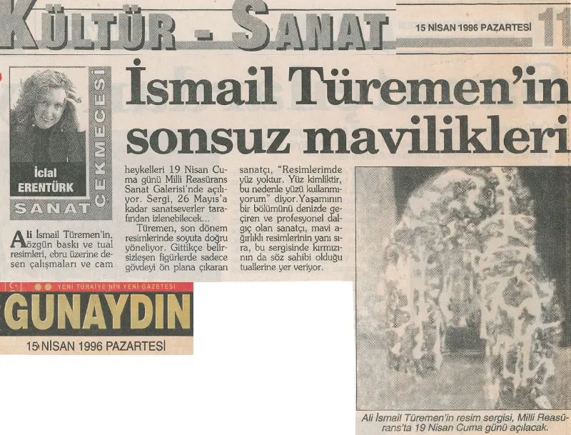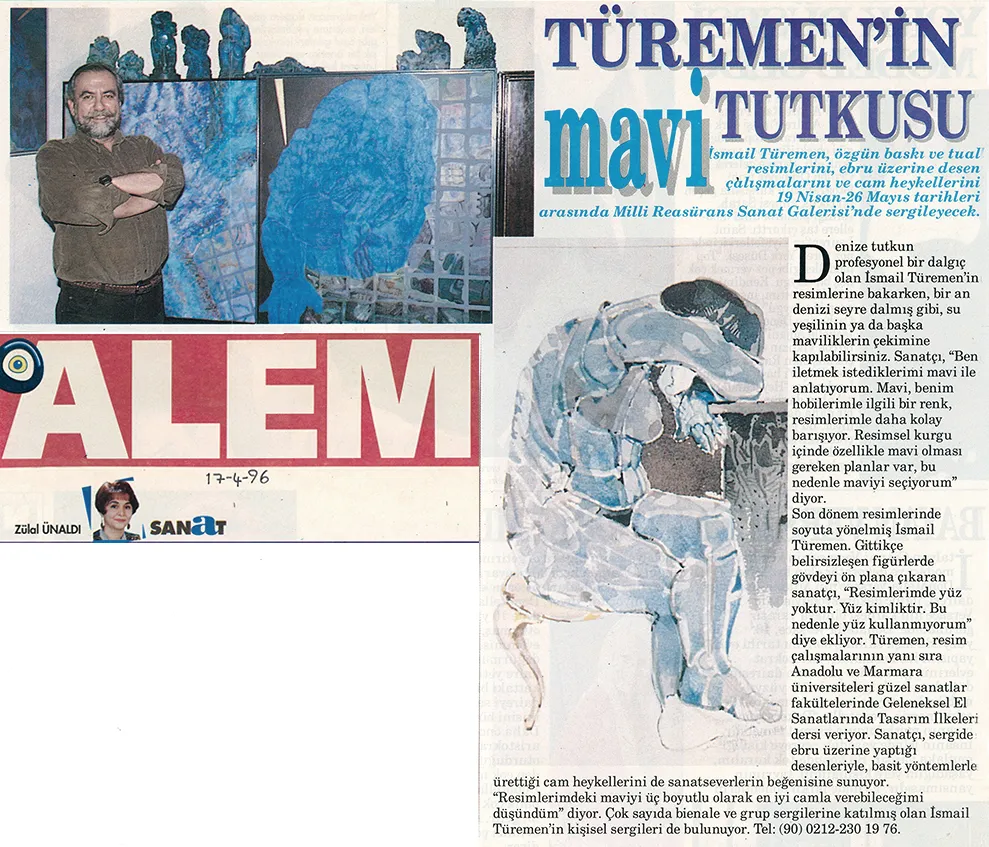 Sanatını “Mavi Figür” ve çevresine kurduğu resimsel düzenlemeler üzerinde yoğunlaştıran Ali İsmail Türemen, tuval, gravür, cam heykel ve ebru üzerine desenlerini 19 Nisan - 26 Mayıs 1996 tarihleri arasında Milî Reasürans Sanat Galerisi’nde sergiliyor.