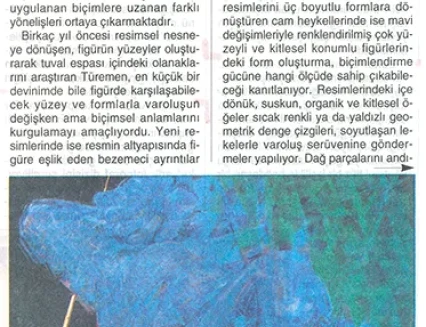 Başlangıcından günümüze titizlikle savunduğu resimsel öğeleri tüm çalışmalarında ödün vermeden savunan Türemen, bu sergisinde “tanımsızlar” temasını yığın oluşturmadan ana yüzeylere dağıtarak “Mavi Figür”ü ile bir araya getiriyor. Tuvallerindeki yüzeysel söylemini farklı malzemelere üç boyutta uygulayarak önce seramikte sonra cam da deniyor. Camın verdiği etki ile ışıklı ve mavi heykeller, sanatçının resimlerinden ayrılmış birer ana parça gibi etkili görünüme sahiptirler. Ebru üzerine uyguladığı figürlerinde ise yine yarı heykel yarı tanrısal “Mavi Figür”ü gerçeklikle gerçek dışı arasında bir yerlerdedir. Büyük boyutlu tuvallerinde de veya gravürlerinde de kompozisyonlarında zengin doku ve renk coşkuları izleyenlerin gözünden kaçmaz.