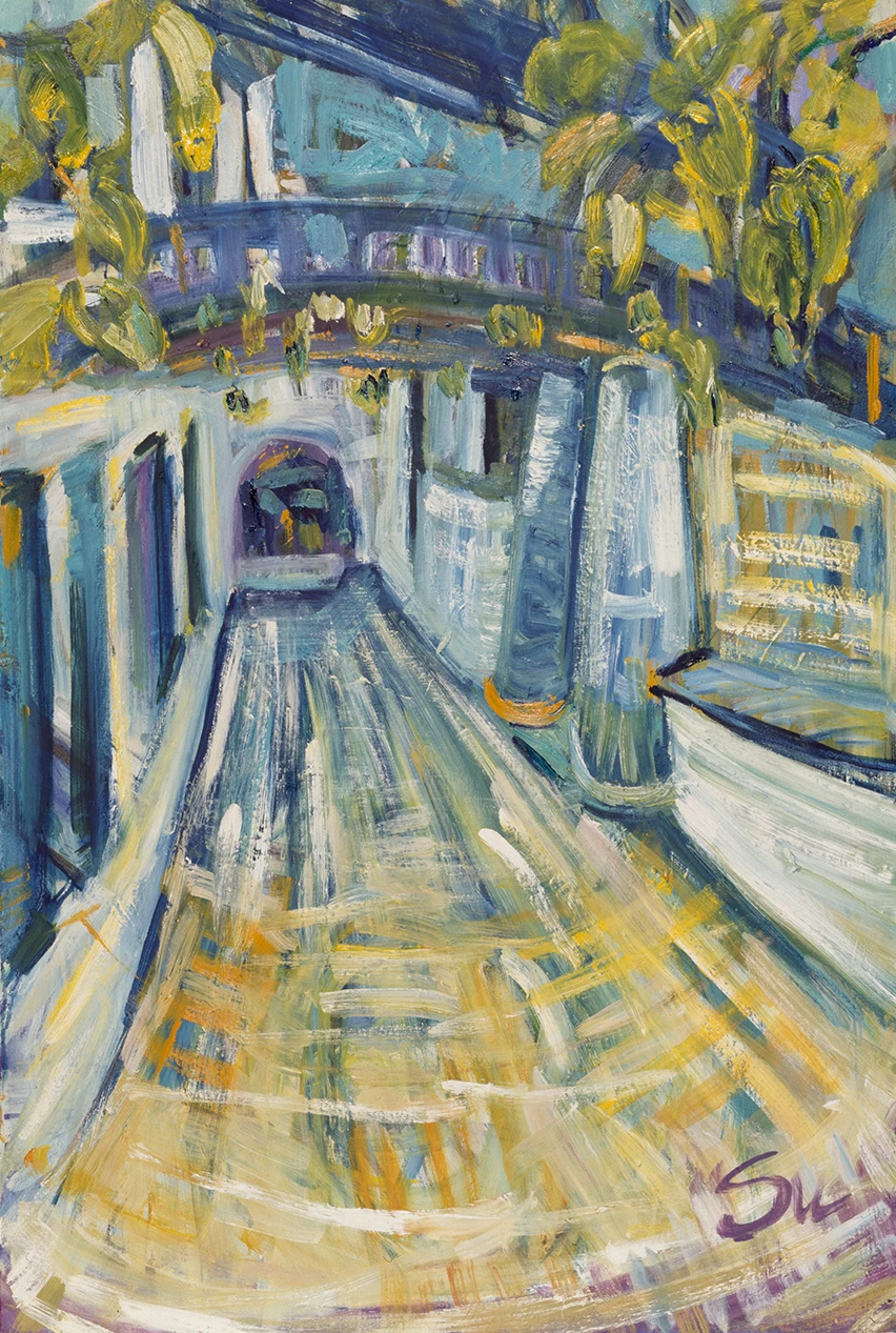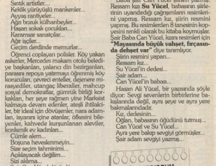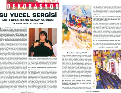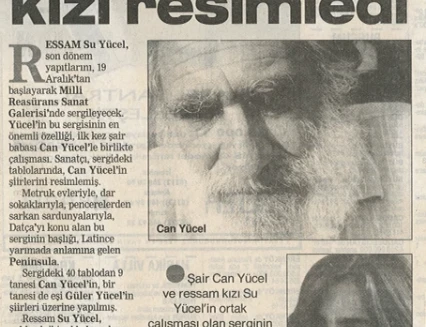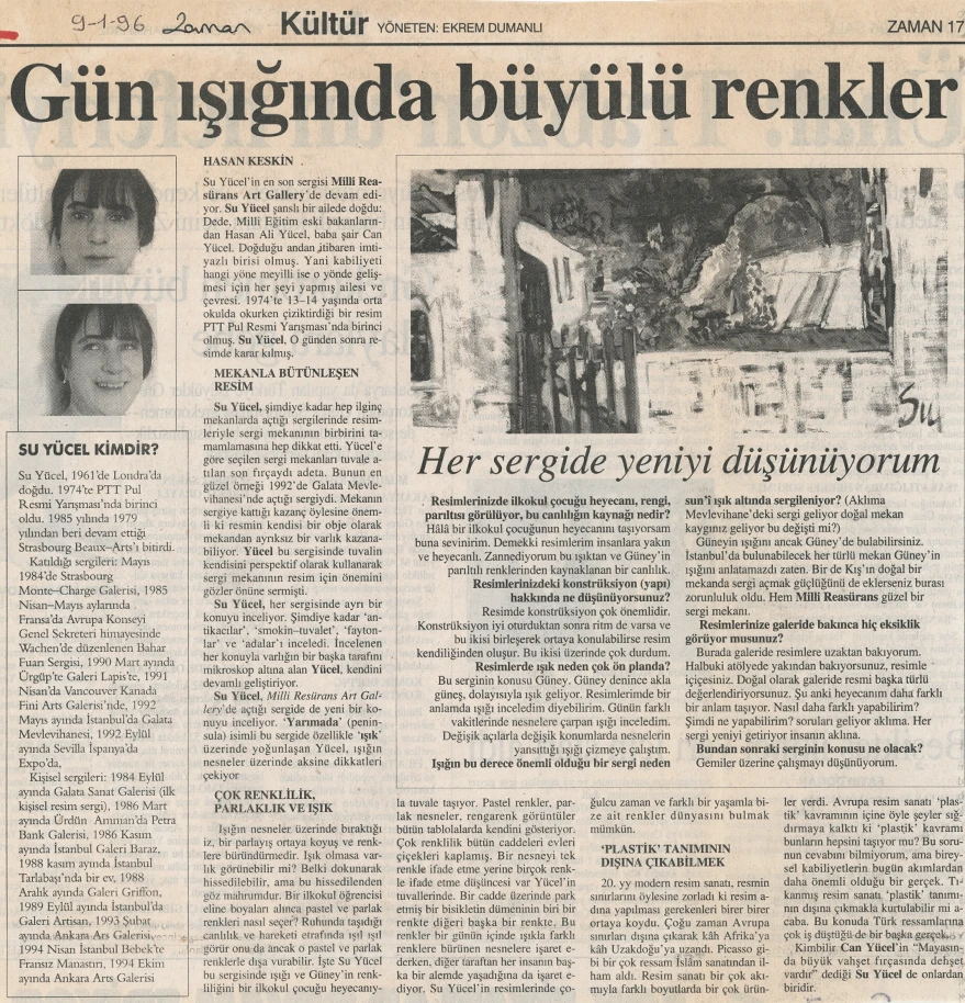 Su Yücel’in resimlerinde, otlara uzanmış mutlu kediler, tuvale boydan boya yayılan kır çiçekleri, yeşillikler arasına saklanmış köy kahveleri Güney’in sıcak renklerini taşıyor. Su Yücel, sert fırça darbeleriyle boyadığı tuvallerde büyük bir renk cümbüşü yaratıyor. Su Yücel’in ressamlığına ilişkin babası Can Yücel, “Mayasında büyük vahşet, fırçasında dehşet vardır” diyor.