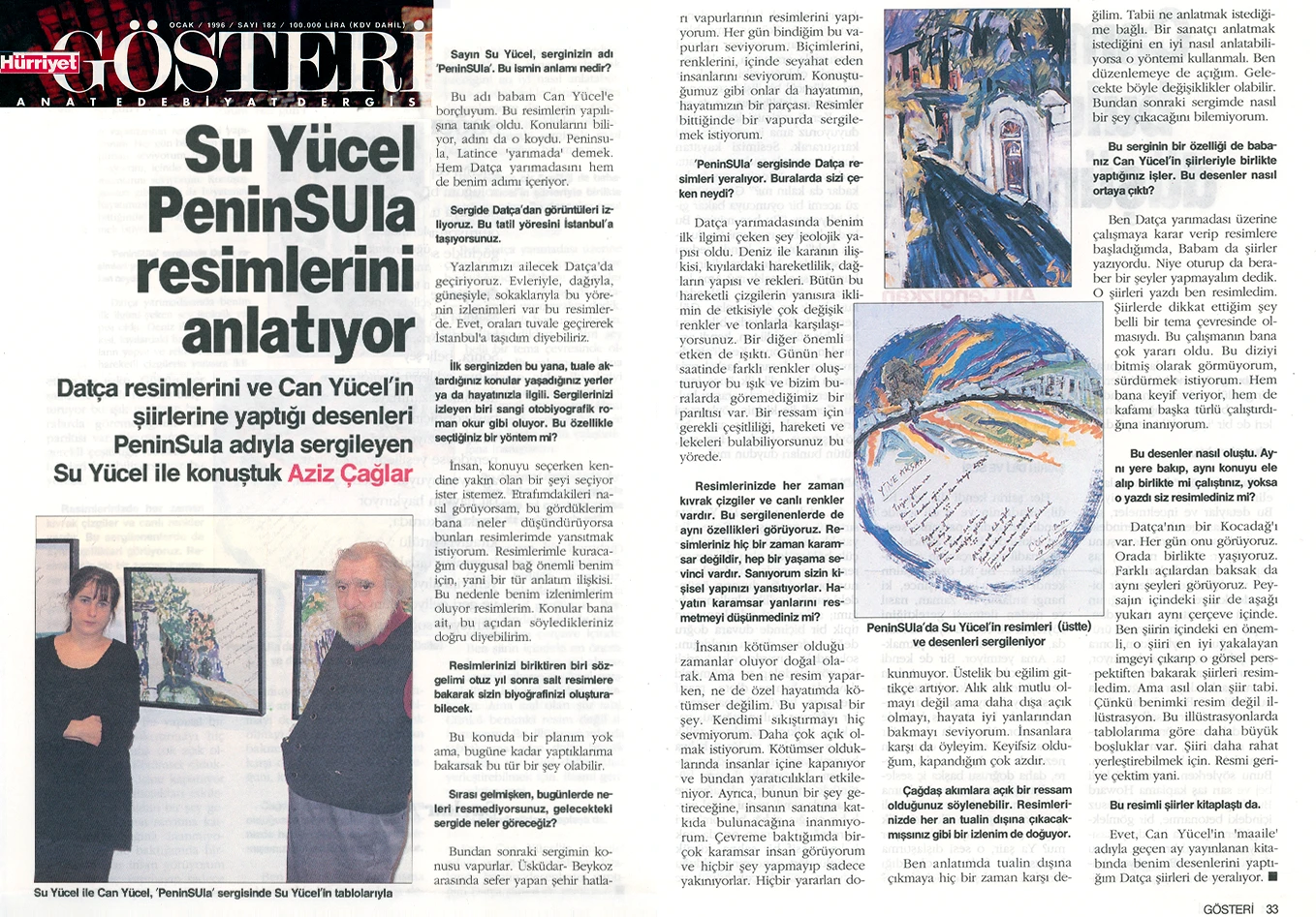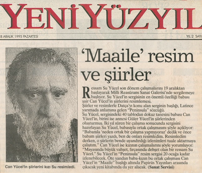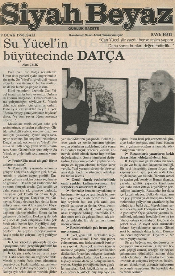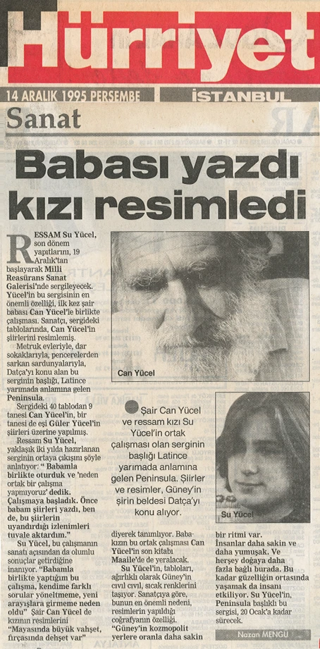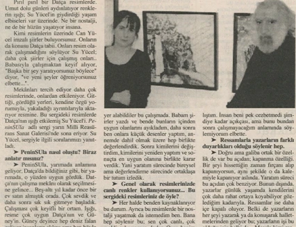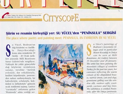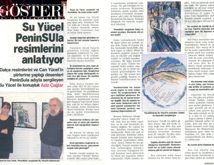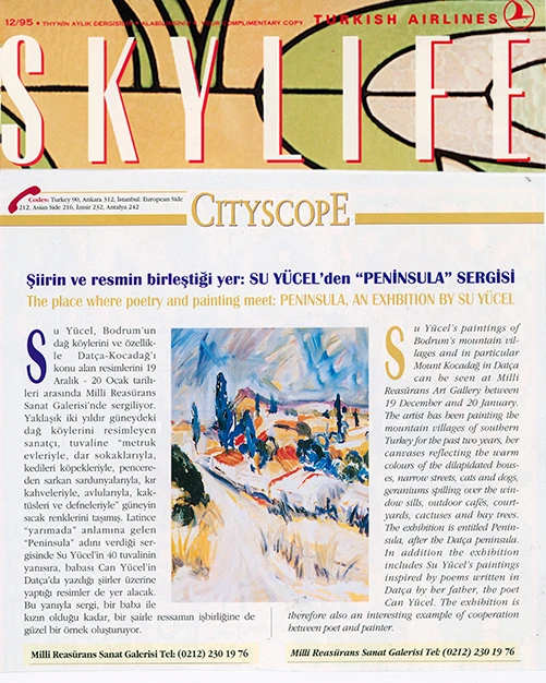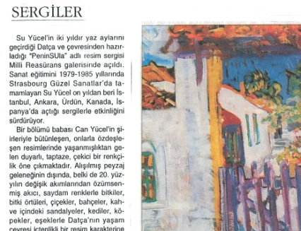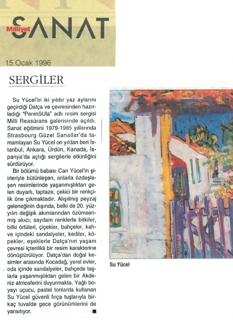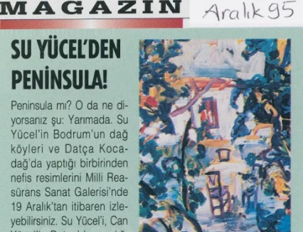 Su Yücel’in resim sergisi, Latince’de “yarımada” anlamına gelen “Peninsula” adını taşıyor. Sanatçı, Bodrum’un dağ köylerini ve özellikle Datça–Kocadağ’ı konu aldığı sergisine ilişkin olarak şunları söylüyor: “Metruk evleriyle, dar sokaklarıyla, sokak köpekleriyle, kedileriyle, keçileriyle, pencereden sarkan sardunyalarıyla, kahvehaneleriyle, avlularıyla, süpürgeleriyle, kaktüsleriyle, defneleriyle, su naneleriyle, sepetleriyle, bitki örtüsüyle, coğrafyasıyla, gündüzüyle gecesiyle Peninsula’nın bende bırakmış olduğu izlenimleri sergiliyorum.”