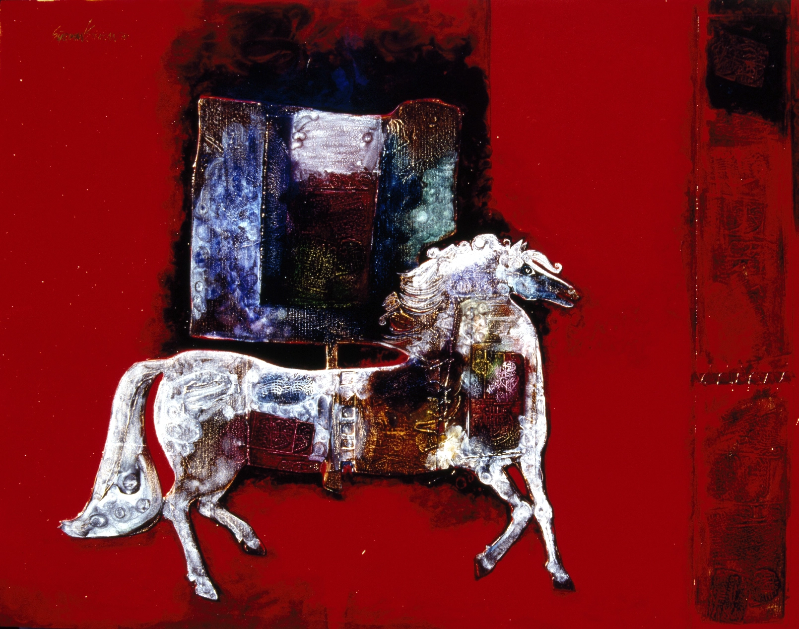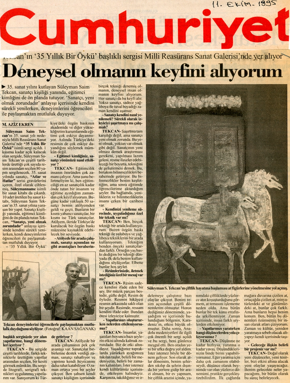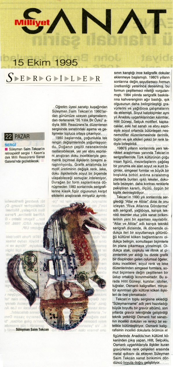 Yaklaşık 8 yıldır “Atlar” serisi üzerine çalışan ve gerek gravür ve litografi gerekse suluboya ve yağlıboya teknikleriyle bu tema etrafında çok sayıda resim üreten sanatçı, kaligrafiyi bir iç desen malzemesi olarak kullanarak resim yüzeyinde oldukça zengin bir doku yaratıyor. “Atlar” serisinde zaman zaman minyatürle, Anadolu ve Osmanlı kültürüyle bağlar kuran sanatçı, bu seriden seçtiği bazı örnekleri “Süleymanname”si tamamen Osmanlı geleneğine dayalı bir cilt, kapak ve sayfa tasarımıyla gerçekleştirildi. Sanatçıyı konu alan Osmanlıca yazıların ve “Atlar” serisinden 30 adet resmin yer aldığı -tezhiple bezenmiş- kitapta, hattat Emin Barın tarafından yazılmış Süleyman Saim Tekcan tuğrası da bulunuyor.
