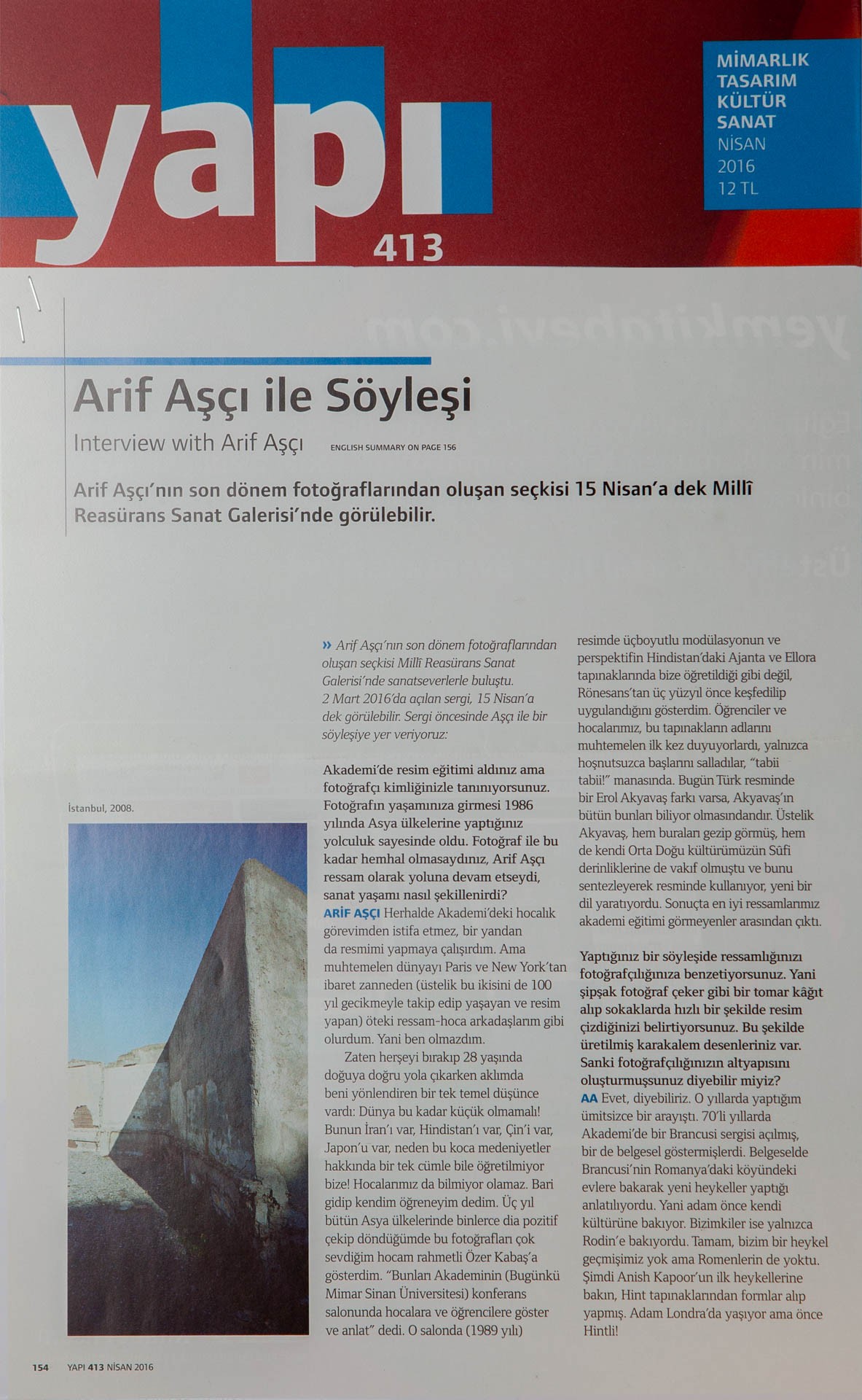 Arif Aşçı’nın “Yelkovan” adını verdiği sergisi, son beş yıllık bir sürecin sonunda ortaya çıkan fotoğraflarında, her gün, her an, bakıp, dikkat etmediğimiz şeylerin birbirleriyle kurdukları gizli görsel bağlantıların sırlarını açıklamaya çalışıyor. Bir kaç dakika sonra, görsel hafızalarımızdan sonsuza kadar silinip gidecek olan renkli bir ışık hüzmesi, sayısız tesadüflerin sonucu, ait olduğu doğal mekanından kopartılıp beklenmedik bir şekilde bir araya gelmiş eşyalara şiirsel bir gizem yüklüyor. Bir formun diğeriyle ilişkiye geçtiği kırılgan bir bakış açısı, Pompei'nin kırmızısı ve Erken Rönesans duvar resimlerinin pastel tonlarıyla yıkanarak, bize en sıradan bir öğle sonu ışığında bile, ne kadar zengin bir görsel deneyimle göz göze gelebileceğimizi anımsatıyor. Arif Aşçı, ilk anda çok basit görünen bu kompozisyonlarda bakmak ve görmek kavramlarına kendi gözünden yeni kişisel bir yorum getiriyor.