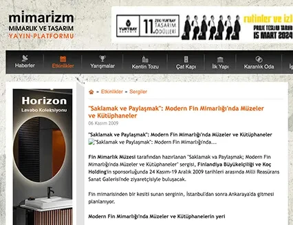 The exhibition "Store and Share," prepared under this main theme, presents a section of Finnish architecture and will be displayed in İstanbul after being exhibited at the Venice Architecture Biennale in 2008. Organized by the Finnish Architecture Museum, the "Museums and Libraries in Modern Finnish Architecture" exhibition can be visited at the Millî Reasürans Art Gallery in İstanbul between November 24 and December 19, 2009, with the sponsorship of the Finnish Embassy and Koç Holding.