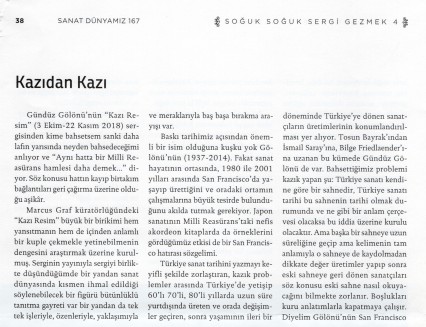 Serginin Küratörü Marcus Graf, izleyiciler için sergi üzerine şu değerlendirmede bulunmakta: “Kazı Resim, Gündüz Gölönü’nün 1960’ların sonundan 1990’ların ortasına kadar ürettiği baskı işlerine odaklanıyor. Bu retrospektif sergi, sanatçının süsleme ile anlatı, gelenek ile çağdaşlık, geleneksel İslam sanatı ile Minimalizm, Op-Art gibi Batı’daki modern hareketlerde bulunan dekoratif unsurları birbirine nasıl bağladığına dair muazzam bir hikâye anlatıyor. Sanatçının eserleri kültürler ötesi, çoğulcu ve çoklu nitelikleri sayesinde kültürel hegemonya ve üstünlüğün her türlüsüne karşı çıkıyor. Gündüz Gölönü’nün oluşturduğu külliyat, görsel sanatlar ile kültürel ifadelerin çeşitli biçimleri arasında köprüler kurmayı hedefleyen, bitmek tükenmek bilmez bir macerayı içeriyor. Burada semboller ve dokular, sözcükler ve süslemeler, figürler ve soyutlamalar, başka dünyaların dilleri yekpare bir bütüne dönüşüyor. Bu bağlamsal boyut, Gölönü’nün eserlerine sanatın ve estetiğin sınırlarını aşan bir önem kazandırıyor çünkü sanatçı, içinde yaşadığımız ayrı cinsten gerçeklikleri eleştirel bakışla gözler önüne sererken bilgi üretimi için de alternatif yollar öneriyor. Gölönü’nün külliyatı işte bu nedenle sanattaki postmodern yaklaşımın erken dönem örneklerindendir. Kültürler ötesi, çoğulcu ve çoklu niteliklerinin yanı sıra postmodernizmin farklılık temelindeki eleştirisinin bilinciyle sanatçının eserleri, kültürel hegemonya ve üstünlüğün her türlüsüne karşı çıkar.”